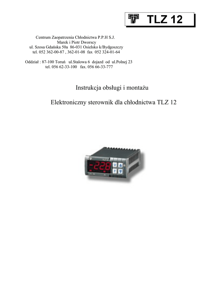 Centrum Zaopatrzenia Chłodnictwa P.P.H S.J. Marek i Piotr Dworscy ul. Szosa Gdańska 50a 86-031 Osielsko k/Bydgoszczy tel. 052 362-00-87 , 362-01-08 fax 052 324-01-64 Oddział : 87-100 Toruń ul.Stalowa 6 dojazd od ul.Polnej 23 tel. 056 62-33-100 fax. 056 66-33-777 Instrukcja obsługi i montażu Elektroniczny sterownik dla chłodnictwa TLZ 12 SŁOWO WSTĘPNE Niniejsza instrukcja zawiera informacje potrzebne zarówno do odpowiedniego zainstalowania produktu, jak i wskazówki do jego konserwacji i użycia. Dlatego zalecamy poświęcić szczególną uwagę następnym akapitom. Niniejsza instrukcja została przygotowana z należytą uwagą i Centrum Zaopatrzenia Chłodnictwa nie będzie ponosić odpowiedzialności za błędy wynikające z jej użytkowania. To samo dotyczy wszystkich osób i firm biorących udział w wydaniu instrukcji. Niniejszy dokument jest wyłączną własnością Centrum Zaopatrzenia Chłodnictwa i nie wyraża się zgody na jego kopiowanie lub rozpowszechnianie, nawet częściowo, bez jednoznacznej autoryzacji. Centrum Zaopatrzenia Chłodnictwa zastrzega sobie prawo do wprowadzenia jakichkolwiek formalnych i użytkowych zmian kiedykolwiek i bez powiadomienia. 1 OPIS PRODUKTU 1.1 OPIS OGÓLNY Model TLZ 12 jest cyfrowym sterownikiem wyposażonym w mikroprocesor i jest zazwyczaj wykorzystywany razem z aplikacjami chłodniczymi posiadającymi system regulacji temperatury typu ON/OFF (włączony/wyłączony) i regulację rozmrażania, która może być definiowana każdorazowo lub poprzez zatrzymywanie pracy sprężarki. Sterownik posiada do 2 przekaźnikowych gniazd wyjścia, jedno gniazdo wejścia dla sond temperatury typu PTC lub NTC i cyfrowe gniazdo wejścia. Wszystkie gniazda można dowolnie konfigurować. Obydwa gniazda mogą być wykorzystane do kontroli sprężarki i urządzenia regulującego temperaturę (OUT) lub alarmu (AL.).Sterownik jest wyposażony w 4 przyciski programowania, czterocyfrowy wyświetlacz i 3 diody sygnalizacyjne. Sterownik posiada także wbudowany brzęczyk, który ostrzega o alarmie. 1.2 OPIS PRZEDNIEGO PANELU 1 – Przycisk P: Służy do ustawiania wartości i programowania parametrów funkcyjnych. 2 – Przycisk DÓŁ: Służy do zmniejszania ustawianych wartości i wyboru parametrów. 3 – Przycisk GÓRA/DEFROST (ROZMRAŻANIE): Służy do zwiększania ustawianych wartości, do wybierania parametrów i aktywowania rozmrażania ręcznego. 4 – Przycisk U: Dzięki parametrowi „USrb” może być zaprogramowany do włączania i wyłączania urządzenia. W trybie parametrów „ukrytych” może zmieniać status widoczności parametrów. 5 – Dioda SET: pokazuje, że w gnieździe wejścia jest włączona funkcja programowania i zaawansowanie procesu programowania. Służy również do wskazywania stanu wstrzymania. 6 – Dioda OUT: pokazuje aktualny stan sprężarki (lub urządzenia kontrolującego temperaturę): włączona (świecenie), wyłączona (dioda nie świeci się) lub stan wstrzymania (miganie). 6 – Dioda DEF: sygnalizuje proces rozmrażania (świecenie) lub skraplania (miganie) wyłączone (dioda nie świeci się) lub stan wstrzymania (miganie). 9 – Dioda AL: pokazuje aktualny status alarmu: włączony (świecenie), wyłączony (dioda nie świeci się) lub wyciszenie (miganie). 2. PROGRAMOWANIE 2.1 PROGRAMOWANIE USTALONYCH WARTOŚCI Wciśnij przycisk P i puść, a w wyświetlacz pokaże wartość SP zamiennie z ustawioną wartością. By zmienić wartość wciśnij przycisk GÓRA, by wartość zwiększyć, i DÓŁ, by ją zmniejszyć. Przyciski te zwiększają i zmniejszają wartości stopniowo, lecz jeżeli przycisk zostanie przytrzymany dłużej niż sekundę wartości będą się zmieniać szybciej, a po dwóch sekundach prędkość zmiany wzrośnie jeszcze bardziej by ułatwić szybkie dotarcie do wyższych wartości. Funkcję ustawiania zostaje wyłączona przez wciśnięcie przycisku P lub automatycznie po 15 sekundach, gdy żaden z przycisków nie zostanie użyty. 2.2 PROGRAMOWANIE PARAMETRÓW By uzyskać dostęp do parametrów funkcyjnych urządzenia należy nacisnąć przycisk P i przytrzymać go przez około 5 sekund, aż zapali się dioda LED, na wyświetlaczu pojawi się kod identyfikujący pierwszy parametr. Poprzez użycie przycisków GÓRA/DÓŁ można wybrać parametr, a naciśnięcie przycisku P spowoduje, że wyświetlacz pokaże na zmianę kod parametru i jego wartość zmienianą przyciskami GÓRA/DÓŁ. Po wybraniu pożądanej wartości należy ponownie wcisnąć przycisk P: nowa wartość zostanie zapamiętana, a wyświetlacz pokaże jedynie kod parametru. Używając przycisków GÓRA/DÓŁ można wybrać inny parametr i zmienić go w ten sam sposób. By wyłączyć funkcję programowania należy poczekać 20 sekund lub przytrzymać przycisk GÓRA lub DÓŁ, aż funkcja zostanie zamknięta. 1 2.3 ZABEZPIECZANIE PARAMETRÓW Z UŻYCIEM HASŁA Urządzenie posiada funkcję zabezpieczania parametrów przy użyciu hasła, które może być indywidualnie zdefiniowane poprzez parametr „PASS”. W celu uaktywnienia takiego zabezpieczenia należy wprowadzić numer hasła do parametru „PASS” Kiedy zabezpieczenie jest włączone należy nacisnąć przycisk P, by uzyskać dostęp do parametrów, i przytrzymać go przez około 5 sekund, aż zapali się dioda SET, a wyświetlacz pokaże: „0”. Następnie należy ustawić numer hasła przy pomocy przycisków GÓRA/DÓŁ i wcisnąć przycisk P. Jeżeli hasło jest poprawne wyświetlacz pokaże kod identyfikujący pierwszy parametr i będzie możliwe zaprogramowanie urządzenia w taki sam sposób, jaki został opisany w poprzednim dziale. Zabezpieczenie z użyciem hasła może zostać wyłączone przez wprowadzenie parametru „PASS” = OFF. 2.4 POZIOMY PROGRAMOWANIA PARAMETRÓW Urządzenie posiada dwa poziomy programowania parametrów. Dostęp do pierwszego poziomu (parametry „widoczne”) można uzyskać dzięki procedurze opisanej powyżej (powyżej hasłe