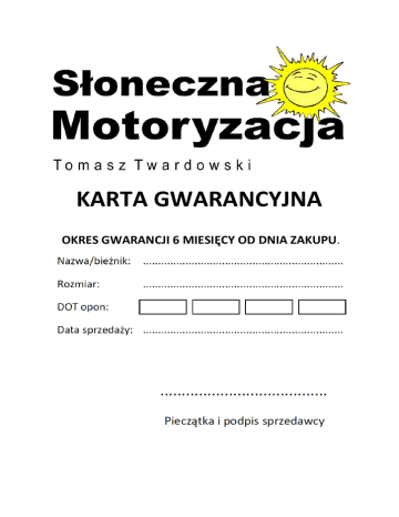 KARTA GWARANCYJNA OKRES GWARANCJI 6 MIESIĘCY OD DNIA ZAKUPU. Ogólne warunki gwarancji 1. Przedmiotem gwarancji są opony osobowe, dostawcze, motocyklowe, terenowe zwane dalej wyrobami. 2. Gwarancją nie są objęte wyroby uszkodzone wskutek: a) używania niezgodnie z przeznaczeniem i/lub parametrami technicznymi, b) nieodpowiedniego montażu lub demontażu , c) eksploatacji nadmiernie obciążonego pojazdu, przewyższającego maksymalną nośność danej opony, d) jazdy z nadmierną szybkością, przewyższającą maksymalną prędkość odpowiednią dla danej opony, e) złego stanu technicznego pojazdu, w tym nieprawidłowej geometrii, zbieżności kół, wadliwych, uszkodzonych elementów zawieszenia, f) eksploatacji z nieprawidłowym ciśnieniem kół, g) uszkodzeń mechanicznych, w tym spowodowanych uderzeniem barkiem lub bokiem opony, najechaniem na krawężnik, wyrwę w jezdni itp. przecięć i przebić, h) nieprawidłowej techniki jazdy, a w szczególności gwałtownego hamowania, przyśpieszania oraz jazdy z zablokowanymi kołami i) szybkiego lub nierównomiernego zużycia bieżnika w tym tzw. „poząbkowania” j) odłupania, wyszarpania gumy bieżnika i innego umyślnego działania powodującego uszkodzenie opony, k) naturalnego procesu starzenia się opony, l) nadmiernego zużycia wynikającego z eksploatacji pojazdu w ekstremalnych warunkach drogowych i pogodowych oraz użycia opon w zawodach sportowych lub innych wydarzeniach mających cechy współzawodnictwa sportowego. 3. Gwarancja nie obejmuje rekompensaty za brak opony zapasowej w pojeździe, utratę czasu, za czasową niesprawność pojazdu, niewygodę oraz związane ze założeniem reklamacji niedogodności lub koszty. Zasady przyjmowania reklamacji 1. Wadliwy wyrób należy dostarczyć do miejsca zakupu wraz z kartą gwarancyjną. 2. Do reklamacji należy dołączyć wypełniony protokół reklamacyjny dostępny w serwisie lub na naszej stronie internetowej www.slonecznamotoryzacja.pl 3. Reklamacja powinna być rozpatrzona w ciągu 30 dni roboczych, w szczególnych przypadkach okres ten może się wydłużyć. 4. Wyrób powinien mieć czytelny numer DOT Zasady rozliczania reklamacji 1. W przypadku uznania reklamacji wyrób przechodzi na własność Gwaranta a Użytkownik otrzymuje rekompensatę w wysokości odpowiadającej pozostałej użytecznej części opony. 2. Procentową wielkość rekompensaty oblicza się wg poniższego wzoru A= (B-1,6mm):(C-1,6mm)x100% gdzie: A – procentowa wielkość rekompensaty B – Głębokość rzeźby reklamowanej opony (mm) (do kalkulacji przyjmuje się najniższe miejsce) C – Głębokość rzeźby bieżnika nowej opony (mm) 3. Nieuznane reklamacje klient w terminie do 30 dni od otrzymania decyzji może odebrać osobiście lub za pośrednictwem kuriera na własny koszt. 4. W przypadku braku decyzji w wyżej wymienionym terminie opona zostanie zutylizowana na koszt gwaranta. 5. Od decyzji gwaranta o uznaniu bądź nieuznaniu reklamacji nie przysługuje odwołanie do Gwaranta.