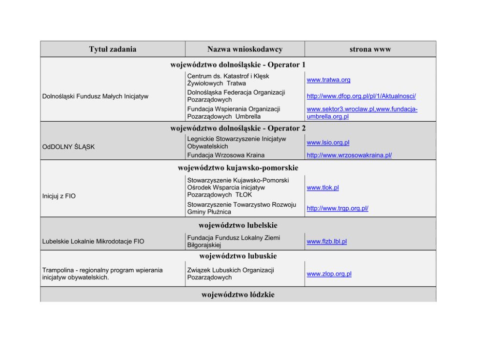 Tytuł zadania Nazwa wnioskodawcy strona www województwo dolnośląskie - Operator 1 Dolnośląski Fundusz Małych Inicjatyw Centrum ds. Katastrof i Klęsk Żywiołowych Tratwa Dolnośląska Federacja Organizacji Pozarządowych Fundacja Wspierania Organizacji Pozarządowych Umbrella www.tratwa.org http://www.dfop.org.pl/pl/1/Aktualnosci/ www.sektor3.wroclaw.pl,www.fundacjaumbrella.org.pl województwo dolnośląskie - Operator 2 OdDOLNY ŚLĄSK Legnickie Stowarzyszenie Inicjatyw Obywatelskich Fundacja Wrzosowa Kraina www.lsio.org.pl http://www.wrzosowakraina.pl/ województwo kujawsko-pomorskie Inicjuj z FIO Stowarzyszenie Kujawsko-Pomorski Ośrodek Wsparcia inicjatyw Pozarządowych TŁOK www.tlok.pl Stowarzyszenie Towarzystwo Rozwoju Gminy Płużnica http://www.trgp.org.pl/ województwo lubelskie Lubelskie Lokalnie Mikrodotacje FIO Fundacja Fundusz Lokalny Ziemi Biłgorajskiej www.flzb.lbl.pl województwo lubuskie Trampolina - regionalny program wpierania inicjatyw obywatelskich. Związek Lubuskich Organizacji Pozarządowych województwo łódzkie www.zlop.org.pl Grant na lepszy start Stowarzyszenie Lokalna Grupa Działania www.polcentrum.pl POLCENTRUM Centrum Promocji i Rozwoju Inicjatyw http://www.opus.org.pl/ Obywatelskich OPUS województwo małopolskie Fundusz Inicjatyw Obywatelskich - Małopolska Lokalnie Fundacja Biuro Inicjatyw Społecznych Stowarzyszenie Forum Oświatowe KLUCZE Fundacja Sztuki, Przygody i Przyjemności ARTS Babiogórskie Stowarzyszenie Zielona Linia www.bis-krakow.pl http://www.forumoswiatowe.com.pl/news.php www.arts-fun.pl www.zielonalinia.org.pl województwo mazowieckie Fundusz Inicjatyw Obywatelskich - Mazowsze Lokalnie Fundacja Fundusz Współpracy Stowarzyszenie Europa i My Stowarzyszenie Biuro Obsługi Ruchu Inicjatyw Społecznych BORIS www.cofund.org.pl www.europaimy.org http://boris.org.pl/ województwo opolskie Kierunek FIO Opolskie Centrum Wspierania Inicjatyw Pozarządowych www.ocwip.pl Stowarzyszenie Lokalna Grupa Działania http://www.dolinastobrawy.pl/ Dolina Stobrawy województwo podkarpackie Akademia Aktywnych Obywateli - Podkarpackie Inicjatywy Lokalne Stowarzyszenie Dębicki Klub Biznesu Fundacja GENERATOR INSPIRACJI www.dkb.info.pl http://www.fgi.org.pl/ Lokalna Grupa Działania Stowarzyszenie www.lgdnisko.pl Partnerstwo dla Ziemi Niżańskiej Fundacja Fundusz Lokalny SMK www.fundacjasmk.pl województwo podlaskie Podlaski Pozarządowy Fundusz Mikrodotacji Fundacja Forum Inicjatyw Rozwojowych www.fir.org.pl województwo pomorskie Pomorski aktywator społeczny - małe inicjatywy, duże zmiany! Centrum Inicjatyw Obywatelskich Stowarzyszenie EDUQ Fundacja Pokolenia Fundacja Rozwoju Lokalnego PARASOL Regionalne Centrum Informacji i Wspomagania Organizacji Pozarządowych Fundacja Lokalna Grupa Działania Naszyjnik Północy Stowarzyszenie Morena www.cio.slupsk.pl www.eduq.pl www.fundacjapokolenia.pl www.fundacjaparasol.org www.fundacjarc.org.pl www.lgdnp.org.pl http://www.morena.org.pl/news.php województwo śląskie Fundusz Inicjatyw Obywatelskich - Śląskie Lokalnie Centrum Rozwoju Inicjatyw Społecznych www.cris.org.pl CRIS Fundusz Lokalny Ramża http://www.ramza.org/aktualnosci/ województwo świętokrzyskie Świętokrzyski Fundusz Młodych Inicjatyw. Wzmacnianie oddziaływania inicjatyw lokalnych poprzez animację oraz udzielanie małych grantów. Stowarzyszenie Integracja i Rozwój www.sir.com.pl województwo warmińsko-mazurskie Warmia Mazury Lokalnie Lokalna Grupa Działania Warmiński Zakątek Nidzicki Fundusz Lokalny Ełckie Stowarzyszenie Aktywnych STOPA Stowarzyszenie Pomocy Dzieciom i Młodzieży Stowarzyszenie PRZYSTAŃ www.warminskizakatek.com.pl http://www.funduszlokalny.nidzica.pl/ www.ecop.elk.pl www.spdim.pl, www.przystan.ilawa.pl województwo wielkopolskie Wielkopolska Wiara Aktywnie Działa Stowarzyszenie Centrum Promocji i http://www.pisop.org.pl Rozwoju Inicjatyw Obywatelskich PISOP województwo zachodniopomorskie MIKRODOTACJE Małe Inicjatywy Lokalne Koszalińska Agencja Rozwoju Regionalnego S.A. www.karrsa.pl