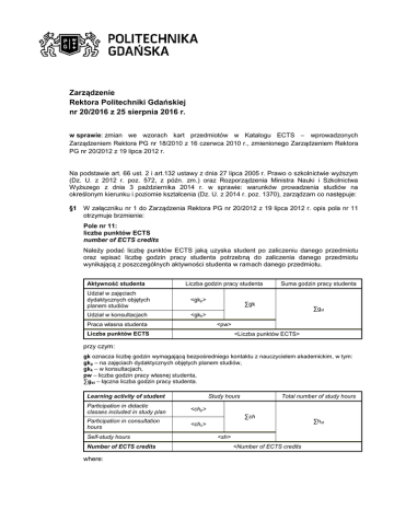 Zarządzenie Rektora Politechniki Gdańskiej nr 20/2016 z 25 sierpnia 2016 r. w sprawie: zmian we wzorach kart przedmiotów w Katalogu ECTS ‒ wprowadzonych Zarządzeniem Rektora PG nr 18/2010 z 16 czerwca 2010 r., zmienionego Zarządzeniem Rektora PG nr 20/2012 z 19 lipca 2012 r. Na podstawie art. 66 ust. 2 i art.132 ustawy z dnia 27 lipca 2005 r. Prawo o szkolnictwie wyższym (Dz. U. z 2012 r. poz. 572, z późn. zm.) oraz Rozporządzenia Ministra Nauki i Szkolnictwa Wyższego z dnia 3 października 2014 r. w sprawie: warunków prowadzenia studiów na określonym kierunku i poziomie kształcenia (Dz. U. z 2014 r. poz. 1370), zarządzam co następuje: §1 W załączniku nr 1 do Zarządzenia Rektora PG nr 20/2012 z 19 lipca 2012 r. opis pola nr 11 otrzymuje brzmienie: Pole nr 11: liczba punktów ECTS number of ECTS credits Należy podać liczbę punktów ECTS jaką uzyska student po zaliczeniu danego przedmiotu oraz wpisać liczbę godzin pracy studenta potrzebną do zaliczenia danego przedmiotu wynikającą z poszczególnych aktywności studenta w ramach danego przedmiotu. Aktywność studenta Liczba godzin pracy studenta Udział w zajęciach dydaktycznych objętych planem studiów <gkp> Udział w konsultacjach <gkk> Praca własna studenta Suma godzin pracy studenta ∑gk ∑gst <pw> Liczba punktów ECTS <Liczba punktów ECTS> przy czym: gk oznacza liczbę godzin wymagającą bezpośredniego kontaktu z nauczycielem akademickim, w tym: gkp – na zajęciach dydaktycznych objętych planem studiów, gkk – w konsultacjach, pw – liczba godzin pracy własnej studenta, ∑gst – łączna liczba godzin pracy studenta. Learning activity of student Study hours Participation in didactic classes included in study plan <chp> Participation in consultation hours <chc> Self-study hours Number of ECTS credits where: Total number of study hours ∑ch <sh> <Number of ECTS credits ∑hst ch (contact hours) – hours that require direct contact with an academic teacher, which include: chp – didactic classes chc – participation in consultation hours sh – self-study hours ∑hst – total number of study hours. §2 W załączniku nr 1 do Zarządzenia Rektora PG nr 20/2012 z 19 lipca 2012 r. opis pola nr 20 otrzymuje brzmienie: Pole nr 20: formy zajęć i metody nauczania lesson type and method of instruction W tym polu należy podać formy zajęć realizowane w ramach danego przedmiotu, z uwzględnieniem kształcenia na odległość, a także liczbę godzin poszczególnych form zajęć oraz całkowitą liczbę godzin zajęć dydaktycznych objętych planem studiów w semestrze. Forma zajęć Wykład Ćwiczenia Laboratorium Projekt Seminarium Liczba godzin zajęć <gk1> <gk2> <gk3> <gk4> <gk5> Suma godzin dydaktycznych w semestrze, objętych planem studiów ∑gkp w tym kształcenie na odległość: gkKnO. Lesson type Number of study hours Total number of study hours per semester included in study plan Lecture Tutorial Laboratory Project Seminar <ch1> <ch2> <ch3> <ch4> <ch5> ∑chp e-learning hours included: che. §3 Dane stałe w kartach przedmiotów, tj. opisowe oraz liczbowe wynikające bezpośrednio z obowiązujących programów studiów, wprowadzane są w aplikacji Programy kształcenia lub eDziekanat, a ewentualnie uzupełniane są bezpośrednio w danej karcie przedmiotu przez koordynatora ds. katalogu ECTS bądź inną osobę uprawnioną. §4 Traci moc załącznik nr 2 do Zarządzenia Rektora PG nr 20/2012 z 19 lipca 2012 r. §5 Zarządzenie wchodzi w życie od roku akademickiego 2016/2017. --------------------------------------------prof. Henryk Krawczyk