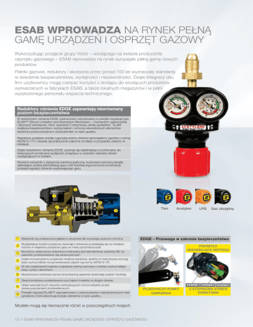 ESAB WPROWADZA NA RYNEK PEŁNĄ GAMĘ URZĄDZEŃ I OSPRZĘT GAZOW< Wykorzystując przejęcie grupy Victor – wiodącego na świecie producenta enta osprzętu gazowego – ESAB wprowadza na rynek europejski pełną gamę mę nowych produktów. Palniki gazowe, reduktory i akcesoria przez ponad 100 lat wyznaczały standardy w dziedzinie bezpieczeństwa, wydajności i niezawodności. Dzięki integracji gracji obu firm użytkownicy mogą czerpać korzyści z dostępu do wiodących produktów duktów wytwarzanych w fabrykach ESAB, a także lokalnych magazynów i w pełni wyszkolonego personelu wsparcia technicznego. Reduktory ciśnienia EDGE zapewniają niezrównany poziom bezpieczeństwa W reduktorach ciśnienia EDGE zastosowano wbudowaną w pokrętło regulację typu SLAM™ (Shock Limitation and Absorption Mechanism – mechanizm ograniczania i absorpcji wstrząsów), który wytwarza 3-stopniową „strefę zgniatania”. SLAM zwiększa bezpieczeństwo, wytrzymałość i ochronę wewnętrznych elementów reduktora przed poważnym uszkodzeniem w razie upadku. Reduktory poddane zostały rygorystycznemu testowi samozapłonu zgodnie z normą ASTM G-175 i okazały się praktycznie odporne na błędy w przypadku zapłonu w instalacji. Dzięki reduktorom ciśnienia EDGE uzyskuje się stabilniejszą w porównaniu do tradycyjnych konstrukcji wydajność przepływu w szerokim zakresie ciśnień występujących w butlach. Wyraźne wskaźniki z ulepszoną warstwą graficzną, kodowane barwnie pokrętła ułatwiające szybką identyfikację gazu oraz bardziej ergonomiczna konstrukcja pokręteł regulacji ciśnienia wypływającego gazu. 5 1 8 2 3 4 7 Tien 9 Acetylen LPG Gaz obojętny 6 1 Wskaźniki są umieszczone głębiej w obudowie dla wyższego poziomu ochrony. 2 Wydajniejsze ścieżki przepływu wewnątrz reduktora przekładają się na mniejsze różnice w natężeniu przepływu gazu w miarę opróżniania butli. 3 Na króćcu wejściowym reduktora montowany jest standardowo spiekany filtr, by zapobiec przedostawaniu się zanieczyszczeń. 4 Dzięki innowacyjnemu projektowi wnętrza reduktora, spełnia on restrykcyjne wymogi testu wytrzymałości na sprowokowany zapłon wg normy ASTM G-175. 5 W celu zwiększenia trwałości urządzenia osłonę wykonano z bardzo wytrzymałego stopu cynku z aluminium. 6 Neoprenowa membrana wzmocniona tkaniną zapewnia doskonałą czułość i kontrolę. 7 Zespół podstawy przetestowano pod kątem trwałości w długim okresie. 8 Układ wewnętrznych otworów wentylacyjnych chroni reduktor przed zanieczyszczeniami środowiskowymi. 9 Pokrętło regulacji SLAM™ zaprojektowano z zastosowaniem wielostopniowych stref zgniatania, które absorbują energię uderzenia w razie upadku. EDGE – Przewaga w zakresie bezpieczeństwa POKRĘTŁO ABSORBUJĄCE WSTRZĄS STOPIEŃ 1 STOPIEŃ 2 STOPIEŃ 3 POJEDYNCZY PUNKT UDERZENIA Modele mogą się nieznacznie różnić w poszczególnych krajach. 12 // ESAB WPROWADZA PEŁNĄ GAMĘ URZĄDZEŃ OSPRZĘTU GAZOWEGO 3-STOPNIOWA STREFA ZGNIATANIA PALNIKI Z SERII 400 Dostępne zarówno w wersji uniwersalnej, jak i zwykłej, palniki lniki z serii 400 zapewniają doskonałe pole widzenia i elegancką, a przy tym wytrzymałą konstrukcję trójrurową. Oznaczenia i kodowanie barwne pokręteł ułatwiają rozpoznanie ich przeznaczenia i upraszczają pracę dzięki wskazaniu kierunków otwierania i zamykania. Wyprofilowana rękojeść i wygodniejsze umiejscowienie dźwigni odcinającej dopływ tlenu. Uniwersalna konstrukcja systemu mieszania nadaje się do stosowania wszystkich gazów palnych (z odpowiednią dyszą). stosowani Reduktory serii G Zaprojektowane z myślą o zastosowaniach wymagających średniej wydajności, osłona wykonana z wytrzymałego stopu cechuje się dwukrotnie wyższą granicą plastyczności niż mosiądz. Dzięki kodowanym barwnie pokrętłom, korzystanie z reduktora jest prostsze, a rozpoznanie gazu zu – łatwiejsze. Rotametry z zaworem regulacyjnym Przystępne cenowo i niezawodne produktyy do spawania metodami MIG/MAG i TIG. Bulldog – palniki do ciężkich B lld l iki d i żki h zadań d ń Szczególnie wysoka wydajność (14”/350 mm) do bardzo wymagających zastosowań cięcia z użyciem propanu. Niski profil głowicy, lekka konstrukcja, siła i wytrzymałość sprawiają, że Bulldog stanowi klasę samą w sobie. ESAB.COM POZWÓL NAM POMÓC W ZNALEZIENIU PERFEKCYJNEGO DLA CIEBIE ROZWIĄZANIA SPAWALNICZEGO. SKONTAKTUJ SIĘ JUŻ DZIŚ Z PRZEDSTAWICIELEM HANDLOWYM FIRMY ESAB. 13 // ESAB WPROWADZA NA RYNEK PEŁNĄ GAMĘ URZĄDZEŃ OSPRZĘTU GAZOWEGO MANUAL PLASMA SYSTEMS ESAB WPROWADZA NA RYNEK PEŁNĄ GAMĘ URZĄDZEŃ OSPRZĘTU GAZOWEGO Zwiększ bezpieczeństwo, niezawodność i wydajność palnika do cięcia dzięki nowemu reduktorowi ESAB EDGE.