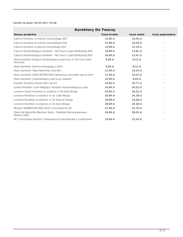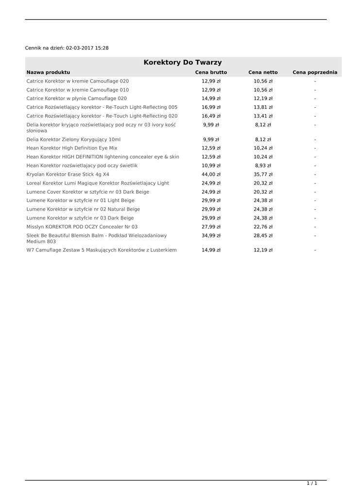 Cennik na dzień: 02-03-2017 15:28 Korektory Do Twarzy Nazwa produktu Cena brutto Cena netto Cena poprzednia Catrice Korektor w kremie Camouflage 020 12,99 zł 10,56 zł - Catrice Korektor w kremie Camouflage 010 12,99 zł 10,56 zł - Catrice Korektor w płynie Camouflage 020 14,99 zł 12,19 zł - Catrice Rozświetlający korektor - Re-Touch Light-Reflecting 005 16,99 zł 13,81 zł - Catrice Rozświetlający korektor - Re-Touch Light-Reflecting 020 16,49 zł 13,41 zł - Delia korektor kryjąco rozświetlajacy pod oczy nr 03 ivory kość słoniowa 9,99 zł 8,12 zł - Delia Korektor Zielony Korygujący 10ml 9,99 zł 8,12 zł - Hean Korektor High Definition Eye Mix 12,59 zł 10,24 zł - Hean Korektor HIGH DEFINITION lightening concealer eye & skin 12,59 zł 10,24 zł - Hean Korektor rozświetlajacy pod oczy świetlik 10,99 zł 8,93 zł - Kryolan Korektor Erase Stick 4g X4 44,00 zł 35,77 zł - Loreal Korektor Lumi Magique Korektor Rozświetlajacy Light 24,99 zł 20,32 zł - Lumene Cover Korektor w sztyfcie nr 03 Dark Beige 24,99 zł 20,32 zł - Lumene Korektor w sztyfcie nr 01 Light Beige 29,99 zł 24,38 zł - Lumene Korektor w sztyfcie nr 02 Natural Beige 29,99 zł 24,38 zł - Lumene Korektor w sztyfcie nr 03 Dark Beige 29,99 zł 24,38 zł - Misslyn KOREKTOR POD OCZY Concealer Nr 03 27,99 zł 22,76 zł - Sleek Be Beautiful Blemish Balm - Podkład Wielozadaniowy Medium 803 34,99 zł 28,45 zł - W7 Camuflage Zestaw 5 Maskujących Korektorów z Lusterkiem 14,99 zł 12,19 zł - 1/1 Powered by TCPDF (www.tcpdf.org)