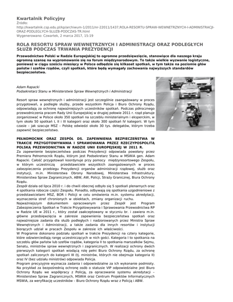 Kwartalnik Policyjny Źródło: http://kwartalnik.csp.edu.pl/kp/archiwum-1/2011/nr-22011/1437,ROLA-RESORTU-SPRAW-WEWNETRZNYCH-I-ADMINISTRACJIORAZ-PODLEGLYCH-SLUZB-PODCZAS-TR.html Wygenerowano: Czwartek, 2 marca 2017, 15:19 ROLA RESORTU SPRAW WEWNĘTRZNYCH I ADMINISTRACJI ORAZ PODLEGŁYCH SŁUŻB PODCZAS TRWANIA PREZYDENCJI Przewodnictwo Polski w Radzie Europejskiej to ogromne przedsięwzięcie, stanowiące dla naszego kraju ogromną szansę na wypromowanie się na forum międzynarodowym. To także wielkie wyzwanie logistyczne, ponieważ w ciągu sześciu miesięcy w Polsce odbędzie się kilkaset spotkań, w tym także na poziomie głów państw i szefów rządów, czyli spotkań, które będą wymagały zachowania najwyższych standardów bezpieczeństwa. Adam Rapacki Podsekretarz Stanu w Ministerstwie Spraw Wewnętrznych i Administracji Resort spraw wewnętrznych i administracji jest szczególnie zaangażowany w proces przygotowań, a podległe służby, przede wszystkim Policja i Biuro Ochrony Rządu, odpowiadają za ochronę najważniejszych uczestników spotkań. Podczas półrocznego przewodniczenia pracom Rady Unii Europejskiej w drugiej połowie 2011 r. rząd planuje zorganizować w Polsce około 350 spotkań na szczeblu ministerialnym i eksperckim, w tym około 50 spotkań I, II i III kategorii oraz około 300 spotkań IV kategorii. W tym czasie – jak szacuje MSZ – Polskę odwiedzi około 30 tys. delegatów, którym trzeba zapewnić bezpieczeństwo. PEŁNOMOCNIK ORAZ ZESPÓŁ DS. ZAPEWNIENIA BEZPIECZEŃSTWA W TRAKCIE PRZYGOTOWYWANIA I SPRAWOWANIA PRZEZ RZECZYPOSPOLITĄ POLSKĄ PRZEWODNICTWA W RADZIE UNII EUROPEJSKIEJ W 2011 R. Za zapewnienie bezpieczeństwa podczas Prezydencji odpowiada powołany przez Premiera Pełnomocnik Rządu, którym jest Podsekretarz Stanu w MSWiA gen. Adam Rapacki. Całość przygotowań koordynuje przy pomocy międzyresortowego Zespołu, w którym uczestniczą przedstawiciele wszystkich zaangażowanych w proces zabezpieczenia przebiegu Prezydencji organów administracji rządowej, służb oraz instytucji, m.in. Ministerstwa Obrony Narodowej, Ministerstwa Infrastruktury, Ministerstwa Spraw Zagranicznych, ABW, AW, Policji, Straży Granicznej, Biura Ochrony Rządu. Zespół działa od lipca 2010 r. i do chwili obecnej odbyło się 5 spotkań plenarnych oraz 4 spotkania robocze części Zespołu. Ponadto, odbywają się spotkania uzgodnieniowe z przedstawicielami MSZ, BOR i Policji w celu omówienia m.in. systemu akredytacji, wyznaczenia stref chronionych w obiektach, zmiany organizacji ruchu. Najważniejszym dokumentem opracowanym przez Zespół jest Program Zabezpieczenia Spotkań w Trakcie Przygotowywania i Sprawowania Przewodnictwa RP w Radzie UE w 2011 r., który został zaakceptowany w styczniu br. i zawiera m.in. główne przedsięwzięcia w zakresie zapewnienia bezpieczeństwa spotkań oraz najważniejsze zadania dla służb podległych i nadzorowanych przez Ministra Spraw Wewnętrznych i Administracji, a także zadania dla innych resortów i instytucji biorących udział w pracach Zespołu w zakresie ich właściwości. W Programie dokonano podziału spotkań w trakcie Prezydencji na cztery kategorie, które odzwierciedlają rangę uczestniczących w nich gości. Kategoria I to spotkania na szczeblu głów państw lub szefów rządów, kategoria II to spotkania marszałków Sejmu, Senatu, ministrów spraw wewnętrznych i zagranicznych. W realizacji ochrony dwóch pierwszych kategorii spotkań wiodącą rolę pełni Biuro Ochrony Rządu, za ochronę spotkań zaliczonych do kategorii III (tj. ministrów, których nie obejmuje kategoria II) oraz IV (bez udziału ministrów) odpowiada Policja. Program precyzyjnie wyznacza zadania i odpowiedzialne za ich wykonanie podmioty. Na przykład za bezpośrednią ochronę osób o statusie VIP odpowiedzialne jest Biuro Ochrony Rządu we współpracy z Policją, za opracowanie systemu akredytacji – Ministerstwo Spraw Zagranicznych, MSWiA oraz Centrum Projektów Informatycznych MSWiA, za weryfikację uczestników – Biuro Ochrony Rządu wraz z Policją i ABW. W ramach prac Zespołu przygotowano Koncepcję zabezpieczenia przeciwpożarowego spotkań ministerialnych. Ponadto w pięciu miastach, gospodarzach Prezydencji (Sopocie, Wrocławiu, Krakowie, Poznaniu, Warszawie) Zespół przeprowadził wizytacje w celu sprawdzenia wszystkich obiektów, w których planowane są spotkania organizowane centralnie. W każdym z województw, w których będą się odbywać spotkania, zorganizowano zespoły wojewódzkie, które ściśle współpracują z zespołem centralnym. Odbyły się także szkolenia z zakresu zapewnienia bezpieczeństwa spotkań dla przedstawicieli władz miast-gospodarzy oraz lokalnych służb w regionach, poszczególnych instytucji i ministerstw organizujących spotkania centralne oraz oficerów łącznikowych. Niezbędnym elementem zabezpieczenia spotkań jest zapewnienie służby medycznej, gotowej do interwencji w razie nagłych przypadków. Departament Zdrowia MSWiA oraz Ministerstwo Zdrowia wspólnie wypracowały standardy zabezpieczenia medycznego w oparciu o cztery kategorie spotkań wytypowanych przez Policję i BOR. Pełnomocnik Rządu za pośrednictwem Zespołu współpracuje z Biurem Bezpieczeństwa Sekretariatu Generalnego Rady UE w Brukseli. W okresie sprawowania Prezydencji Polska oddeleguje do Brukseli 13 funkcjonariuszy BOR (od 4 do 6 razy) w celu wsparcia przy zabezpieczaniu spotkań Rady Europejskiej. Pełnomocnik Rządu ds. Zapewnienia Bezpieczeństwa Prezydencji, w celu zachowania spójności realizacji wszystkich przedsięwzięć dotyczących zapewnienia zabezpieczenia spotkań podczas Prezydencji, na bieżąco monitoruje stan zaawansowania prac związanych z przygotowaniem do tego wielkiego wydarzenia. ROLA SŁUŻB PODLEGŁYCH MSWIA Policja Policja jest odpowiedzialna za zabezpieczenie akcji i operacji policyjnych w związku z zapewnieniem bezpieczeństwa spotkań kategorii III i