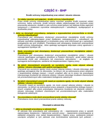 CZĘŚĆ II - BHP Środki ochrony indywidualnej oraz odzież i obuwie robocze. 1 Co należy rozumieć pod pojęciem - środki ochrony indywidualnej? Przez środki ochrony indywidualnej należy rozumieć wszelkie środki noszone( odzież ochronna, hełmy ochronne, środki ochrony układu oddechowego) lub trzymane przez pracownika akcesoria i dodatki w celu ochrony przed jednym lub większą liczbę zagrożeń związanych z działaniem czynników niebezpiecznych i szkodliwych, występujących w środowisku pracy. 2. Jakie są obowiązki pracodawcy, związane z wyposażeniem pracowników w środki ochrony indywidualnej? Pracodawca jest obowiązany dostarczyć pracownikowi nieodpłatnie środki ochrony indywidualnej zabezpieczające przed działaniem niebezpiecznych i szkodliwych dla zdrowia czynników występujących w środowisku pracy oraz informować go o sposobach posługiwania się tymi środkami. Pracodawca jest obowiązany dostarczyć pracownikowi środki ochrony indywidualnej , które spełniają wymagania dotyczące oceny zgodności z wymaganiami dyrektyw UE. 3. Kiedy pracodawca jest obowiązany dostarczyć pracownikowi nieodpłatnie odzież i obuwie robocze? Pracodawca jest obowiązany dostarczyć pracownikowi nieodpłatnie odzież i obuwie robocze (spełniające wymagania określone w Polskich Normach): -jeżeli odzież własna pracownika może ulec zniszczeniu lub znacznemu zabrudzeniu; - ze względu na wymagania technologiczne, sanitarne lub bezpieczeństwa i higieny pracy. 4. Na jakich stanowiskach pracownik, po wyrażeniu zgody, może używać własnej odzieży i obuwia roboczego, jeśli spełnia wymagania bhp? Pracownik (po wyrażeniu zgody) może używać własnej odzieży i obuwia roboczego, jeśli spełniają wymagania bhp na stanowisku, na którym nie są wykonywane prace związane z bezpośrednią obsługą maszyn i innych urządzeń albo są to prace nie powodujące intensywnego brudzenia lub skażenia odzieży i obuwia roboczego środkami chemicznymi lub promieniotwórczymi albo materiałami biologicznie zakaźnymi. 5. Na jakich stanowiskach pracownik nawet po wyrażeniu zgody, nie może używać własnej odzieży i obuwia roboczego? Pracownik, nawet po wyrażeniu zgody, nie może używać własnej odzieży i obuwia na stanowisku, na którym są wykonywane prace związane z bezpośrednią obsługą maszyn i innych urządzeń albo prace powodujące intensywne brudzenie lub skażenie odzieży i obuwia roboczego środkami chemicznymi lub promieniotwórczymi albo materiałami biologicznie zakaźnymi. 6. Czy pracodawca może zlecić pracownikowi pranie odzieży roboczej? Pracodawca może zlecić pracownikowi pranie odzieży roboczej. Obowiązki w zakresie bhp 7. Jakie są obowiązki pracodawcy w zakresie bhp? W zakresie bhp pracodawca jest zobowiązany do: - organizowania pracy w sposób zapewniający bezpieczne i higieniczne warunki pracy; - zapewnienia przestrzegania w zakładzie przepisów oraz zasad bezpieczeństwa i higieny pracy, wydawania poleceń usunięcia uchybień w tym zakresie oraz kontrolowania wykonania tych poleceń; - wykonania nakazów, wystąpień, decyzji i zarządzeń wydanych przez organy nadzoru nad warunkami pracy;- wykonania zaleceń społecznego inspektora pracy. W przypadku możliwości wystąpienia zagrożenia dla zdrowia lub życia pracodawca jest obowiązany: - niezwłocznie poinformować pracowników o tych zagrożeniach oraz podjąć działania w celu zapewnienia odpowiedniej ochrony , niezwłocznie dostarczyć pracownikom instrukcje umożliwiające, w przypadku wystąpienia bezpośredniego zagrożenia, przerwanie pracy i oddalenie się z miejsca zagrożenia w miejsce bezpieczne. W razie wystąpienia bezpośredniego zagrożenia dla zdrowia lub życia pracodawca jest obowiązany:- wstrzymać pracę i wydać pracownikom polecenie oddalenia się w miejsce bezpieczne, do czasu usunięcia zagrożenia nie wydawać polecenia wznowienia pracy. 8. Jakie obowiązki w zakresie bhp dotyczą pracownika? Podstawowym obowiązkiem pracownika w zakresie bhp jest przestrzeganie przepisów i zasad bhp. W szczególności do obowiązków pracownika należy: - znać przepisy oraz zasad bezpieczeństwa i higieny pracy, brać udział w szkoleniu i instruktażu z tego zakresu oraz poddawać się wymaganym egzaminom sprawdzającym; - wykonywać pracę w sposób zgodny z przepisami i zasadami bezpieczeństwa i higieny pracy oraz stosować się do wydanych w tym zakresie poleceń i wskazówek przełożonych; - dbać o należyty stan maszyn, urządzeń, narzędzi i sprzętu oraz o porządek i ład w miejscu pracy;stosować środki ochrony zbiorowej zgodnie z ich przeznaczeniem, a także używać przydzielone środki ochrony indywidualnej (w tym odzieży ochronnej, obuwia); poddawać się wstępnym, okresowym i kontrolnym oraz innym badaniom lekarskim i stosować się do wskazań lekarskich; - niezwłoczne zawiadomić przełożonego o zauważonym w zakładzie pracy wypadku albo zagrożeniu życia lub zdrowia ludzkiego oraz ostrzegać współpracowników, a także inne osoby znajdujące się w rejonie zagrożenia, o grożącym im niebezpieczeństwie; - współdziałać z pracodawcą i przełożonymi w wypełnianiu obowiązków dotyczących bezpieczeństwa i higieny pracy. Pracodawca jest obowiązany umożliwić pracownikom, w przypadku wystąpienia bezpośredniego zagrożenia dla ich zdrowia lub życia albo dla zdrowia lub życia innych osób, podjecie własnych działań w celu uniknięcia niebezpieczeństwa – nawet bez porozumienia z przełożonym- na miarę ich wiedzy i dostępnych środków technicznych. Pracownicy którzy podjęli takie działania nie mogą ponosić jakichkolwiek niekorzystnych konsekwencji tych działań, pod warunkiem że nie zaniedbali swoich obowiązków. 9. Jakie obowiązki w zakresie bhp dotyczą osób kierujących pracownikami? Osoba kierująca pracownikami jest zobowiązana w zakresie niezbędnym do ciążących na niej obowiązków znać p