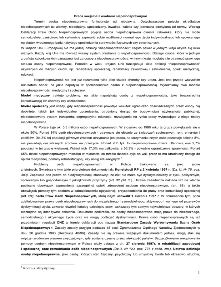 Praca socjalna z osobami niepełnosprawnymi Termin osoba niepełnosprawna funkcjonuje od niedawna. Dotychczasowe pojęcia określające niepełnosprawnych to: ułomny, niedołężny, upośledzony, inwalida, kaleka czy jednostka odchylona od normy. Według Deklaracji Praw Osób Niepełnosprawnych pojęcie osoba niepełnosprawna określa człowieka, który nie może samodzielnie, częściowo lub całkowicie zapewnić sobie możliwości normalnego życia indywidualnego lub społecznego na skutek wrodzonego bądź nabytego upośledzenia sprawności fizycznych czy psychicznych. W krajach Unii Europejskiej nie ma jednej definicji "niepełnosprawności"; często nawet w jednym kraju używa się kilku różnych. Każdy kraj Unii ma również własny system orzekania o niepełnosprawności. Dlatego osoba, która w jednym z państw członkowskich uznawana jest za osobę z niepełnosprawnością, w innym kraju mogłaby nie otrzymać prawnego statusu osoby niepełnosprawnej. Ponadto w wielu krajach Unii funkcjonuje kilka definicji "niepełnosprawności" używanych do różnych celów, np. rehabilitacji społecznej, rehabilitacji zawodowej i zatrudnienia, opieki medycznej, edukacji. Niepełnosprawność nie jest już rozumiana tylko jako skutek choroby czy urazu. Jest ona przede wszystkim rezultatem barier, na jakie napotyka w społeczeństwie osoba z niepełnosprawnością. Wyróżniamy dwa modele niepełnosprawności: medyczny i społeczny. Model medyczny traktuje problemy, na jakie napotykają osoby z niepełnosprawnością, jako bezpośrednią konsekwencję ich choroby czy uszkodzenia. Model społeczny jest wtedy, gdy niepełnosprawność powstaje wskutek ograniczeń doświadczanych przez osoby nią dotknięte, takich jak indywidualne uprzedzenia, utrudniony dostęp do budownictwa użyteczności publicznej, niedostosowany system transportu, segregacyjna edukacja, rozwiązania na rynku pracy wyłączające z niego osoby niepełnosprawne. W Polsce żyje ok. 5,5 miliona osób niepełnosprawnych. W stosunku do 1990 roku ta grupa powiększyła się o około 50%. Ponad 84% osób niepełnosprawnych - utrzymuje się głównie ze świadczeń społecznych: rent, emerytur i zasiłków. Dla 8% tej populacji głównym źródłem utrzymania jest praca, na utrzymaniu innych osób pozostaje kolejne 8%, nie posiadają oni własnych środków na przeżycie. Ponad 200 tyś. to niepełnosprawne dzieci. Stanowią one 2,7% populacji w tej grupie wiekowej. Wśród nich 17,3% ma całkowite, a 56,3% - poważne ograniczenie sprawności. Ponad 65% dzieci niepełnosprawnych mieszka w miastach, co trzecie dziecko żyje na wsi, przez to ma utrudniony dostęp do 1 opieki medycznej, pomocy rehabilitacyjnej, czy usług edukacyjnych. Problemy osób niepełnosprawnych w Polsce traktowane są jako jedne z istotnych. Świadczą o tym takie priorytetowe dokumenty jak: Konstytucji RP z 2 kwietnia 1997 r. (Dz. U. Nr 78, poz. 483). Zapewnia ona prawo do niedyskryminacji stanowiąc, że nikt nie może być dyskryminowany w życiu politycznym, społecznym lub gospodarczym z jakiejkolwiek przyczyny (art. 32 pkt. 2.). Ustawa zasadnicza nakłada też na władze publiczne obowiązek zapewnienia szczególnej opieki zdrowotnej osobom niepełnosprawnym, (art. 68), a także obowiązek pomocy tym osobom w zabezpieczeniu egzystencji, przysposobieniu do pracy oraz komunikacji społecznej (art. 69); Karta Praw Osób Niepełnosprawnych, którą Sejm uchwalił 1 sierpnia 1997 r. W dokumencie tym, poza zdefiniowaniem prawa osób niepełnosprawnych do niezależnego i samodzielnego, aktywnego i wolnego od przejawów dyskryminacji życia, zawarto również katalog dziesięciu praw, wskazując tym samym najważniejsze obszary, w których niezbędne są intensywne działania. Dokument podkreśla, że osoby niepełnosprawne mają prawo do niezależnego, samodzielnego i aktywnego życia oraz nie mogą podlegać dyskryminacji. Prawa osób niepełnosprawnych są też przedmiotem regulacji ONZ w formie deklaracji pod nazwą Standardowe Zasady Wyrównywania Szans Osób Niepełnosprawnych. Zasady zostały przyjęte podczas 48 sesji Zgromadzenia Ogólnego Narodów Zjednoczonych w dniu 20 grudnia 1993 (Rezolucja 48/96). Zasady nie są prawnie wiążącym dokumentem jednak, mogą stać się międzynarodowym prawem zwyczajowym, gdy zostaną uznane przez większość państw. Szczegółowemu uregulowaniu pomocy osobom niepełnosprawnym w Polsce służy ustawa z dn. 27 sierpnia 1997r. o rehabilitacji zawodowej i społecznej oraz zatrudnianiu osób niepełnosprawnych (Dz.U. Nr 123, poz. 776 z późn. zm.). Ustawa definiuje osoby niepełnosprawne, jako osoby, których stan fizyczny, psychiczny lub umysłowy trwale lub okresowo utrudnia, 1 Rocznik statystyczny 1 ogranicza bądź uniemożliwia wypełnianie ról społecznych, a w szczególności zdolności do wykonywania pracy zawodowej, jeżeli uzyskały odpowiednie orzeczenie: 1. o zakwalifikowaniu przez organy orzekające do jednego z trzech stopni niepełnosprawności; 2. o całkowitej lub częściowej niezdolności do pracy – na podstawie odrębnych przepisów ; 3. o niepełnosprawności przed ukończeniem 16 roku życia. 1. Ustawa o rehabilitacji zawodowej i społecznej oraz zatrudnianiu osób niepełnosprawnych wprowadziła trzy stopnie niepełnosprawności: • znaczny, • umiarkowany, • lekki. Do znacznego stopnia niepełnosprawności zalicza się osobę mającą naruszoną sprawność organizmu niezdolną do podjęcia zatrudnienia lub zdolną do wykonywania zatrudnienia w zakładzie pracy chronionej albo w zakładzie aktywizacji zawodowej, wymagającą niezbędnej, w celu pełnienia ról społecznych, stałej lub długotrwałej opieki lub pomocy innej osoby w związku ze znacznie ograniczoną możliwością samodzielnej egzystencji. Za niezdolność do samodzielnej egzystencji uważa się naruszenie sprawności organizmu w stopniu uniemożliwiającym zaspokajanie, bez pomocy innych osób, podstawowych potrzeb 