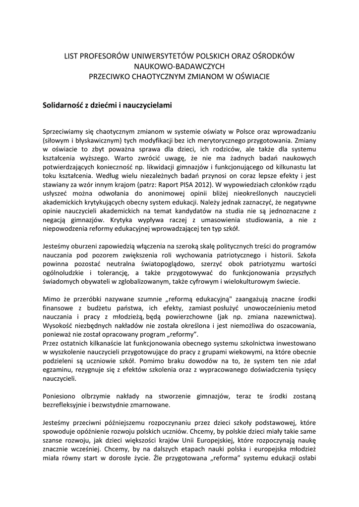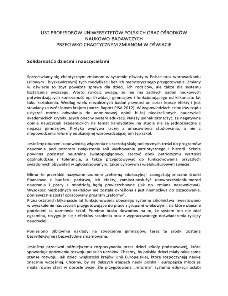 LIST PROFESORÓW UNIWERSYTETÓW POLSKICH ORAZ OŚRODKÓW NAUKOWO-BADAWCZYCH PRZECIWKO CHAOTYCZNYM ZMIANOM W OŚWIACIE Solidarność z dziećmi i nauczycielami Sprzeciwiamy się chaotycznym zmianom w systemie oświaty w Polsce oraz wprowadzaniu (siłowym i błyskawicznym) tych modyfikacji bez ich merytorycznego przygotowania. Zmiany w oświacie to zbyt poważna sprawa dla dzieci, ich rodziców, ale także dla systemu kształcenia wyższego. Warto zwrócić uwagę, że nie ma żadnych badań naukowych potwierdzających konieczność np. likwidacji gimnazjów i funkcjonującego od kilkunastu lat toku kształcenia. Według wielu niezależnych badań przynosi on coraz lepsze efekty i jest stawiany za wzór innym krajom (patrz: Raport PISA 2012). W wypowiedziach członków rządu usłyszeć można odwołania do anonimowej opinii bliżej nieokreślonych nauczycieli akademickich krytykujących obecny system edukacji. Należy jednak zaznaczyć, że negatywne opinie nauczycieli akademickich na temat kandydatów na studia nie są jednoznaczne z negacją gimnazjów. Krytyka wypływa raczej z umasowienia studiowania, a nie z niepowodzenia reformy edukacyjnej wprowadzającej ten typ szkół. Jesteśmy oburzeni zapowiedzią włączenia na szeroką skalę politycznych treści do programów nauczania pod pozorem zwiększenia roli wychowania patriotycznego i historii. Szkoła powinna pozostać neutralna światopoglądowo, szerzyć obok patriotyzmu wartości ogólnoludzkie i tolerancję, a także przygotowywać do funkcjonowania przyszłych świadomych obywateli w zglobalizowanym, także cyfrowym i wielokulturowym świecie. Mimo że przeróbki nazywane szumnie „reformą edukacyjną" zaangażują znaczne środki finansowe z budżetu państwa, ich efekty, zamiast posłużyć unowocześnieniu metod nauczania i pracy z młodzieżą, będą powierzchowne (jak np. zmiana nazewnictwa). Wysokość niezbędnych nakładów nie została określona i jest niemożliwa do oszacowania, ponieważ nie został opracowany program „reformy”. Przez ostatnich kilkanaście lat funkcjonowania obecnego systemu szkolnictwa inwestowano w wyszkolenie nauczycieli przygotowujące do pracy z grupami wiekowymi, na które obecnie podzieleni są uczniowie szkół. Pomimo braku dowodów na to, że system ten nie zdał egzaminu, rezygnuje się z efektów szkolenia oraz z wypracowanego doświadczenia tysięcy nauczycieli. Poniesiono olbrzymie nakłady na stworzenie gimnazjów, teraz te środki zostaną bezrefleksyjnie i bezwstydnie zmarnowane. Jesteśmy przeciwni późniejszemu rozpoczynaniu przez dzieci szkoły podstawowej, które spowoduje opóźnienie rozwoju polskich uczniów. Chcemy, by polskie dzieci miały takie same szanse rozwoju, jak dzieci większości krajów Unii Europejskiej, które rozpoczynają naukę znacznie wcześniej. Chcemy, by na dalszych etapach nauki polska i europejska młodzież miała równy start w dorosłe życie. Źle przygotowana „reforma” systemu edukacji osłabi szanse przyszłych absolwentów z Polski, pociągając za sobą negatywne skutki społeczne i cywilizacyjne. 1. Bartmiński Jerzy, prof. zw. dr hab., UMCS 2. Bednarczyk Anna, prof. dr. hab. UŁ, kierownik studiów doktoranckich 3. Biedrzycki Krzysztof, dr hab., prof. nadzw. UJ, IBE 4. Bobiński Witold, dr hab., UJ 5. Bogołębska Barbara, prof. dr hab., UŁ 6. Czabanowska-Wróbel Anna, prof. dr hab. UJ 7. Czapliński Przemysław, prof. zw., UAM 8. Czermińska Małgorzata, emerytowana prof. zw. dr hab., UG 9. Czyżak Agnieszka, dr hab., prof. nadzw. UAM 10. Darska Bernadetta, dr hab., Uniwersytet Warmińsko-Mazurski 11. Dybczyński Piotr A., dr hab. prof. UAM 12. Dziubalska-Kolaczyk Katarzyna, prof. zw. dr hab., UAM 13. Fert Józef, prof. zw. dr hab., KUL 14. Fiut Aleksander, prof. zw. dr hab., UJ 15. Gazda Grzegorz, emerytowany prof. zw. dr hab. UŁ 16. Gąsiorowski Piotr, dr hab., prof. UAM 17. Gęsicka Anna dr ha., UMK 18. Goźdź-Roszkowski Stanisław, dr hab., UŁ 19. Gromadzka Beata, dr hab., prof. UAM 20. Guderian-Czaplińska Ewa, dr hab . prof. UAM 21. Iwasiów Inga, prof. zw. dr hab. USz 22. Izdebska Agnieszka, dr hab., prof. nadzw. UŁ 23. Janus-Sitarz Anna, dr hab., prof. UJ 24. Kaniewski Jerzy, dr hab., prof. nadzw. UAM 25. Kędra-Kardela Anna, dr. hab., prof. UMCS 26. Korwin-Piotrowska Dorota, dr hab. UJ 27. Kowalczykowa Alina, emerytowana prof. zw. dr hab., IBL PAN 28. Kowalska Małgorzata, prof. zw. dr hab., Kierownik Katedry Filozofii I Etyki, UwB 29. Koziołek Ryszard, prof. nadzw. dr hab. UŚ 30. Krakowian Przemysław, dr hab. prof. nadzw. UŁ 31. Kudra Barbara, dr hab. prof. UŁ 32. Kuran Michał, dr hab., prof. nadzw. UŁ 33. Kuziak Michał, dr hab., prof. UW 34. Kwiatkowska-Ratajczak Maria, prof. dr hab., UAM 35. Kwieciński Zbigniew, prof. zw. dr hab., UMK 36. Latoch-Zielińska Małgorzata, dr hab., UMCS 37. Leociak Jacek, prof. zw. dr hab., IBL PAN 38. Leyko Małgorzata, prof. dr hab., UŁ, prodziekan 39. Ligęza Wojciech, prof. zw. dr hab., kierownik Katedry Historii Literatury Polskiej XX Wieku, UJ 40. Łapiński Zdzisław, emerytowany prof. zw. dr hab., IBL PAN 41. Marcinkowska Monika, prof. zw. dr hab., UŁ 42. Matera Paulina, dr hab., UŁ 43. Matuszewski Krzysztof, dr hab., prof. UŁ 44. Nasiłowska Anna, prof. zw. dr hab., IBL PAN 45. Nycz Ryszard, prof. zw. dr hab. UJ 46. Pieniążek Paweł, dr hab., prof. UŁ 47. Pietrzak Magdalena, dr hab. UŁ 48. Pilch Anna, prof. zw. dr hab., kierownik Katedry Polonistycznej Edukacji Nauczycielskiej UJ 49. Płuciennik Jarosław, prof. zw. dr hab., UŁ, były prorektor ds. programów i jakości kształcenia 50. Podemski Krzysztof, dr hab. prof. UAM 51. Popiel Magdalena, prof. zw. dr hab., UJ 52. Przyborowska Beata, prof. zw. dr hab., UMK 53. Rembowska-Płuciennik Magdalena dr hab., prof. nadzw. IBL PAN 54. Rewers Ewa, prof.zw. dr hab. UAM 55. Różańska Grażyna, dr, AP 56. Rudaś-Grodzka Monika, prof. nadzw. dr hab. IBL PAN 57. Rybicka Elżbieta, dr hab. UJ 58. Smuszkiewicz A