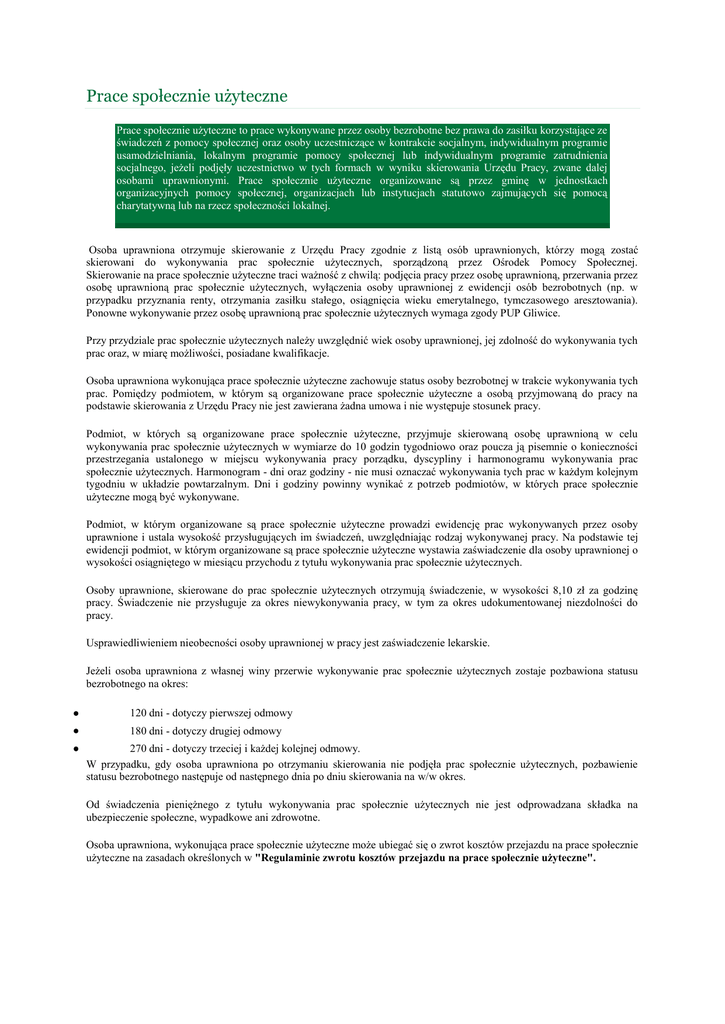Prace społecznie użyteczne Prace społecznie użyteczne to prace wykonywane przez osoby bezrobotne bez prawa do zasiłku korzystające ze świadczeń z pomocy społecznej oraz osoby uczestniczące w kontrakcie socjalnym, indywidualnym programie usamodzielniania, lokalnym programie pomocy społecznej lub indywidualnym programie zatrudnienia socjalnego, jeżeli podjęły uczestnictwo w tych formach w wyniku skierowania Urzędu Pracy, zwane dalej osobami uprawnionymi. Prace społecznie użyteczne organizowane są przez gminę w jednostkach organizacyjnych pomocy społecznej, organizacjach lub instytucjach statutowo zajmujących się pomocą charytatywną lub na rzecz społeczności lokalnej. Osoba uprawniona otrzymuje skierowanie z Urzędu Pracy zgodnie z listą osób uprawnionych, którzy mogą zostać skierowani do wykonywania prac społecznie użytecznych, sporządzoną przez Ośrodek Pomocy Społecznej. Skierowanie na prace społecznie użyteczne traci ważność z chwilą: podjęcia pracy przez osobę uprawnioną, przerwania przez osobę uprawnioną prac społecznie użytecznych, wyłączenia osoby uprawnionej z ewidencji osób bezrobotnych (np. w przypadku przyznania renty, otrzymania zasiłku stałego, osiągnięcia wieku emerytalnego, tymczasowego aresztowania). Ponowne wykonywanie przez osobę uprawnioną prac społecznie użytecznych wymaga zgody PUP Gliwice. Przy przydziale prac społecznie użytecznych należy uwzględnić wiek osoby uprawnionej, jej zdolność do wykonywania tych prac oraz, w miarę możliwości, posiadane kwalifikacje. Osoba uprawniona wykonująca prace społecznie użyteczne zachowuje status osoby bezrobotnej w trakcie wykonywania tych prac. Pomiędzy podmiotem, w którym są organizowane prace społecznie użyteczne a osobą przyjmowaną do pracy na podstawie skierowania z Urzędu Pracy nie jest zawierana żadna umowa i nie występuje stosunek pracy. Podmiot, w których są organizowane prace społecznie użyteczne, przyjmuje skierowaną osobę uprawnioną w celu wykonywania prac społecznie użytecznych w wymiarze do 10 godzin tygodniowo oraz poucza ją pisemnie o konieczności przestrzegania ustalonego w miejscu wykonywania pracy porządku, dyscypliny i harmonogramu wykonywania prac społecznie użytecznych. Harmonogram - dni oraz godziny - nie musi oznaczać wykonywania tych prac w każdym kolejnym tygodniu w układzie powtarzalnym. Dni i godziny powinny wynikać z potrzeb podmiotów, w których prace społecznie użyteczne mogą być wykonywane. Podmiot, w którym organizowane są prace społecznie użyteczne prowadzi ewidencję prac wykonywanych przez osoby uprawnione i ustala wysokość przysługujących im świadczeń, uwzględniając rodzaj wykonywanej pracy. Na podstawie tej ewidencji podmiot, w którym organizowane są prace społecznie użyteczne wystawia zaświadczenie dla osoby uprawnionej o wysokości osiągniętego w miesiącu przychodu z tytułu wykonywania prac społecznie użytecznych. Osoby uprawnione, skierowane do prac społecznie użytecznych otrzymują świadczenie, w wysokości 8,10 zł za godzinę pracy. Świadczenie nie przysługuje za okres niewykonywania pracy, w tym za okres udokumentowanej niezdolności do pracy. Usprawiedliwieniem nieobecności osoby uprawnionej w pracy jest zaświadczenie lekarskie. Jeżeli osoba uprawniona z własnej winy przerwie wykonywanie prac społecznie użytecznych zostaje pozbawiona statusu bezrobotnego na okres: 120 dni - dotyczy pierwszej odmowy 180 dni - dotyczy drugiej odmowy 270 dni - dotyczy trzeciej i każdej kolejnej odmowy. W przypadku, gdy osoba uprawniona po otrzymaniu skierowania nie podjęła prac społecznie użytecznych, pozbawienie statusu bezrobotnego następuje od następnego dnia po dniu skierowania na w/w okres. Od świadczenia pieniężnego z tytułu wykonywania prac społecznie użytecznych nie jest odprowadzana składka na ubezpieczenie społeczne, wypadkowe ani zdrowotne. Osoba uprawniona, wykonująca prace społecznie użyteczne może ubiegać się o zwrot kosztów przejazdu na prace społecznie użyteczne na zasadach określonych w "Regulaminie zwrotu kosztów przejazdu na prace społecznie użyteczne".