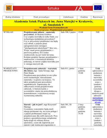 Sztuka Rodzaj działania Tytuł, prowadzący Lokalizacja Godzina Rejestracja Akademia Sztuk Pięknych im. Jana Matejki w Krakowie, ul. Smoleńsk 9 WYKŁAD WARSZTATY PROJEKTOWE Wydział Form Przemysłowych Hasło programu: Projektowanie przyszłości Sala 108, I piętro Projektowanie ubioru – materiały przyszłości, dr Bożena Groborz Czy czapka niewidka to tylko baśń, czy technologia niedalekiej przyszłości? Czy w przyszłości projektanci nie będą szyć ubrań, a jedynie pisać oprogramowanie sterujące "inteligentnymi tekstyliami"? Kto wie... Wizje, snute przez projektantów z pierwszej połowy XX wieku zrealizowały się już wiele lat temu. Kolejne projekty łączące projektantów i naukowców z rozmaitych dziedzin pokazują, że nawet czapka niewidka jest w zasięgu naszych rąk. Projektowanie zabawek – warsztaty dla dzieci, mgr Anna Szwaja, mgr Piotr Hojda Projektowanie przyszłości to nie tylko nowe technologie, niecodzienne materiały i wyprawy na księżyc. To także projektowanie przyszłości najmłodszych. Zapraszamy do odkrywania świata projektowania zabawek, w którym każdy z uczestników stanie się pomysłodawcą, konstruktorem i wykonawcą swojej wymarzonej zabawki. Sala 011, parter 19.00 1 tura: godzina 19.00 NIE TAK zgłoszenia z podaniem imienia i nazwiska uczestnika wraz z tytułem i godziną warsztatu drogą emailową pod adresem: nocnaukowc ow2014@gm ail.com Starość - jak to jest?, mgr Krzysztof Hamiga Uczestnicy warsztatów będą mieli okazję przekonać się, na czym polega i z jakimi problemami wiąże się projektowanie dla osób starszych. Przy pomocy specjalistycznego urządzenia będą mogli na własnej skórze sprawdzić, czym tak naprawdę jest starość i jak ważna jest ergonomia w Sala 301, III piętro 2 tury: godzina 18.00 i godzina 19.30 TAK zgłoszenia z podaniem imienia i nazwiska uczestnika wraz z tytułem i godziną warsztatu 1|Strona Sztuka drogą emailową pod adresem: projektowaniu. nocnaukowc ow2014@gm ail.com PREZENTACJE/ WARSZTATY NON - STOP PREZENTACJE MULTIMEDIALNE Ażur kontra ruch w luksografii, dr Piotr Witosławski, tech. Marcin Limanowski Zajęcia w ciemni fotograficznej. Uczestnicy zapoznają się z możliwością rejestracji obrazu przy użyciu medium fotografii. Warsztaty poświęcone będą pracy w klasycznej ciemni z użyciem powiększalników i odczynników chemicznych. Studio i ciemnia fotograficzna, Budynek w oficynie, Sala 003 18.00 – 22.00 NIE Od pomysłu do projektu – komputerowe wspomaganie projektowania, mgr Jakub Gołębiewski, mgr Grzegorz Matusik Warsztaty pokażą wycinek pracy projektanta wzornictwa przemysłowego, narzędzia i techniki wspomagające projektowanie oraz prototypowanie. Sala 303, III piętro 18.00 – 22.00 NIE Szybkie prototypowanie – frezarka cyfrowa, spec. Maciej Syrzistie W trakcie prezentacji uczestnicy będą mogli zapoznać się z obsługą frezarki cyfrowej umożliwiającej szybkie prototypowanie w trzech wymiarach. Sala 009, Parter 18.00 – 22.00 NIE Warsztaty - magia koloru, dr Miłosz Pobiedziński, warsztaty dla dzieci 5-10 lat. Uczestnicy będą mieli możliwość zapoznania się z profesjonalnym warsztatem artysty malarza, wiedzą na temat barwy, nauczą się mieszać farby, aby uzyskać pożądany kolor Sala 315, III piętro 18.00 – 22.00 NIE Rysunek konstruowany w procesie projektowania produktu, dr Anna Liskiewicz Prezentacja dotyczy zagadnienia procesu szybkiej wizualizacji obiektów z wyobraźni przy pomocy odręcznego Sala 104, I piętro 18.00, 20.00 NIE 2|Strona Sztuka rysunku konstruowanego wg zasad perspektywy linearnej. Mapping 3D, mgr Dawid Kozłowski Hol na III piętrze Dynamiczna prezentacja multimedialna, mapowana na zewnętrznych ścianach budynku Wydziału Form Przemysłowych. Malarstwo, rzeźba, grafika, intermedia jako ważny i twórczy element w warsztacie projektanta. 18.00 – 22.00 NIE Uniwersytet Pedagogiczny im. Komisji Edukacji Narodowej, ul. Podchorążych 2 Wydział Sztuki, Instytut Malarstwa i Edukacji Artystycznej, ul. Mazowiecka 43 Hasło programu: Artysta kolekcjoner, magik światła WARSZTATY Artysta kolekcjoner, magik światła, Budynek UP, ul. 18:00, 19:00, PLASTYCZNE poznawania tajemnej wiedzy artysty. Mazowiecka 42, 20:00, 21:00, Wunder camera, mgr Mateusz Okoński sala 18. 22:00 dla młodzieży wiek 10-14 Pryzmat Newtona, koło barwne Goethego, mgr Marta Sala Budynek UP, ul. Mazowiecka 42, sala 16 20:00, 21:00, 22:00 Plazmotwory, tworzeniu filmu nonBudynek UP, ul. kamerowego za pomocą zabarwionych Mazowiecka 42, płynów, teatru przenikających się barw i sala 14 kolorów, mgr Cecylia Malik 19:00; 20:00; 21:00 TAK rejestracja emailowa: okonskiokons [email protected] m od 10.09.2014r. do wyczerpania wolnych miejsc TAK rejestracja emailowa: okonskiokons [email protected] m od 10.09.2014r. do wyczerpania wolnych miejsc TAK rejestracja emailowa: okonskiokons [email protected] m od 10.09.2014r. do wyczerpania 3|Strona Sztuka wolnych miejsc WARSZTATY Centrum Filmu Edukacyjnego, ul. Jęczmienna 9 Hasło programu: Wirtualne Studio Filmowe Nowoczesne technologie, Motion Sala Capture, realizacja filmu na podstawie konferencyjna wcześniej przygotowanego scenariusza P3, budynek UP o wybranym wydarzeniu historycznym przy ul. Jęczmiennej 9 17.00 – 19:00 TAK rejestracja emailowa: daniel.rychars [email protected] m od 10.09.2014r. do wyczerpania wolnych miejsc 4|Strona