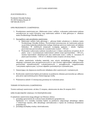 ZAPYTANIE OFERTOWE ZLECENIODAWCA Świdnicki Ośrodek Kultury 58-100 Świdnica Rynek 43 NIP 884-00-29-872 OPIS PRZEDMIOTU ZAMÓWIENIA 1. Przedmiotem zamówienia jest „Malowanie ścian i sufitów, wykonanie tynkowania tynkiem mozaikowym na części korytarzy oraz malowanie sufitów w holu głównym w obiekcie teatru Świdnickiego Ośrodka Kultury ”. 2. Szczegółowy opis przedmiotu zamówienia: Malowanie sufitów holu głównego i głównej klatki schodowej w obiekcie teatru Świdnickiego Ośrodka Kultury. Powierzchnie przeznaczone do malowania pokryte są powłoką malarską jednokrotnie (usługa obejmuje pierwsze malowanie od oddania budynku). W niektórych miejscach występują spękania i ubytki. Ogółem przewidywana powierzchnia do wymalowania wynosi ~ 550 m2. Wykonanie tynkowania tynkiem mozaikowym w klatce schodowej od parteru do II piętra wraz z wcześniejszym malowaniem całości ścian (powierzchnia ~ 180 m2), montaż kątowników aluminiowych oraz malowanie ścian i sufitu w korytarzu II piętra (powierzchnia ~ 140 m2) w obiekcie teatru (wejście od strony biur). W zakres zamówienia wchodzą materiały oraz użycie niezbędnego sprzętu. Usługa obejmuje wykonanie prac przygotowawczych (w tym również odpowiednie zabezpieczenie powierzchni niemalowanych), wykończeniowych i porządkowych, zorganizowania i utrzymania zaplecza prac, wywozu odpadów pozostałych po wykonaniu prac. 3. Zamawiający nie dopuszcza możliwości składania ofert częściowych i wariantowych. 4. Rozliczenie zamówienia będzie prowadzone na podstawie obmiaru powierzchni po odbiorze prac przez upoważnioną przez Zamawiającego osobę. 5. Wykonawca udzieli 12 miesięcznej gwarancji na wykonane prace. TERMIN WYKONANIA ZAMÓWIENIA Termin realizacji zamówienia: od dnia 12 sierpnia, zakończenie do dnia 26 sierpnia 2015. OPIS WARUNKÓW UDZIAŁU W POSTĘPOWANIU O udzielenie zamówienia mogą ubiegać się Oferenci, którzy: 1. posiadają uprawnienia do wykonywania działalności gospodarczej; Spełnienie w/w warunku oceniane będzie na podstawie załączonego aktualnego odpisu z właściwego rejestru, albo aktualnego zaświadczenia o wpisie do ewidencji działalności gospodarczej. 2. posiadają niezbędną wiedzę i doświadczenie; Spełnienie w/w warunku oceniane będzie na podstawie dołączonego wykazu wykonanych usług malowania i tynkowania w okresie 1 roku kalendarzowego wg załączonego wzoru. Oferenci ubiegający się o udzielenie zamówienia mogą dokonać we własnym zakresie, pomiarów i oceny powierzchni przewidzianej do renowacji. Z ubiegania się o zamówienie wyklucza się wykonawców, którzy: złożyli nieprawdziwe informacje mające wpływ lub mogące mieć wpływ na wynik prowadzonego postępowania, nie złożyli dokumentów potwierdzających spełnianie tych warunków, albo którzy złożyli wymagane przez zamawiającego dokumenty zawierające błędy. Zamawiający odrzuca ofertę jeżeli: treść nie odpowiada treści zapytania ofertowego, wykonawca w terminie 3 dni od dnia otrzymania zawiadomienia nie zgodził się na poprawienie omyłki rachunkowej w obliczeniu ceny, jest nieważna na podstawie odrębnych przepisów. Ofertę wykonawcy wykluczonego uznaje się za odrzuconą Ocena spełnienia warunków udziału w postępowaniu dokonywana będzie w oparciu o dokumenty złożone przez wykonawcę w niniejszym postępowaniu metodą warunku granicznego – spełnia/nie spełnia. WYKAZ DOKUMENTÓW, JAKIE MAJĄ DOSTARCZYĆ WYKONAWCY W CELU POTWIERDZENIA SPEŁNIENIA WARUNKÓW UDZIAŁU W POSTĘPOWANIU 1. Aktualny odpis z właściwego rejestru albo aktualne zaświadczenie o wpisie do ewidencji działalności gospodarczej. 2. Wykaz usług polegających na malowaniu wnętrz pomieszczeń użytkowych w okresie ostatniego roku przed upływem terminu składania ofert, a jeżeli okres prowadzenia działalności jest krótszy – w tym okresie. TERMIN SKŁADANIA OFERT 1. Ofertę należy złożyć osobiście lub przesłać pocztą na adres Świdnicki Ośrodek Kultury Rynek 43 58-100 Świdnica do dnia 2.06.2015 r. r. do godz. 12.00, lub przesłać mailem w formie elektronicznej na adres: [email protected] 2. Oferty złożone po terminie nie będą rozpatrywane. 3. W przypadku ofert przesyłanych pocztą, za oferty złożone po terminie uważa się oferty doręczone Zamawiającemu po terminie określonym w ust.1. 4. Oferent może, przed terminem do składania ofert, zmienić lub wycofać ofertę. KRYTERIA OCENY OFERTY 1. Jedynym kryterium oceny oferty jest cena. 2. Oferta powinna określać cenę netto i brutto (z wyodrębnieniem należnego podatku VAT – jeżeli występuje) za 1 m2 powierzchni objętej przedmiotem zamówienia. 3. Cena podana w ofercie winna obejmować wszystkie koszty i składniki związane z wykonaniem zamówienia oraz warunkami stawianymi przez Zamawiającego i musi być podana w PLN cyfrowo i słownie. 4. Cena nie ulega zmianie przez okres ważności oferty (związania ofertą). 5. W przypadku, gdy cena najniższej oferty przewyższa kwotę, jaką Zamawiający może przeznaczyć na realizację zamówienia dopuszcza się przeprowadzenie negocjacji i złożenie ofert dodatkowych. Negocjacje prowadzi się z Wykonawcami, którzy złożyli ważne oferty. Z przeprowadzonych negocjacji sporządza się protokół o przeprowadzonych negocjacjach. Wykonawcy mogą złożyć oferty dodatkowe. 6. Cena może podlegać negocjacji przed zawarciem umowy. INFORMACJE DOTYCZĄCE WYBORU NAJKORZYSTNIEJSZEJ OFERTY 1. O wyborze najkorzystniejszej oferty Zamawiający zawiadomi niezwłocznie wszystkie podmioty, które, przesłały oferty w ustalonym terminie. 2. Jeżeli firma, której oferta została wybrana, uchyla się od zawarcia umowy, Zamawiający może wybrać ofertę najkorzystniejszą spośród pozostałych ofert. Wybór najkorzystniejszej oferty nie zobowiązuje Zamawiającego do zawarcia umowy. 3. Zamawiający zastrzega sobie prawo unieważnienia procedury zapytania ofertowego bez podania przycz