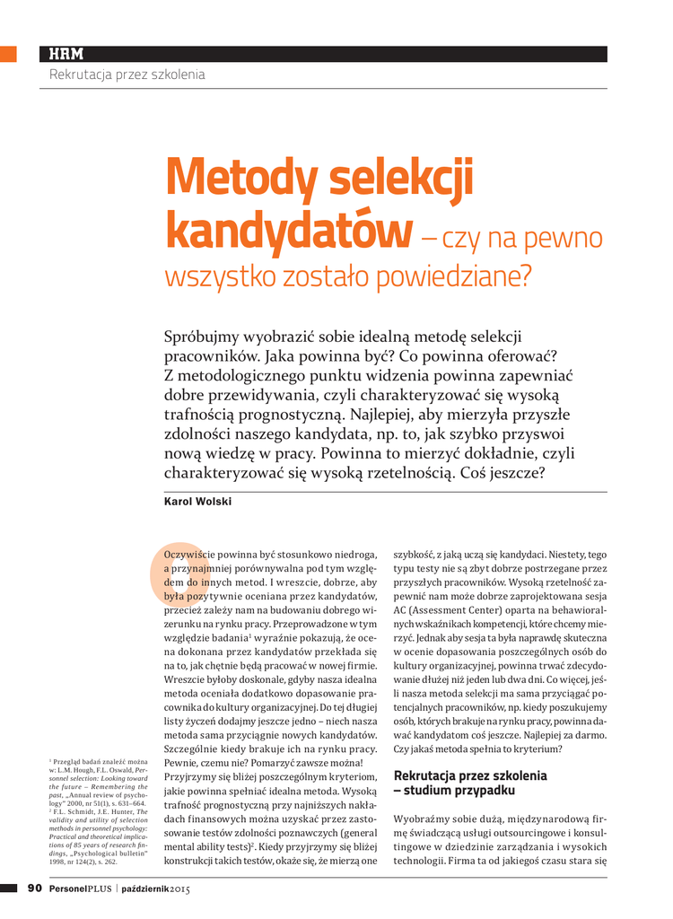 HRM Rekrutacja przez szkolenia Metody selekcji kandydatów – czy na pewno wszystko zostało powiedziane? Spróbujmy wyobrazić sobie idealną metodę selekcji pracowników. Jaka powinna być? Co powinna oferować? Z metodologicznego punktu widzenia powinna zapewniać dobre przewidywania, czyli charakteryzować się wysoką trafnością prognostyczną. Najlepiej, aby mierzyła przyszłe zdolności naszego kandydata, np. to, jak szybko przyswoi nową wiedzę w pracy. Powinna to mierzyć dokładnie, czyli charakteryzować się wysoką rzetelnością. Coś jeszcze? Karol Wolski O 1 Przegląd badań znaleźć można w: L.M. Hough, F.L. Oswald, Personnel selection: Looking toward the f uture – Remembering the past, „Annual review of psychology” 2000, nr 51(1), s. 631–664. 2 F.L. Schmidt, J.E. Hunter, The validity and utility of selection methods in personnel psychology: Practical and theoretical implications of 85 years of research fi ndings, „Psychological bulletin” 1998, nr 124(2), s. 262. Oczywiście powinna być stosunkowo niedroga, a przynajmniej porównywalna pod tym względem do innych metod. I wreszcie, dobrze, aby była pozytywnie oceniana przez kandydatów, przecież zależy nam na budowaniu dobrego wizerunku na rynku pracy. Przeprowadzone w tym względzie badania1 wyraźnie pokazują, że ocena dokonana przez kandydatów przekłada się na to, jak chętnie będą pracować w nowej irmie. Wreszcie byłoby doskonale, gdyby nasza idealna metoda oceniała dodatkowo dopasowanie pracownika do kultury organizacyjnej. Do tej długiej listy życzeń dodajmy jeszcze jedno – niech nasza metoda sama przyciągnie nowych kandydatów. Szczególnie kiedy brakuje ich na rynku pracy. Pewnie, czemu nie? Pomarzyć zawsze można! Przyjrzymy się bliżej poszczególnym kryteriom, jakie powinna spełniać idealna metoda. Wysoką trafność prognostyczną przy najniższych nakładach inansowych można uzyskać przez zastosowanie testów zdolności poznawczych (general mental ability tests)2. Kiedy przyjrzymy się bliżej konstrukcji takich testów, okaże się, że mierzą one 90 Personelplus | październik2015 szybkość, z jaką uczą się kandydaci. Niestety, tego typu testy nie są zbyt dobrze postrzegane przez przyszłych pracowników. Wysoką rzetelność zapewnić nam może dobrze zaprojektowana sesja AC (Assessment Center) oparta na behawioralnych wskaźnikach kompetencji, które chcemy mierzyć. Jednak aby sesja ta była naprawdę skuteczna w ocenie dopasowania poszczególnych osób do kultury organizacyjnej, powinna trwać zdecydowanie dłużej niż jeden lub dwa dni. Co więcej, jeśli nasza metoda selekcji ma sama przyciągać potencjalnych pracowników, np. kiedy poszukujemy osób, których brakuje na rynku pracy, powinna dawać kandydatom coś jeszcze. Najlepiej za darmo. Czy jakaś metoda spełnia to kryterium? Rekrutacja przez szkolenia – studium przypadku Wyobraźmy sobie dużą, międzynarodową irmę świadczącą usługi outsourcingowe i konsultingowe w dziedzinie zarządzania i wysokich technologii. Firma ta od jakiegoś czasu stara się znaleźć developerów tracących na popularności języków C i C+. Okazuje się jednak, że pozyskanie takich osób na rynku jest prawie niemożliwe, a większość uczelni nie uczy już tej technologii, gdyż wyparły ją nowsze, bardziej efektywne i prostsze języki programowania. – Nie szukamy gwiazd, potrzebujemy trzech dobrych rzemieślników, a jednak wciąż nie możemy ich znaleźć. Nie możemy zapłacić więcej, w projekcie nie ma na to budżetu – komentuje pracownik HR. Pilna potrzeba biznesowa skłoniła irmę do zastosowania niestandardowego podejścia w rekrutacji. Zdecydowano się dosłownie „stworzyć sobie” takich pracowników, czyli najpierw od podstaw szkolić osoby niemające doświadczenia w programowaniu, następnie po wery ikacji przyjąć najlepszych kandydatów na staż, by w efekcie oceny końcowej – zaproponować zatrudnienie tym, którzy najlepiej rokują do pracy na stanowisku programisty. Zarówno proces szkoleniowy, jak i zadania stażowe idealnie dopasowano do stanowiska pracy i przyszłych zadań, w tym uwzględniających pracę zespołową. System wery ikacji kandydatów po każdym etapie edukacji dawał zarówno komfort wyboru najlepiej rokujących przyszłych programistów, jak i pewność sukcesu całego przedsięwzięcia, a więc uzupełnienia braków kadrowych. Efekt? Nie tylko zaspokojona została potrzeba biznesowa irmy, lecz także całkowite koszty takiej rekrutacji z uwzględnieniem wynagrodzenia dla irmy szkoleniowej okazały się niższe niż koszty tradycyjnej rekrutacji lub usługi profesjonalnej irmy head hunterskiej (patrz ramka: „Ukryte koszty rekrutacji”). ► Ukryte koszty rekrutacji • Utracone korzyści związane z nieobsadzeniem danych stanowisk – brak możliwości realizacji zleceń, a nawet ich utrata. • Czas menedżerów poświęcony na uczestnictwo w kolejnych rozmowach rekrutacyjnych. • Niższa efektywność zespołu, do którego mają dołączyć nowi pracownicy, frustracja powodowana dodatkowymi zadaniami. • Negatywny wizerunek działu HR oraz menedżerów wewnątrz firmy, którzy „nie potrafią” znaleźć ludzi do pracy. łatwiej nauczyć romanistę podstaw programowania niż programistę języka francuskiego. Do procesu rekrutacji przez szkolenia są więc przyjmowani kandydaci posiadający określone predyspozycje, choć nieposiadający jeszcze odpowiedniej wiedzy czy umiejętności technicznych. Kiedy zapytamy menedżerów, jakie predyspozycje kandydatów są dla nich najważniejsze, większość z nich odpowie, że niezależnie od stanowiska, jest to szybkość uczenia się. Nowoczesna gospodarka wymaga bowiem błyskawicznego dostosowania się do zmieniających się trendów. Techniki, metodologie i technologie rozwijają się w bardzo szybkim tempie. Firmy konkurują między sobą innowacyjnością. Wygrywają te, które potra ią błysk