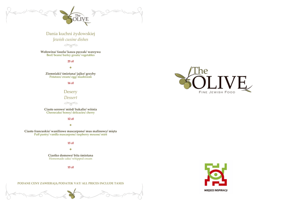 Dania kuchni żydowskiej Jewish cusine dishes Wołowina/ fasola/ kasza pęczak/ warzywa Beef/ beans/ barley groats/ vegetables 25 zł Ziemniaki/ śmietana/ jajko/ grzyby Potatoes/ cream/ egg/ mushroom 16 zł Desery Dessert Ciasto serowe/ miód/ bakalie/ wiśnia Cheesecake/ honey/ delicacies/ cherry 12 zł Ciasto francuskie/ waniliowe mascarpone/ mus malinowy/ mięta Puff pastry/ vanilla mascarpone/ raspberry mousse/ mint 15 zł Ciastko domowe/ bita śmietana Homemade cake/ whipped cream 15 zł PODANE CENY ZAWIERAJĄ PODATEK VAT/ ALL PRICES INCLUDE TAXES Przystawki Starters Zupy Soup Wołowina/ ziarna gorczycy/ kapary/ jajko/oliwa Sirlion/ mustard/capers/egg/olive oil 24 zł Bulion drobiowo- wołowy/ pieczone warzywa/ lubczyk/ kulki macowe Śledź/ burak/chrzan/ziemniaki Marinated herring/ beetroot/ horseradish/ potatoes 14 zł Krem z kukurydzy/ ser pleśniowy / pestki dyni Chicken and beef broth/ roasted vegetables/ lovage/ matzah balls 14 zł Corn soup/ blue cheese/ pumpkin seeds 11 zł Sałaty Salads Dania główne Main dishes Mix sałat/ jajko/ awokado/ oliwki/ kurczak/ sos jogurtowy Mix salad/ egg/ avocado/ olives/ grilled chicken/yoghurt sauce 17 zł Pierś z kurczaka/ sos limonkowy/ puree z zielonego groszku/ marchewka ziołowa Chicken breast/ lime sauce/ green bean puree/ carrots a herbal 26 zł Rukola/ łosoś gotowany/ pomidor cherry/ ser kozi/ dresing musztardowo – cytrynowy Rucola/ boiled salmon/ cherry tomato/ goats cheese/ mustard-lemon dressing 19 zł Polędwica wołowa/ koper włoski/ chili/ kasza pęczak/warzywa korzenne Beef sirloin/ fennel/ chili/ barley groats/ vegetables 46 zł Szpinak/ burak/ pomidor cherry/ karczoch/ jajko/ dresing paprykowo – imbirowo Łosoś/ puree/ szpinak/ czosnek/ prażona cebula Spinach/ beetroot/ cherry tomato/ artichoke/ egg/yoghurt sauce 17 zł Salmon/ puree/ spinach/ garlic/ roasted onions PODANE CENY ZAWIERAJĄ PODATEK VAT/ ALL PRICES INCLUDE TAXES PODANE CENY ZAWIERAJĄ PODATEK VAT/ ALL PRICES INCLUDE TAXES 36 zł