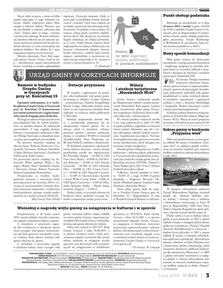 od redakcji Marzec ledwo za pasem, a wiosna od kilku tygodni pełną gębą. Z czego wykonamy tradycyjne (śląskie) wielkanocne palmy? Może zastąpią je kolorowe bukiety? Wiosenna aura nie przeszkodziła w realizacji tradycyjnej akcji „Zima”. Zamiast zabaw na śniegu - warsztaty i turnieje tenisa stołowego. W prawie wielkanocnej atmosferze odbywały się też tradycyjne spotkania noworoczne przedstawicieli licznych środowisk obecnych na terenie naszej gminy oraz spotkania kolędowe. Pora idealna, by z nową mapą gminy rozpocząć sezon turystyczny. Mocnym uderzeniem Nowy Rok rozpoczęli emeryci i renciści z Gorzyc. Poszli na swoje – zdecydowanym cięciem zdecentralizowali finanse, wychodząc ze struktur ogólnopolskiej wstęp Punkt obsługi podatnika organizacji. Zwyciężyła ekonomia. Myślę, że warto pójść za przykładem bardziej doświadczonych i starszych. Także nasza redakcja, po raz kolejny, namawia do zdecydowanego ruchu. Pozostawmy 1% podatku w naszej okolicy. Na wsparcie czekają przede wszystkim niepełnosprawne dzieci! Taka decyzja nic nie kosztuje. Sygnały dochodzące do redakcji potwierdzają, że warto. Dzięki Państwa wsparciu chorzy mogli pojechać na turnusy rehabilitacyjne oraz korzystać z kosztownych zabiegów i leczenia. Krótkie informacje o osobach, które możemy wesprzeć, zamieściliśmy w styczniowym wydaniu naszego miesięcznika (s. 8), czynimy to również w numerze bieżącym (s. 15). D. Jakubczyk Informuje się mieszkańców, że w dniu 19 marca 2014 r. (środa) w godz. od 8.00 do 14.00 w siedzibie Urzędu Gminy w Gorzycach, przy ul. Bogumińskiej 13 uruchomiony zostanie punkt obsługi podatnika, gdzie pracownicy Urzędu Skarbowego w Wodzisławiu Śl. przyjmować będą roczne zeznania podatkowe za 2013 r. Nowy sposób komunikacji URZĄD GMINY W GORZYCACH INFORMUJE Remont w budynku Urzędu Gminy w Gorzycach przy ul. Kościelnej 15 Uprzejmie informujemy, iż w siedzibie głównej Urzędu Gminy w Gorzycach przy ul. Kościelnej 15 kontynuowany jest remont pomieszczeń i ciągów komunikacyjnych drugiego piętra budynku. Wymaga to sukcesywnego przenoszenia poszczególnych biur do innych pomieszczeń, co utrudnia dotarcie do właściwych pracowników. Z tego względu prosimy Państwa o zaczerpnięcie informacji w Biurze Obsługi Interesanta o aktualnym miejscu pracy poszczególnych pracowników. Na parterze budynku znajdują się obecnie biura: Referatu Rolnictwa i Gospodarki Gruntami, Referatu Podatków i Opłat, Referatu Inwestycji i Zamówień Publicznych, Rady Gminy. Na pierwszym piętrze znajdują się: Sekretariat Wójta (gabinet Wójta i Zastępcy Wójta), Biuro Skarbnika Gminy i Sekretarza Gminy, Referat Finansów, Referat Gospodarki Komunalnej. Przepraszamy za wszelkie niedogodności związane z remontem, które potrwają jeszcze do września 2014 r. Liczymy na wyrozumiałość, bowiem działania dotyczące ulepszenia i zwiększenia funkcjonalności naszego urzędu podejmowane są z myślą o naszych klientach. Wójt Gminy Piotr Oślizło Dotacje przyznane W związku z ogłoszonymi na przełomie roku konkursami wójt gminy powołał komisję w składzie: Czesław Zychma – przewodniczący, Stefania Kwapulińska, Bożena Langer, Aleksandra Jambor, Jerzy Glenc, w celu rozpatrzenia wniosków, które wpłynęły na realizację zadań publicznych w 2014 roku. Komisja zaopiniowała złożone oferty i przedstawiła propozycje do zaakceptowania wójtowi gminy. Na realizację zadań w dziedzinie ochrony, promocji zdrowia i pomocy społecznej, dotację w wysokości 85.000 zł otrzymał Archidiecezjalny Dom Hospicyjny im. Bł. Jana Pawła II z siedzibą w Katowicach. W dziedzinie wspierania i upowszechniania kultury fizycznej i sportu dotacje przydzielone zostały nw. organizacjom: KS Przyszłość Rogów – 42.600 zł, LKS Unia Turza Śląska – 43.000 zł, LKS Rozwój Bełsznica – 18.500 zł, LKS Strzelec Gorzyczki – 26.900 zł, LKS Olszynka Olza – 20.000 zł, LKS Czarni Gorzyce – 43.000 zł, LKS Naprzód Czyżowice – 41.680 zł, Stowarzyszenie Sportów i Sztuk Walki Czarny Smok – 6.000 zł, UKS Sparta Czyżowice – 4.500 zł, Olimpiady Specjalne Polska – Śląskie Sekcja terenowa „Tygrysy” – 3.820 zł. Dodać należy, iż wszystkie złożone do konkursu oferty spełniały wymogi formalne i rozpatrzone zostały pozytywnie. Walory i atrakcje turystyczne „Morawskich Wrót” Gmina Gorzyce zrealizowała projekt pn."Eksponowanie walorów i atrakcji turystycznych Morawskich Wrót poprzez wydanie mapy interaktywnej, planu gminy Gorzyce oraz uzupełnienie oznakowania obszaru tablicami edukacyjno - informacyjnymi". W ramach projektu wydanych zostało 5 tys. map papierowych w skali 1:15 000 w języku polskim i angielskim, na których można znaleźć informator, spis ulic z terenu całej gminy, zabytki, atrakcje turystyczno - krajobrazowe oraz zdjęcia. Na bazie wersji papierowej mapy opracowana została wersja interaktywana, która dostępna jest na stronie emapy.com/gorzyce/ Ponadto gmina wzbogaciła się o 5 tablic edukacyjno – informacyjnych, położonych w: Czyżowicach (przy przedszkolu), Gorzycach (przy budynku urzędu gminy przy ul. Kościelnej oraz przy GOTSiR “Nautica”), Turzy Ślaskiej (przy LKS “Unia”), Kolonii Fryderyk (przy placu zabaw) Całkowita wartość projektu to kwota 34.845 zł, z czego 24.000 zł gmina pozyskała z Programu Rozwoju Obszarów Wiejskich poprzez Lokalną Grupę Działania „Morawskie Wrota”. Nowe plany gminy będą do nabycia w Urzędzie Gminy Gorzyce przy ul. Kościelnej 15 i Bogumińskiej 13 oraz w Wiejskich Domach Kultury i u sołtysów. Wnioskuj o nagrodę wójta gminy za osiągnięcia w kulturze i w sporcie Przypominamy, iż do końca marca 2014 r.można składać wnioski o przyznanie nagród w dziedzinie kultury i sportu. Z wnioskiem o przyznanie nagrody lub wyróżnienia w dziedzinie sportu może wystąpić: wójt gminy, stowarzyszenie lub klub sportowy zawodnika, tre
