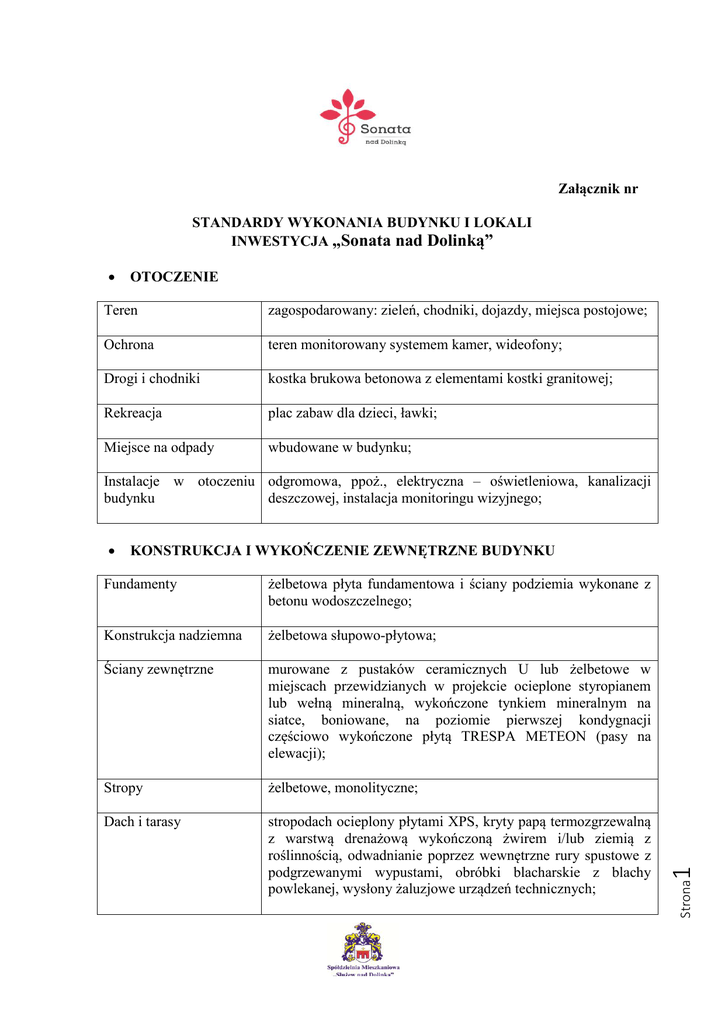 Załącznik nr STANDARDY WYKONANIA BUDYNKU I LOKALI INWESTYCJA „Sonata nad Dolinką” OTOCZENIE Teren zagospodarowany: zieleń, chodniki, dojazdy, miejsca postojowe; Ochrona teren monitorowany systemem kamer, wideofony; Drogi i chodniki kostka brukowa betonowa z elementami kostki granitowej; Rekreacja plac zabaw dla dzieci, ławki; Miejsce na odpady wbudowane w budynku; Instalacje w otoczeniu odgromowa, ppoż., elektryczna – oświetleniowa, kanalizacji budynku deszczowej, instalacja monitoringu wizyjnego; Fundamenty żelbetowa płyta fundamentowa i ściany podziemia wykonane z betonu wodoszczelnego; Konstrukcja nadziemna żelbetowa słupowo-płytowa; Ściany zewnętrzne murowane z pustaków ceramicznych U lub żelbetowe w miejscach przewidzianych w projekcie ocieplone styropianem lub wełną mineralną, wykończone tynkiem mineralnym na siatce, boniowane, na poziomie pierwszej kondygnacji częściowo wykończone płytą TRESPA METEON (pasy na elewacji); Stropy żelbetowe, monolityczne; Dach i tarasy stropodach ocieplony płytami XPS, kryty papą termozgrzewalną z warstwą drenażową wykończoną żwirem i/lub ziemią z roślinnością, odwadnianie poprzez wewnętrzne rury spustowe z podgrzewanymi wypustami, obróbki blacharskie z blachy powlekanej, wysłony żaluzjowe urządzeń technicznych; 1 KONSTRUKCJA I WYKOŃCZENIE ZEWNĘTRZNE BUDYNKU Strona Izolacje Drzwi wejściowe antywłamaniowe klasy C, okładzina drewnopodobna, okucia mosiądz i chrom mat (standard typu Witex) Ściany wewnętrzne ściany międzylokalowe: z bloczków betonowych AMERBLOK lub żelbetowe monolityczne; ściany działowe; w łazienkach i kuchniach z bloczków betonowych AMERBLOK, pomiędzy pozostałymi pomieszczeniami z bloczków gazobetonowych lub ceramicznych; Tynki gipsowe kat. III wykonane mechanicznie, zagruntowane i jednokrotnie malowane w kolorze białym, powierzchnie tynków na ścianach łazienek pod okładziny jedynie zagruntowane Posadzki wylewki cementowe z MIKSOKRETA (jastrych zatarty); Okna i drzwi balkonowe pięciokomorowy profil PCV, w każdym pomieszczeniu przynajmniej jedno skrzydło z funkcją uchylania, kolorystyka: biały kolor od wewnątrz, kolor antracytowy od zewnątrz; Parapety przygotowane miejsce do obsadzenia parapetów; Drzwi wewnętrzne otwory przygotowane do montażu ościeżnic i drzwi; Kuchnie podejścia do zamontowania urządzeń (zlewozmywak z baterią sztorcową, zmywarka, lodówka, kuchnia elektryczna trójfazowa, okap); Łazienki podejścia do odbiorników w miejscach przewidzianych w projekcie (pralka, umywalka, miska ustępowa, wanna, ew. dodatkowo natrysk) bez białego montażu; 2 MIESZKANIA Strona termiczne: ściany fundamentowe, ściany zewnętrzne, stropodach, strop nad garażem, balkony; przeciwwilgociowe: fundamenty, płyta fundamentowa, izolacja pozioma i pionowa ścian garażu i pomieszczeń mokrych; akustyczne: strop nad garażem, stropy między mieszkaniami, piony instalacyjne wewnątrz lokalowe Instalacja c.o. grzejniki płytowe, w łazienkach grzejniki drabinkowe, piony z rur stalowych, instalacja lokalowa pod posadzkowa (rury z tworzywa sztucznego), indywidualne liczniki ciepła dostępne do odczytu z klatki schodowej/korytarza; Instalacja wody instalacja lokalowa pod posadzkowa, wykonana z rur z tworzywa sztucznego, podejścia pod przybory sanitarne wg. projektu, indywidualne wodomierze ciepłej i zimnej wody dostępne do odczytu od strony klatki schodowej/korytarza; Instalacja kanalizacyjna z żeliwa i tworzywa sztucznego; Instalacja wentylacyjna wentylacja mechaniczna wyciągowa kuchni i łazienek, w kuchni dodatkowe piony do podłączenia okapów kuchennych włączane do wspólnego pionu co drugą kondygnację, nawiewniki ścienne /okienne wg projektu; Instalacja elektryczna kable miedziane z osprzętem krajowym, tablice mieszkaniowe podtynkowe, instalacja trójfazowa dla kuchni elektrycznych; Inne instalacje kabel antenowy koncentryczny z gniazdem z anteny naziemnej orurowanie z pilotami do zbiorczej w każdym pokoju dziennym, kablówki internetowa, TV i telefoniczna w każdym pokoju, wideofonowa z osprzętem, dzwonkowa z osprzętem; Balkony/Loggie/Tarasy GARAŻE WIELOSTANOWISKOWE ściany zewnętrzne, konstrukcyjne i słupy monolityczne; ściany wewnętrzne murowane z bloczków; żelbetonowe Posadzki betonowe, powierzchniowo utwardzane z wyznaczeniem i oznakowaniem miejsc postojowych; 3 Ściany zewnętrzne, wewnętrzne, konstrukcyjne i słupy Strona płytki gresowe, antypoślizgowe, mrozoodporne produkcji polskiej; system typu COPAL, balustrady zewnętrzne aluminiowe, ocynkowane, malowane proszkowo, wypełnione szkłem bezpiecznym, bezbarwnym o zmniejszonej przezierności; Drzwi stalowe wg. wymagań ppoż.; Wrota garażowe brama garażowa segmentowa, otwierana automatycznie za pomocą karty lub pilota; Instalacje wentylacja mechaniczna, wyciągowa, elektryczno-oświetleniowa z oprawami wg. projektu, kanalizacyjna wraz z odwodnieniem i separatorem związków ropopochodnych, instalacja ppoż., hydrantowa i oddymiania, instalacja tlenku węgla w garażu, instalacja monitoringu wizyjnego z osprzętem węzeł cieplny zasilany z ciepłowniczej sieci miejskiej; KLATKI SCHODOWE Wejście do budynku z poziomu terenu; Drzwi wejściowe do halli aluminiowe, przeszklone szkłem zespolonym bezbarwnym i bezpiecznym; Ściany i sufity tynki gipsowe, malowane; Posadzki płytki ceramiczne antypoślizgowej; Biegi schodowe żelbetowe wylewane lub prefabrykowane wykończone płytkami ceramicznymi produkcji krajowej o strukturze antypoślizgowej; Balustrady stalowe ocynkowane i malowane proszkowo z pochwytem drewnianym; Obudowy szachtów instalacyjnych drzwiczki z płyty meblowej NRO wg. projektu; Okna/witryny PCV/aluminiowe, szklane szkłem zespolonym, bezbarwnym; Parapety konglomerat; Instalacje elektryczne oprawy oświetleniowe wg. projektu, tablice piętrowe; Windy osobowe, osobowo-meblowe, kabina z lustrem, pochwytem i krajowej o strukturze 4 produkcji Strona kamerą; D