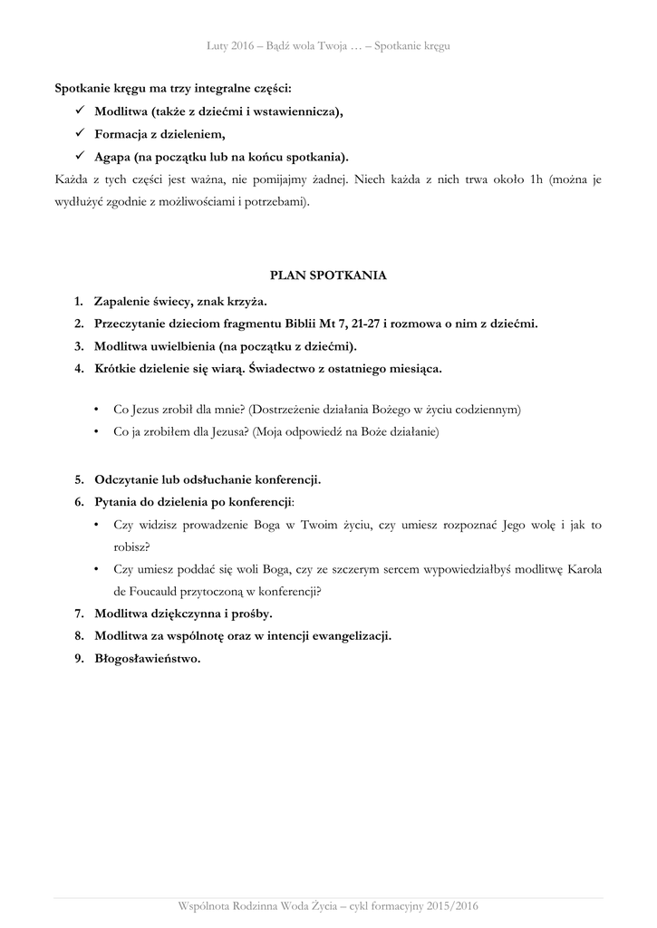 Luty 2016 – Bądź wola Twoja … – Spotkanie kręgu Spotkanie kręgu ma trzy integralne części: Modlitwa (także z dziećmi i wstawiennicza), Formacja z dzieleniem, Agapa (na początku lub na końcu spotkania). Każda z tych części jest ważna, nie pomijajmy żadnej. Niech każda z nich trwa około 1h (można je wydłużyć zgodnie z możliwościami i potrzebami). PLAN SPOTKANIA 1. Zapalenie świecy, znak krzyża. 2. Przeczytanie dzieciom fragmentu Biblii Mt 7, 21-27 i rozmowa o nim z dziećmi. 3. Modlitwa uwielbienia (na początku z dziećmi). 4. Krótkie dzielenie się wiarą. Świadectwo z ostatniego miesiąca. • Co Jezus zrobił dla mnie? (Dostrzeżenie działania Bożego w życiu codziennym) • Co ja zrobiłem dla Jezusa? (Moja odpowiedź na Boże działanie) 5. Odczytanie lub odsłuchanie konferencji. 6. Pytania do dzielenia po konferencji: • Czy widzisz prowadzenie Boga w Twoim życiu, czy umiesz rozpoznać Jego wolę i jak to robisz? • Czy umiesz poddać się woli Boga, czy ze szczerym sercem wypowiedziałbyś modlitwę Karola de Foucauld przytoczoną w konferencji? 7. Modlitwa dziękczynna i prośby. 8. Modlitwa za wspólnotę oraz w intencji ewangelizacji. 9. Błogosławieństwo. Wspólnota Rodzinna Woda Życia – cykl formacyjny 2015/2016 Luty 2016 – Bądź wola Twoja … – Spotkanie kręgu KONFERENCJA 1. Ludzie boją się woli Bożej. Uważają, że Bóg zażąda od nich czegoś, co wykonanie będzie ponad ich możliwości i nie da im szczęścia, spełnienia. Mamy marzenia, plany dla swojego życia, projektujemy swoją przyszłość, i myślimy, że tylko wówczas gdy one będą realizowane będziemy szczęśliwi i spełnieni. Tymczasem może się okazać, że plan Boga dla nas może być inny, jakby w poprzek naszych pragnień, planów życiowych. Często słyszę w naszej wspólnocie, że wola Boża na pewno jest taka jak moje pragnienia, bo Bóg dał mi takie pragnienia…Wydaje się, że Bóg nie robiłby na przekór nam rzucając nam inne wezwania… Ile dziewcząt boi się, że Bóg ich pociągnie do klasztoru… Już lepiej zostać samą… Ale może trzeba uwierzyć, że Bóg jest dobry i wola Boża dla mnie jest dobrem, jest miłością Boga dla mnie. Wola Boża oznacza, że naprawdę Bóg nas kocha i chce twojego dobra, szczęścia. Przecież Bóg ciebie stworzył i zna ciebie lepiej niż ktokolwiek, niż ty znasz siebie. On wie jaka droga jest dla ciebie najlepsza, właściwa. Trzeba Mu zaufać i z odwagą wejść na proponowaną ścieżkę. Nieraz ta relacja, choć jest dużo uczucia i zaangażowania nie jest dobra, ale ty poza nim, czy nią świata innego nie widzisz. Gdy się posypie jesteś rozbita, jakby się świat zawalił… Oczywiście wola Boża to nie tylko przestrzeń decyzji o małżeństwie czy innym powołaniu. Wolę Bożą trzeba rozpoznawać w życiu codziennym. Codziennie dokonujemy małych, większych wyborów. Każdy dzień jest pełny dylematów, sytuacji, w których musimy zastanawiać się jak postąpić, co wybrać. Gdy modlimy się – Bądź wola Twoja… prosimy Boga, aby pomógł nam rozeznać jak iść, co wybrać, aby dobrze wybrać. 2. Trzeba też rozróżniać wolę Bożą od dopustu Bożego. Powiedzmy – ktoś nas okradł. Ktoś mówi do ciebie, widocznie była taka wola Boża… Nie. To był dopust Boży i teraz ty powinieneś coś z tym zrobić. Albo będziesz pomstował, przeklinał sprawcę, użalał się nad sobą, bo zostałeś okradziony. A może Bóg dopuścił do tego, abyś ty w tym wydarzeniu bolesnym coś sobie uświadomił, coś odkrył… Dopust Boży może otworzyć cię na rozpoznanie Bożych zamiarów wobec ciebie. Tak było np. z Ignacym Loyolą. Dopustem było to, że był ciężko ranny w bitwie (był wtedy żołnierzem). Czas rekonwalescencji był dla niego czasem zastanowienia nad sobą, czytał książki (Żywoty świętych) i dokonywała się w nim przemiana, nawrócenie – i stał się żołnierzem Jezusa…Trzeba umieć zastanawiać się, co Bóg mówi do mnie przez wydarzenia, nieraz przez ludzi. Bóg jest obecny w naszym życiu, jest dobry i chce naszego dobra nawet gdy doświadczamy zła, a On dopuszcza… coś w tym jest. Nieraz trzeba z kimś mądrym porozmawiać o tym, opowiedzieć – może się rozjaśni… 3. Bądź wola Twoja, jako w niebie tak i na ziemi… Czego Bóg chce? Wspólnota Rodzinna Woda Życia – cykl formacyjny 2015/2016 Luty 2016 – Bądź wola Twoja … – Spotkanie kręgu Wolą naszego Ojca w niebie jest, by wszyscy ludzie zostali zbawieni i doszli do poznania prawdy – 1Tym 2,4; On jest cierpliwy… chce bowiem wszystkich doprowadzić do nawrócenia – 2P 3,9; Jego przykazaniem, streszczającym wszystkie inne i wyrażającym całą Jego wolę jest, abyśmy się wzajemnie miłowali, jak On nas umiłował – J 13, 34. Wola Boża to Miłość. Bóg z miłości nas stworzył i do miłości powołał. Przymierze miłości i życia czyli przyjaźń z Bogiem była w raju na samym początku. Grzech to odrzucenie Boga, Jego miłości, Jego woli. Konsekwencją grzechu jest samowola – człowiek chodzi drogami według swej woli. Historia zbawienia to Bóg, który szuka człowieka, nie przestał go kochać, nie odrzucił go. I tak początek historii zbawienia to Abraham, który jest posłuszny Bogu, wyruszył w drogę, uwierzył w obietnicę… dalej Mojżesz, jego niezwykłą historia, Bóg go wybrał i posłał do Egiptu, aby dokonała wyjścia (exodus). Na pustyni Bóg zawiera przymierze z Izraelem, daje Dekalog, w którym jest zawarta wola Boża. Wreszcie Maryja, która uwierzyła, że może być Matką Syna Bożego tylko musi wyrazić na to zgodę. I tak się stało. I Jezus, Syna Boga i Syn Człowieczy przychodzi na świat i mówi tak: „Moim pokarmem jest wypełnić wolę tego, który mnie posłał i wykonać Jego dzieło” J 4,34. „W Chrystusie dzięki Jego ludzkiej woli, wola Ojca została wypełniona w sposób doskonały, raz na zawsze” KKK 2824