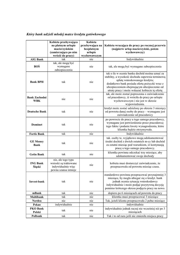 Który bank udzieli młodej matce kredytu gotówkowego AIG Bank BOŚ Kobieta przebywająca na płatnym urlopie macierzyńskim (zamierzająca po nim wrócić do pracy) tak tak, ale mogą być wymagane zabezpieczenia Kobieta przebywająca na Kobieta wracająca do pracy po rocznej przerwie bezpłatnym (najpierw urlop macierzyński, potem urlopie wychowawczy) wychowawczym nie Indywidualnie nie Bank BPH tak nie Bank Zachodni WBK nie nie Deutsche Bank tak nie tak, ale mogą być wymagane zabezpieczenia tak o ile w ocenie banku dochód moŜna uznać za stabilny, a wysokość dochodu zapewnia terminową spłatę wnioskowanego kredytu; dodatkowo bank posiada ofertę poŜyczki wraz z ubezpieczeniem obejmującym ubezpieczenie od utraty pracy i moŜe wskazać kobiecie tę ofertę tak, ale moŜe zostać poproszona o zaświadczenie od pracodawcy, iŜ wróciła do pracy po urlopie wychowawczym i nie jest w okresie wypowiedzenia. kredyt moŜe zostać udzielony po okresie 3 miesięcy od powrotu danej osoby do pracy – wymagane jest zaświadczenie od pracodawcy po powrocie do pracy u tego samego pracodawcy, wymagane jest potwierdzenie przez pracodawcę tego faktu i podanie kwoty wynagrodzenia, które klientka będzie otrzymywała. Indywidualnie tak. osoby te, wyjątkowo mogą udokumentować średni dochód z dwóch ostatnich m-cy lub dochód za ostatni miesiąc pod warunkiem, iŜ kontynuują pracę u tego samego pracodawcy. klientka powinna odczekać trzy miesiące, aby udokumentować swoje dochody Dominet tak nie Fortis Bank tak nie GE Money Bank tak nie Getin Bank tak nie ING Bank Śląski nie, ale tego typu wnioski są traktowane indywidualnie więc pewna szansa istnieje nie kobieta musi dostarczyć zaświadczenie, Ŝe przepracowała od powrotu miesiąc czasu. standardowo powinna przepracować przynajmniej 3 miesiące, by mogła ubiegać się o kredyt. bank jednak ocenia sytuację wnioskodawcy indywidualnie i moŜe podjąć pozytywną decyzję pomimo krótszego okresu podjęcia pracy na nowo. Invest-bank tak nie mBank Multibank Nordea Pekao PKO Bank Polski Polbank tak tak nie indywidualnie nie nie nie nie tak nie tak nie dopiero po 6 miesiącach od powrotu do pracy klientka musi przepracować 3 miesiące Tak, jeŜeli klienta przepracowała 2 pełne miesiące indywidualnie indywidualnie jednak raczej nie wcześniej niŜ po 3 miesiącach Tak i to od razu jeśli nie zmieniła miejsca pracy Raiffeisen Bank Tak, ale jeśli nie jest to jedyny dochód w rodzinie brany pod uwagę w badaniu zdolności nie indywidualnie Który bank udzieli młodej matce kredytu hipotecznego Kobieta przebywająca na płatnym urlopie macierzyńskim (zamierzająca po nim wrócić do pracy) Kobieta przebywająca na bezpłatnym urlopie wychowawczym Kobieta wracająca do pracy po rocznej przerwie (najpierw urlop macierzyński , potem wychowawczy) BOŚ tak nie tak Bank BPH tak nie tak o ile w ocenie banku dochód moŜna uznać za stabilny, a wysokość dochodu zapewnia terminową spłatę wnioskowanego kredytu Bank Zachodni WBK nie nie tak, ale moŜe zostać poproszona o zaświadczenie od pracodawcy iŜ wróciła do pracy po urlopie wychowawczym i nie jest w okresie wypowiedzenia. Deutsche Bank tak nie tak Fortis Bank tak tak (pod warunkiem, deklaruje ona powrót do pracy, czyli nie skorzysta z urlopu wychowawczego) nie tak nie tak (wystarczy 1 miesiąc pracy) nie tak (po upływie 1 miesiąca, gdyŜ wynagrodzenie musi minimum raz wpłynąć na rachunek bankowy) nie tak, ale kobieta musi dostarczyć zaświadczenie, Ŝe przepracowała przynajmniej 1 miesiąc nie tak nie Tak (po upływie 1 miesiąca, gdyŜ wynagrodzenie musi minimum raz wpłynąć na rachunek bankowy) nie Tak, klientka moŜe złoŜyć wniosek o kredy juŜ w pierwszym dniu po powrocie z urlopu GE Money Bank Dom Bank ING Bank Śląski Invest-bank mBank Multibank nie nie, ale tego typu wnioski są traktowane indywidualnie więc pewna szansa istnieje tak, ale bank poprosi o oświadczenie, Ŝe kobieta nie skorzysta z urlopu wychowawczego tak, ale bank poprosi o oświadczenie, Ŝe kobieta nie skorzysta z urlopu wychowawczego indywidualnie wychowawczego tak klientka musi jednak przepracować przynajmniej 2 miesiące Nordea nie nie Pekao indywidualnie nie indywidualnie PKO Bank Polski indywidualnie nie indywidualnie Polbank tak nie tak, klientka musi jednak przepracować przynajmniej 6 m-cy Raiffeisen Bank nie nie indywidualnie