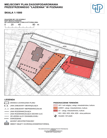 MIEJSCOWY PLAN ZAGOSPODAROWANIA PRZESTRZENNEGO "ŁAZIENNA" W POZNANIU SKALA 1:1000 ZAŁĄCZNIK NR 1 DO UCHWAŁY RADY MIASTA POZNANIA NR LXXXVI/976/IV/2006 Z DNIA 24 STYCZNIA 2006r. 80 m ( ( ( # 0 EF ) U1 ) ( ) () ) ( ( ( ( ( ul. Ł 21 .2 m ) ) az ie n ) ( ( ( ( ( ( ( [ [ ( [ ( ) # 0 [ ( )( [ [ [ ( ( [ [ ) a bl ro G ( ( ( 17 .9 m 40 .7m ) [ ) ) KD4 ( ) ) . ul KD3 ( ( ) ) U/MW1 10 .0 m ( ) ) ) ) ) ( ( ( ( ( ( ( 8.4 m na [ [ [ [ [ [ [ [ ) ) UK1 ) [ ) # 0 ) [ [ # 0 ( ( [ KD1 [ 4.5 m [ 11.0 m [ [ os t ow a ul. M [ KD5 ) [ KD2 ul. E wan geli [ cka [ [ ) [ ) [ ( [ ( 40 ( 20 () 0 ( ( ( LEGENDA PRZEZNACZENIE TERENÓW: GRANICA UCHWALENIA PLANU ( ( ) ) LINIA ZABUDOWY OBOWIĄZUJĄCA UK1- kult religijny, usługi, mieszkalnictwo, kultura LINIA ZABUDOWY NIEPRZEKRACZALNA U/MW1- usługi, mieszkalnictwo, kultura U1 - usługi, mieszkalnictwo, kultura LINIA ROZGRANICZAJĄCA [ [ # 0 KD1, KD2, KD3, KD4, KD5 - ulica publiczna OŚ JEZDNI ULICY EWANGELICKIEJ WJAZD / WYJAZD EF LINIA ROZGRANICZAJĄCA ODCINKI ULIC OGRODZENIE AKCENT ARCHITEKTONICZNY OBIEKT OBJĘTY OCHRONĄ KONSERWATORSKĄ Plan został opracowany w Miejskiej Pracowni Urbanistycznej w Poznaniu przez Zespół Projektowy Śródmieścia Dyrektor MPU Krzysztof Cesar