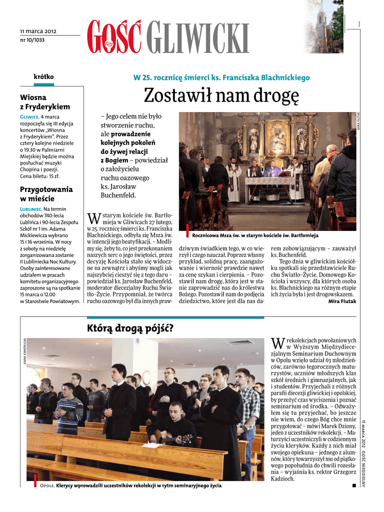 I 11 marca 2012 nr 10/1033 krótko W 25. rocznicę śmierci ks. Franciszka Blachnickiego Zostawił nam drogę Wiosna z Fryderykiem Przygotowania w mieście Lubliniec. Na termin obchodów 740-lecia Lublińca i 90-lecia Zespołu Szkół nr 1 im. Adama Mickiewicza wybrano 15 i 16 września. W nocy z soboty na niedzielę zorganizowana zostanie II Lubliniecka Noc Kultury. Osoby zainteresowane udziałem w pracach komitetu organizacyjnego zaproszone są na spotkanie 15 marca o 12.00 w Starostwie Powiatowym. – Jego celem nie było stworzenie ruchu, ale prowadzenie kolejnych pokoleń do żywej relacji z Bogiem – powiedział o założycielu ruchu oazowego ks. Jarosław Buchenfeld. Mira Fiutak Gliwice. 4 marca rozpoczęła się III edycja koncertów „Wiosna z Fryderykiem”. Przez cztery kolejne niedziele o 19.30 w Palmiarni Miejskiej będzie można posłuchać muzyki Chopina i poezji. Cena biletu: 15 zł. W starym kościele św. Bartłomieja w Gliwicach 27 lutego, w 25. rocznicę śmierci ks. Franciszka Blachnickiego, odbyła się Msza św. w intencji jego beatyfikacji. – Modlimy się, żeby to, co jest przekonaniem naszych serc o jego świętości, przez decyzję Kościoła stało się widoczne na zewnątrz i abyśmy mogli jak najszybciej cieszyć się z tego daru – powiedział ks. Jarosław Buchenfeld, moderator diecezjalny Ruchu Światło–Życie. Przypomniał, że twórca ruchu oazowego był dla innych praw- Rocznicowa Msza św. w starym kościele św. Bartłomieja dziwym świadkiem tego, w co wierzył i czego nauczał. Poprzez własny przykład, solidną pracę, zaangażowanie i wierność prawdzie nawet za cenę szykan i cierpienia. – Pozostawił nam drogę, która jest w stanie zaprowadzić nas do królestwa Bożego. Pozostawił nam do podjęcia dziedzictwo, które jest dla nas da- Anna Kwaśnicka Którą drogą pójść? Mira Fiutak W rekolekcjach powołaniowych w Wyższym Międzydiecezjalnym Seminarium Duchownym w Opolu wzięło udział 63 młodzieńców, zarówno tegorocznych maturzystów, uczniów młodszych klas szkół średnich i gimnazjalnych, jak i studentów. Przyjechali z różnych parafii diecezji gliwickiej i opolskiej, by przeżyć czas wyciszenia i poznać seminarium od środka. – Odważyłem się tu przyjechać, bo jeszcze nie wiem, do czego Bóg chce mnie przygotować – mówi Marek Dziony, jeden z uczestników rekolekcji. – Maturzyści uczestniczyli w codziennym życiu kleryków. Każdy z nich miał swojego opiekuna – jednego z alumnów, który towarzyszył mu od piątkowego popołudnia do chwili rozesłania – wyjaśnia ks. rektor Grzegorz Kadzioch. • 11 marca 2012 Gość Niedzielny Opole. Klerycy wprowadzili uczestników rekolekcji w rytm seminaryjnego życia rem zobowiązującym – zauważył ks. Buchenfeld. Tego dnia w gliwickim kościółku spotkali się przedstawiciele Ruchu Światło–Życie, Domowego Kościoła i wszyscy, dla których osoba ks. Blachnickiego na różnym etapie ich życia była i jest drogowskazem. gość gliwicki Muzycy na dniu skupienia świata. Odnowić dla szczęścia własnego, naszych bliskich i całego świata – powiedział na rozpoczęcie nabożeństwa Słowa Bożego ks. dr Piotr Tarlinski z Wydziału Teologicznego Uniwersytetu Opolskiego, gdzie pracuje w Instytucie Liturgii, Muzyki i Sztuki Sakralnej. W drugiej części spotkania, która odbyła się w Centrum Edukacyjnym im. Jana Pawła II, wygłosił wykład na temat tradycji muzyki liturgicznej na Śląsku na przykładzie dwóch opactw cysterskich – w Rudach i Jemielnicy oraz kościołów Bytomia i Pyskowic. Mira Fiutak Diecezja. Na swoim wielkopostnym dniu skupienia 3 marca zebrali się w Gliwicach organiści, muzycy kościelni oraz uczniowie Diecezjalnej Szkoły Organistowskiej II stopnia i Studium Muzyki Kościelnej. Spotkanie rozpoczęło się w katedrze wspólnym ćwiczeniem śpiewów m.in. pieśni ku czci bł. Jana Pawła II „Chwalcie, o wierni”. – Bóg Ojciec miłosierdzia spogląda na nas, by umocnić, podźwignąć, uleczyć, a przede wszystkim na nowo stworzyć, odrodzić dogłębnie i całkowicie – dla siebie, dla ludu Bożego, dla Studenckie praktyki na Guido Mira Fiutak II Zabrzańska kopalnia nawiązała współpracę z Uniwersytetem Ekonomicznym w Katowicach Zabrze. Na poziomie 320 Zabytkowej Kopalni Węgla Kamiennego Guido 29 lutego podpisane zostało porozumienie o współpracy pomiędzy kopalnią a Uniwersytetem Ekonomicznym w Katowicach. Chodzi o promowanie walorów turystyki industrialnej. Współpraca będzie polegała m.in. na tym, że studenci kierunku gospodarka turystyczna będą odbywali praktyki w Guido, a kadra naukowa UE wesprze pracowników kopalni w dokumentowaniu innych zabytków techniki. Wcześniej podobne porozumienie Kopalnia Guido podpisała z Politechniką Śląską w Gliwicach. To spotkanie jest zawsze okazją do wspólnego ćwiczenia śpiewów liturgicznych Cinema City Lekcje w kinie Kadr z filmu „Opowieści z Narnii: Lew, czarownica i stara szafa” Tydzień E-książki Gość Niedzielny 11 marca 2012 Gliwice. 4 marca rozpoczął się międ z y narodow y Tyd zień E-książki. W związku z tym Miejska Biblioteka Publiczna zaprosiła wszystkich zainteresowanych do korzystania z podręczników akademickich oraz książek naukowych w języku polskim dostępnych on-line. W bazie ibuk.pl znajduje się 478 tytułów, z takich dziedzin jak: medycyna, komunikacja społeczna, logika, socjologia, filologia polska, historia, kultura i sztuka, nauki ekonomiczne, gospodarka, marketing i reklama, rachunkowość. Korzystać z nich można za darmo w ośmiu punktach – Bibliotece Centralnej (ul. Kościuszki 17) oraz filiach – przy placu Inwalidów Wojennych 3, ul. Perkoza 12, ul. Junaków 4, ul. Skarbnika 3, ul. Spółdzielczej 33 a, ul. Bernardyńskiej 2 i ul. Syriusza 30. Można również odebrać tam hasła do logowania i skorzystać z oferty w domu. Obecna lista tytułów e-booków będzie dostępna do października, a