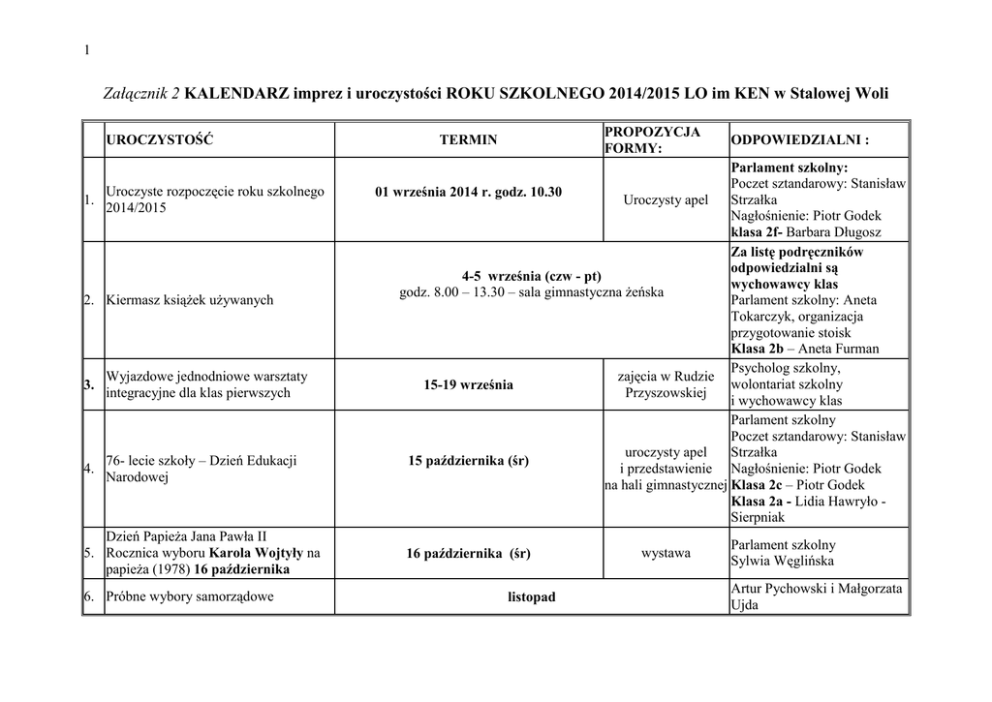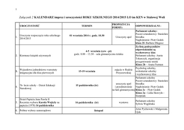 1 Załącznik 2 KALENDARZ imprez i uroczystości ROKU SZKOLNEGO 2014/2015 LO im KEN w Stalowej Woli UROCZYSTOŚĆ 1. Uroczyste rozpoczęcie roku szkolnego 2014/2015 2. Kiermasz książek używanych 3. Wyjazdowe jednodniowe warsztaty integracyjne dla klas pierwszych 4. 76- lecie szkoły – Dzień Edukacji Narodowej Dzień Papieża Jana Pawła II 5. Rocznica wyboru Karola Wojtyły na papieża (1978) 16 października 6. Próbne wybory samorządowe PROPOZYCJA FORMY: TERMIN ODPOWIEDZIALNI : Parlament szkolny: Poczet sztandarowy: Stanisław 01 września 2014 r. godz. 10.30 Uroczysty apel Strzałka Nagłośnienie: Piotr Godek klasa 2f- Barbara Długosz Za listę podręczników odpowiedzialni są 4-5 września (czw - pt) wychowawcy klas godz. 8.00 – 13.30 – sala gimnastyczna żeńska Parlament szkolny: Aneta Tokarczyk, organizacja przygotowanie stoisk Klasa 2b – Aneta Furman Psycholog szkolny, zajęcia w Rudzie wolontariat szkolny 15-19 września Przyszowskiej i wychowawcy klas Parlament szkolny Poczet sztandarowy: Stanisław uroczysty apel Strzałka 15 października (śr) i przedstawienie Nagłośnienie: Piotr Godek na hali gimnastycznej Klasa 2c – Piotr Godek Klasa 2a - Lidia Hawryło Sierpniak 16 października (śr) listopad wystawa Parlament szkolny Sylwia Węglińska Artur Pychowski i Małgorzata Ujda 2 7. Wszystkich świętych 8. Rocznica Odzyskania Niepodległości 9. 6 grudnia – Mikołajki „Szlachetna paczka” 30 lub 31 października 7 lub 12 listopada 05 grudnia (pt) wizyta na cmentarzu miejskim – groby Klasa 2f- Barbara Długosz nauczycieli i Andrzej Wnuk uczniów groby zamordowanych w czasie II wojny światowej Parlament szkolny Poczet sztandarowy: Stanisław uroczysty apel Strzałka Nagłośnienie: Piotr Godek Klasa 2 i – Jerzy Strugalski Wolontariat szkolny akcja charytatywna Iwona Sodomir 10. Międzynarodowy Dzień Praw Człowieka Szkolny Konkurs o Prawach Człowieka i Ucznia 11. Kiermasz przedświąteczny 12. Jasełka 19 grudnia (pt) przedstawienie 13. Konkurs wiedzy o krajach anglojęzycznych i piosenki angielskiej 29 stycznia ( czw) konkurs 10 grudnia (wt) Prezentacja multimedialna na godziny wychowawcze Małgorzata Ujda Jolanta Kawa ks. Ł.ukasz Parlament szkolny Poczet sztandarowy: Stanisław Strzałka Nagłośnienie: Piotr Godek klasa 2e – Beata Gazda ks.Łukasz klasa 1a – Konrad Zawadzki, Katarzyna Geraghty, 3 14. Dzień Dawcy szpiku kostnego w LOKEN Warsztaty całodniowe dla klas drugich 15. „ Kim jestem i dokąd zmierzam ” 30 stycznia (pt) Planowane na drugi semestr 16. Kiermasz przedświąteczny Światowy Dzień Zdrowia 07 kwietnia 17. Turniej siatkówki 8 kwietnia (śr) 18. Światowy dzień książki 23 kwietnia 14-25 kwietnia marzec 19. Święto Konstytucji 3 Maja 23 kwietnia (czw) 20. Zakończenie zajęć w klasach III 24 kwietnia ( pt) Dzień otwarty szkoły 21. Eliza Janowska, Gierak Aleksandra, Stasiak Sławomir, i pozostali nauczyciele j. angielskiego Przygotowanie : Uczniowie klasy 2h Małgorzata Gołojuch Ewa Praga 25 kwietnia (so) zajęcia na sali gimnastycznej żeńskiej Psycholog szkolny, liderzy i wychowawcy klas Jolanta Kawa i ks. maciej Wolontariat audycja, wystawa Klasa 1f – Bożena Gajda przedstawienie Damian Babicki wystawa książki Ewa Musiał, Anna Gawron Poczet sztandarowy: Stanisław Strzałka uroczysty apel Nagłośnienie: Piotr Godek Klasa 1i – Artur Pychowski Poczet sztandarowy: Stanisław Strzałka Nagłośnienie: Piotr Godek uroczysty apel klasa 2g – Anna Żywczyk – scenariusz przebiegu uroczystości Garbulińska Małgorzata Klasa 1h Biłogras Maciej zajęcia tematyczne Klasa 1g – Wiesław Mazurkiewicz Klasa 1e – Wojciech Pamuła 4 22. Dzień Unii Europejskiej 09 maja 23. Dzień talentów 24. Dni sportu szkolnego 25. Uroczyste zakończenie roku szkolnego 2014/2015 26. Ferie letnie – zajęcia z języka angielskiego - organizacja 27. Uroczyste rozpoczęcie roku szkolnego 2015/2016 9-16 maja 30 maja (so) 22 i 23 czerwca (po, wt) 26 czerwca (piątek ) Prezentacja multimedialna Zajęcia, przedstawienia na hali gimnastycznej zajęcia praktyczne uroczysty apel Lipiec/sierpień 01 Wrzesień 2014 r. uroczysty apel Klasy pierwsze klasa 2d – Elżbieta Drobny Parlament Szkolny Nagłośnienie: Piotr Godek Maria Serwońska i Tomasz Kajpust– scenariusz zajęć klasa 1b– Ludmiła Drożewska Poczet sztandarowy: Stanisław Strzałka Nagłośnienie:, Piotr Godek Jerzy, Zygmunt Świderski Klasa 1c – Lidia Panas Pawłowska scenariusz przebiegu uroczystości Organizacja grup: Sławomir Stasiak Poczet sztandarowy: Stanisław Strzałka Nagłośnienie: Piotr Godek klasa 1d- Małgorzata Bieniek scenariusz przebiegu uroczystości 5 6
