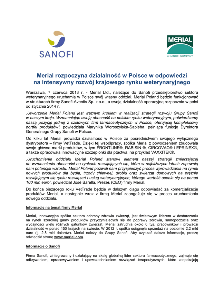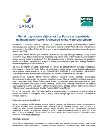 Merial rozpoczyna działalność w Polsce w odpowiedzi na intensywny rozwój krajowego rynku weterynaryjnego Warszawa, 7 czerwca 2013 r. - Merial Ltd., należące do Sanofi przedsiębiorstwo sektora weterynaryjnego uruchamia w Polsce swój własny oddział. Merial Poland będzie funkcjonować w strukturach firmy Sanofi-Aventis Sp. z o.o., a swoją działalność operacyjną rozpocznie w pełni od stycznia 2014 r. „Utworzenie Merial Poland jest ważnym krokiem w realizacji strategii rozwoju Grupy Sanofi w naszym kraju. Wzmacniając swoją obecność na polskim rynku weterynaryjnym, potwierdzamy naszą pozycję jednej z czołowych firm farmaceutycznych w Polsce, oferującej kompleksowy portfel produktów”, powiedziała Marynika Woroszylska-Sapieha, pełniąca funkcję Dyrektora Generalnego Grupy Sanofi w Polsce. Od kilku lat Merial prowadzi działalność w Polsce za pośrednictwem swojego wyłącznego dystrybutora – firmy VetTrade. Dzięki tej współpracy, spółka Merial z powodzeniem zbudowała swoje główne marki produktów, w tym FRONTLINE®, RABISIN ®, CIRCOVAC® i EPRINEX®, a także opracowała innowacyjne szczepionki dla ptactwa, na przykład VAXXITEK®. „Uruchomienie oddziału Merial Poland stanowi element naszej strategii zmierzającej do wzmocnienia obecności na rynkach rozwijających się, które w najbliższych latach zapewnią nam potencjał wzrostu. Merial Poland pozwoli nam przyspieszyć proces wprowadzania na rynek nowych produktów dla bydła, trzody chlewnej, drobiu oraz zwierząt domowych na prężnie rozwijającym się rynku rozwiązań i usług weterynaryjnych, którego wartość ocenia się na ponad 100 mln euro”, powiedział José Barella, Prezes (CEO) firmy Merial. Do końca bieżącego roku VetTrade będzie w dalszym ciągu odpowiadać za komercjalizację produktów Merial, a następnie wraz z firmą Merial zaangażuje się w proces uruchamiania nowego oddziału. Informacje na temat firmy Merial Merial, innowacyjna spółka sektora ochrony zdrowia zwierząt, jest światowym liderem w dostarczaniu na rynek szerokiej gamy produktów przyczyniających się do poprawy zdrowia, samopoczucia oraz wydajności wielu różnych gatunków zwierząt. Merial zatrudnia około 6 tys. pracowników i prowadzi działalność w ponad 150 krajach na świecie. W 2012 r. spółka osiągnęła sprzedaż na poziomie 2,2 mld euro (tj. 2,8 mld dolarów). Merial należy do Grupy Sanofi. Aby uzyskać dalsze informacje, proszę odwiedzić stronę www.merial.com. Informacje o Sanofi Firma Sanofi, zintegrowany i działający na skalę globalną lider sektora farmaceutycznego, zajmuje się odkrywaniem, opracowywaniem i upowszechnianiem rozwiązań terapeutycznych, które zaspokajają potrzeby pacjentów. Sanofi rozwija pozycję lidera w siedmiu głównych obszarach terapeutycznych: rozwiązania dla cukrzyków, szczepionki dla ludzi, innowacyjne leki, środki ochrony zdrowia, rynki wschodzące, zdrowie zwierząt oraz nowa spółka Genzyme. Firma Sanofi jest notowana na giełdach w Paryżu (EURONEXT: SAN) i Nowym Jorku (NYSE: SNY). Do Grupy Sanofi w Polsce należy, między innymi, Sanofi Pasteur – największy na świecie producent szczepionek, a także Zentiva – wiodący producent leków generycznych w Europie Środkowo-Wschodniej, Nepentes S.A. – spółka produkująca leki i dermokosmetyki, oraz Genzyme – firma prowadząca produkcję preparatów stosowanych w leczeniu chorób rzadkich. Grupa Sanofi w Polsce zatrudnia blisko 1 tys. pracowników, w tym 250 osób w fabryce w Rzeszowie. Według danych IMS Health, Grupa Sanofi zajmuje jedno z wiodących miejsc w krajowym rankingu największych przedsiębiorstw farmaceutycznych. Dalsze informacje są dostępne na stronie www.sanofi.pl Kontakt dla mediów: Merial Corinne Demée Tel : 00 33 4 72 72 44 42 E-mail : [email protected] Sanofi Monika Chmielewska-Żehaluk Tel: 0-22 280 07 53, mobile : 695 588 881 e-mail: [email protected] Anna Cywińska Tel. 0-22 280 06 63, mobile 691 433 139 e-mail: [email protected]