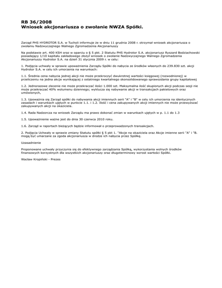 RB 36/2008 Wniosek akcjonariusza o zwołanie NWZA Spółki. Zarząd PHS HYDROTOR S.A. w Tucholi informuje że w dniu 11 grudnia 2008 r. otrzymał wniosek akcjonariusza o zwołaniu Nadzwyczajnego Walnego Zgromadzenia Akcjonariuszy Na podstawie art. 400 KSH oraz w oparciu o § 5 pkt. 2 Statutu PHS Hydrotor S.A. akcjonariusz Ryszard Bodziachowski posiadający 1/10 kapitału zakładowego złożył wniosek o zwołanie Nadzwyczajnego Walnego Zgromadzenia Akcjonariuszy Hydrotor S.A. na dzień 31 stycznia 2009 r. w celu: 1. Podjęcia uchwały w sprawie upoważnienia Zarządu Spółki do nabycia ze środków własnych do 239.830 szt. akcji Hydrotor S.A. w celu ich umorzenia na warunkach: 1.1. Średnia cena nabycia jednej akcji nie może przekroczyć dwukrotnej wartości księgowej (rozwodnionej) w przeliczeniu na jedna akcje wynikającej z ostatniego kwartalnego skonsolidowanego sprawozdania grupy kapitałowej 1.2. Jednorazowe zlecenie nie może przekraczać ilości 1.000 szt. Maksymalna ilość skupionych akcji podczas sesji nie może przekraczać 40% wolumenu dziennego; wyklucza się nabywanie akcji w transakcjach pakietowych oraz umówionych, 1.3. Upoważnia się Zarząd spółki do nabywania akcji imiennych serii "A" i "B" w celu ich umorzenia na identycznych zasadach i warunkach ujętych w punkcie 1.1. i 1.2. Ilość i cena zakupywanych akcji imiennych nie może przewyższać zakupywanych akcji na okaziciela. 1.4. Rada Nadzorcza na wniosek Zarządu ma prawo dokonać zmian w warunkach ujętych w p. 1.1 do 1.3 1.5. Upoważnienie ważne jest do dnia 30 czerwca 2010 roku. 1.6. Zarząd w raportach bieżących będzie informował o przeprowadzonych transakcjach. 2. Podjęcia Uchwały w sprawie zmiany Statutu spółki § 5 pkt 1. "Akcje na okaziciela oraz Akcje imienne serii "A" i "B. mogą być umarzane za zgoda akcjonariusza w drodze ich nabycia przez Spółkę. Uzasadnienie Proponowane uchwały przyczynia się do efektywnego zarządzania Spółką, wykorzystania wolnych środków finansowych korzystnych dla wszystkich akcjonariuszy oraz długoterminowy wzrost wartości Spółki. Wacław Kropiński - Prezes