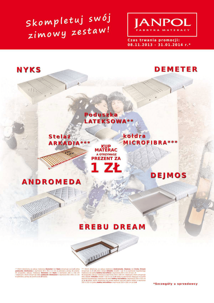 REGULAMIN SPRZEDAŻY PREMIOWANEJ "PROMOCJA ZIMOWA" TERMIN: 08.11.2013 – 31.01.2014 SPRZEDAJĄCY: FABRYKA MATERACY JANPOL SP. Z O.O. • Klient detaliczny za zakup materaca Andromeda, Dejmos lub Erebu Dream otrzymuje za 1 zł jeden stelaż Arkadia (model I lub II) w wymiarze kupowanego materaca lub jedną kołdrę microfibra o wymiarze 200*155 cm za 1 zł. W przypadku zakupu materaca o wymiarze 200*160 cm i większym, klient otrzymuje dwa stelaże Arkadia (model I lub II) za 1 zł każdy w wymiarach dających w sumie wymiar kupowanego materaca lub dwie kołdry microfibra o wymiarze 200*155 za 1 zł każda. Klient detaliczny ma prawo wybrać zamiast dwóch kołder o wymiarze 200*155 cm jedną kołdrę microfibra o wymiarze 220*200 cm za 1 zł, np.: Dejmos w wymiarze 200*180 cm + dwa stelaże Arkadia (model I lub II) o wymiarze 200*90 cm za 1 zł każdy lub dwie kołdry microfibra o wymiarze 200*155 cm za 1 zł każda lub jedna kołdra microfibra o wymiarze 220*200cm za 1 zł. • Klient detaliczny za zakup materaca Demeter lub Nyks otrzymuje za 1 zł jedną poduszkę lateksową o wymiarze 60*40*11 cm w pokrowcu jersey do prania. W przypadku zakupu materaca Demeter lub Nyks o wymiarze 200*140 cm i większym, klient otrzymuje dwie poduszki lateksowe o wymiarze 60*40*11 cm w pokrowcu jersey do prania za 1 zł każda, np.: Nyks w wymiarze 200*160 cm + dwie poduszki lateksowe o wymiarze 60*40*11 cm za 1 zł każda. • Fabryka Materacy Janpol sp. z o.o. po otrzymaniu zamówienia od klienta hurtowego na materac Andromeda, Dejmos lub Erebu Dream przekaże jeden lub dwa stelaże Arkadia (model I lub II), alternatywnie jedną lub dwie kołdry microfibra, w zależności od wymiaru zamawianego materaca, za 1 zł brutto każdy(a). • Przesłanie zamówienia promocyjnego jest równoznaczne z akceptacją niniejszego regulaminu. • Każde zamówienie musi być opisane hasłem „PROMOCJA ZIMOWA”. • Klient hurtowy udostępni miejsce na terenie sklepu w celu poinformowania Klientów o organizowanej promocji i jej zasadach. • Sprzedawca (Fabryka Materacy JANPOL Sp. z o.o.) zastrzega sobie prawo do zmiany lub zakończenia promocji bez podania przyczyny. • Promocja nie łączy się z żadną inną promocją, ani nie obejmuje żadnych zamówień ekspozycyjnych.