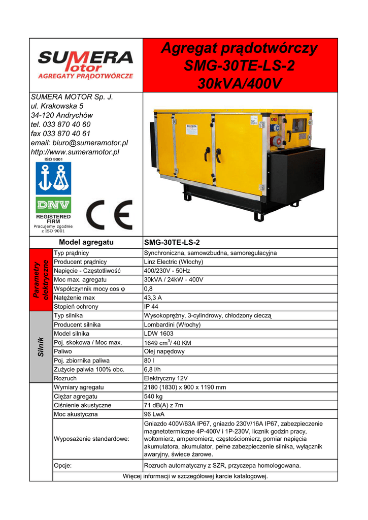 Agregat prądotwórczy SMG-30TE-LS-2 30kVA/400V SUMERA MOTOR Sp. J. ul. Krakowska 5 34-120 Andrychów tel. 033 870 40 60 fax 033 870 40 61 email: [email protected] http://www.sumeramotor.pl Silnik Parametry elektryczne Model agregatu SMG-30TE-LS-2 Typ prądnicy Producent prądnicy Napięcie - Częstotliwość Moc max. agregatu Współczynnik mocy cos φ Natężenie max Stopień ochrony Typ silnika Producent silnika Model silnika Poj. skokowa / Moc max. Paliwo Poj. zbiornika paliwa Zużycie palwia 100% obc. Rozruch Wymiary agregatu Ciężar agregatu Ciśnienie akustyczne Moc akustyczna Synchroniczna, samowzbudna, samoregulacyjna Linz Electric (Włochy) 400/230V - 50Hz 30kVA / 24kW - 400V 0,8 43,3 A IP 44 Wysokoprężny, 3-cylindrowy, chłodzony cieczą Lombardini (Włochy) LDW 1603 1649 cm3/ 40 KM Olej napędowy 80 l 6,8 l/h Elektryczny 12V 2180 (1830) x 900 x 1190 mm 540 kg 71 dB(A) z 7m 96 LwA Wyposażenie standardowe: Gniazdo 400V/63A IP67, gniazdo 230V/16A IP67, zabezpieczenie magnetotermiczne 4P-400V i 1P-230V, licznik godzin pracy, woltomierz, amperomierz, częstościomierz, pomiar napięcia akumulatora, akumulator, pełne zabezpieczenie silnika, wyłącznik awaryjny, świece żarowe. Opcje: Rozruch automatyczny z SZR, przyczepa homologowana. Więcej informacji w szczegółowej karcie katalogowej.