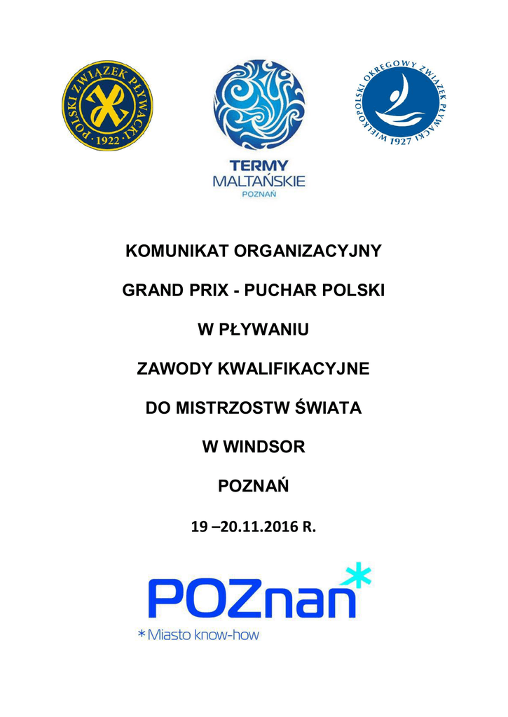 KOMUNIKAT ORGANIZACYJNY GRAND PRIX - PUCHAR POLSKI W PŁYWANIU ZAWODY KWALIFIKACYJNE DO MISTRZOSTW ŚWIATA W WINDSOR POZNAŃ 19 –20.11.2016 R. 1. Termin i miejsce zawodów. 19 – 20.11.2016, Pływalnia „Termy Maltańskie” ul. Termalna 1, 61-028 Poznań 2. Organizatorzy. Wielkopolski Okręgowy Związek Pływacki Polski Związek Pływacki Termy Maltańskie 3. Partnerzy. Urząd Miasta Poznania 4. Kierownictwo zawodów. Naczelnik zawodów – Andrzej Olszewski 5. Uczestnictwo. 5.1 Według zasad generalnych Regulaminu Imprez PZP 5.2 W zawodach mają prawo startu zawodnicy 14 letni i starsi, dopuszczony jest start zawodniczek 13 letnich, które będą kwalifikowały się na zawody Krajów Europy Środkowej. 5.3 Prawo startu mają zawodnicy zgłoszeni przez klub/szkołę lub PZP. 5.4 Zawodnicy muszą posiadać aktualną licencję oraz badania lekarskie. 6. Program zawodów. Odprawa techniczna odbędzie się 18.11.2016 o godz. 20.00 w Sali konferencyjnej pływalni Termy Maltańskie, ul. Termalna 1 W dniu 18.11.2016 pływalnia do treningów zostanie udostępniona w godzinach od 18.00 do 20.00. I blok – 19.11.2016 zawody godz. 9.00 rozgrzewka godz.8.00 Kobiety Mężczyźni 1.1 200 m st. dowolnym (5 serii) 2.1 200 m st. dowolnym (5 serii) 3.1 100 m st. klasycznym (5 serii) 4.1 100 m st. klasycznym (5 serii) 5.1 50 m st. motylkowym (5 serii) 6.1 50 m st. motylkowym (5 serii) 7.1 200 m st. grzbietowym (5 serii) 8.1 200 m st. grzbietowym (5 serii) 9.1 100 m st. zmiennym (5 serii) 10.1 100 m st. zmiennym (5 serii) 11.1 800 m st. dowolnym (3 serie) Pozostałe serie 1.2 200 m st. dowolnym 2.2 200 m st. dowolnym 3.2 100 m st. klasycznym 4.2 100 m st. klasycznym 5.2 50 m st. motylkowym 6.2 50 m st. motylkowym 7.2 200 m st. grzbietowym 8.2 200 m st. grzbietowym 9.2 100 m st. zmiennym 10.2 100 m st. zmiennym 11.2 800 m st. dowolnym II blok – 19.11.2016 uroczyste otwarcie godz. 16.45 zawody godz. 17.00 rozgrzewka godz.16.00 12.1 14.1 16.1 18.1 20.1 22.1 12.2 14.2 16.2 18.2 20.2 22.2 24.1 26.1 28.1 30.1 32.1 100 m st. dowolnym (5 serii) 13.1 100 m st. dowolnym (5 serii) 50 m st. klasycznym (5 serii) 15.1 50 m st. klasycznym (5 serii) 200 m st. motylkowym (5 serii) 17.1 200 m st. motylkowym (5 serii) 100 m st. grzbietowym (5 serii) 19,1 100 m st. grzbietowym (5 serii) 200 m st. zmiennym (5 serii) 21.1 200 m st. zmiennym (5 serii) 400 m st. dowolnym (3 serie) 23.1 400 m st. dowolnym (3 serie) Pozostałe serie 100 m st. dowolnym 13.2 100 m st. dowolnym 50 m st. klasycznym 15.2 50 m st. klasycznym 200 m st. motylkowym 17.2 200 m st. motylkowym 100 m st. grzbietowym 19.2 100 m st. grzbietowym 200 m st. zmiennym 21.2 200 m st. zmiennym 400 m st. dowolnym 23.2 400 m st. dowolnym III blok – 20.11.2016 zawody godz. 9.00 rozgrzewka godz.8.00 400 m st. zmiennym (3 serie) 50 m st. dowolnym (5 serii) 200 m st. klasycznym (5 serii) 100 m st. motylkowym (5 serii) 50 m st. grzbietowym (5 serii) 25.1 27.1 29.1 31.1 33.1 34.1 400 m st. zmiennym (3 serie) 50 m st. dowolnym (5 serii) 200 m st. klasycznym (5 serii) 100 m st. motylkowym (5 serii) 50 m st. grzbietowym (5 serii) 1500 m st. dowolnym (3 serie) 24.2 26.2 28.2 30.2 32.2 400 m st. zmiennym 50 m st. dowolnym 200 m st. klasycznym 100 m st. motylkowym 50 m st. grzbietowym Pozostałe serie 25.2 400 m st. zmiennym 27.2 50 m st. dowolnym 29.2 200 m st. klasycznym 31.2 100 m st. motylkowym 33.2 50 m st. grzbietowym 34.2 1500 m st. dowolnym 7. Przepisy techniczne. 7.1 Wyścigi odbywają się seriami na czas. 7.2 Pomiar czasu elektroniczny. 7.3 Długość pływalni 25 m, 10 torów, temperatura wody 27 C. 7.4 Punktacja zawodów: 7.4.1 Punktacja w poszczególnych rundach zawodów tworzona jest na podstawie sumy punktów za trzy najlepsze starty w dowolnej konkurencji wg tabeli FINA - zarówno w kat. open jak i w kategoriach wiekowych oraz najlepsze dwa wyniki w poszczególnych stylach (np. 50m i 100m motylkowym, 50m i 400m dowolnym itd.) w kategorii open. 7.4.2 W punktacji poszczególnych rund biorą udział zawodnicy zagraniczni. 7.4.3 Do punktacji zaliczane będą sumy punktów za trzy najlepsze rezultaty (trzy najlepsze starty) oraz najlepsze dwa wyniki w poszczególnych stylach (np. 50m i 100m motylkowym, 50m i 800m dowolnym itd.). 7.4.4 Każdy zawodnik w kategorii open może być nagradzany jednokrotnie za, największą sumę punktów FINA zgromadzonych w trzech startach oraz wielokrotnie za zwycięstwa w poszczególnych stylach. 7.4.5 Podczas zawodów prowadzona jest punktacja open oraz punktacja w kategoriach wiekowych junior 17-18 lat, junior młodszy 16 lat, junior młodszy 15 lat, junior młodszy 14 lat, oddzielnie dla kobiet i mężczyzn. 8. Nagrody. 8.1 W kategorii open nagradzanych jest 6 zawodniczek i 6 zawodników, którzy w trzech najlepszych startach zgromadzą największą ilość punktów wg tabeli FINA oraz 5 zawodniczek i 5 zawodników, którzy uzyskają największą ilość punktów wg tabeli FINA w poszczególnych stylach (po 1 zawodniczce i 1 zawodniku ze stylu w układzie: styl motylkowy, grzbietowy, klasyczny, dowolny oraz zmienny – nagrody finansowe, 8.2 w każdej kategorii wiekowej nagradzany jest jeden zawodnik i jedna zawodniczka, którzy w trzech startach zgromadzili największą liczbę punktów FINA – nagrody rzeczowe, 8.3 każdy zawodnik w kategorii open może być nagradzany jednokrotnie za, największą sumę punktów FINA zgromadzonych w trzech startach oraz wielokrotnie za zwycięstwa w poszczególnych stylach, 8.4 nagrodzony zostanie trener najlepszej zawodniczki i najlepszego zawodnika, którego zawodnik uzyskał największą ilość punktów wg tabeli FINA za trzy najlepsze wyniki, 8.5 w zawodach nagradzani będą również zawodnicy zagraniczni w każdej kategorii wiekowej – dotyczy nagród finansowych i rzeczowych. 9. Zgłoszenia. 9.1 Według zasad generalnych. 9.2 Zgłoszenia w formie elektronicznej należy przesłać na adres [email protected] tel. 604 408 866 w nieprzekraczalnym terminie do dnia 11.11.2016 9.3 Po opubl