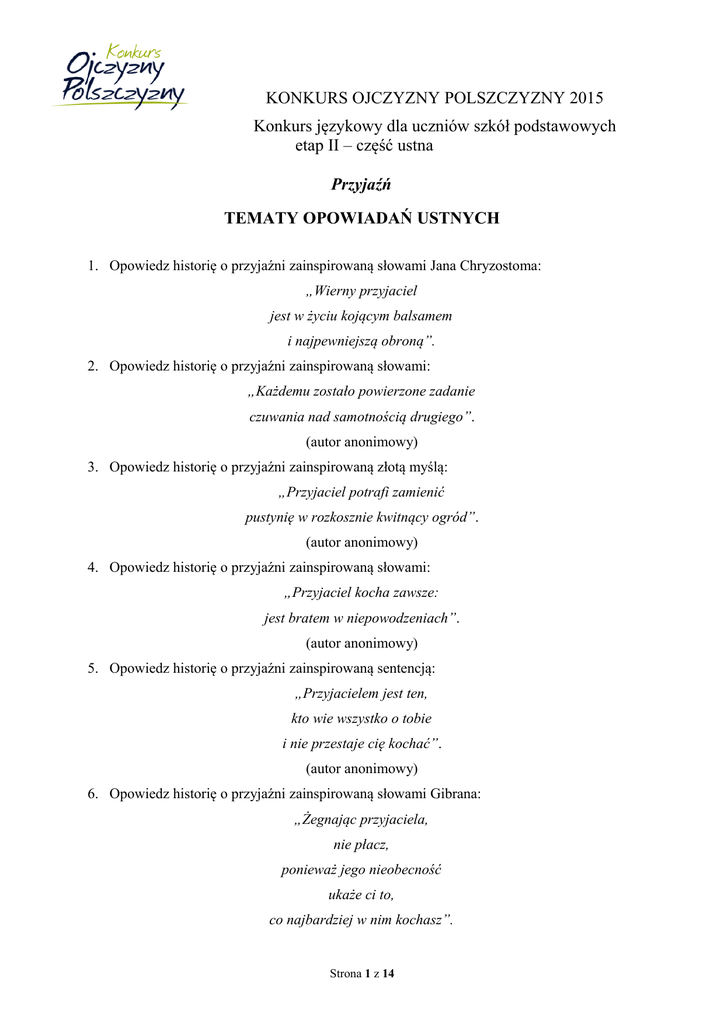 KONKURS OJCZYZNY POLSZCZYZNY 2015 Konkurs językowy dla uczniów szkół podstawowych etap II – część ustna Przyjaźń TEMATY OPOWIADAŃ USTNYCH 1. Opowiedz historię o przyjaźni zainspirowaną słowami Jana Chryzostoma: „Wierny przyjaciel jest w życiu kojącym balsamem i najpewniejszą obroną”. 2. Opowiedz historię o przyjaźni zainspirowaną słowami: „Każdemu zostało powierzone zadanie czuwania nad samotnością drugiego”. (autor anonimowy) 3. Opowiedz historię o przyjaźni zainspirowaną złotą myślą: „Przyjaciel potrafi zamienić pustynię w rozkosznie kwitnący ogród”. (autor anonimowy) 4. Opowiedz historię o przyjaźni zainspirowaną słowami: „Przyjaciel kocha zawsze: jest bratem w niepowodzeniach”. (autor anonimowy) 5. Opowiedz historię o przyjaźni zainspirowaną sentencją: „Przyjacielem jest ten, kto wie wszystko o tobie i nie przestaje cię kochać”. (autor anonimowy) 6. Opowiedz historię o przyjaźni zainspirowaną słowami Gibrana: „Żegnając przyjaciela, nie płacz, ponieważ jego nieobecność ukaże ci to, co najbardziej w nim kochasz”. Strona 1 z 14 7. Opowiedz historię o przyjaźni zainspirowaną słowami Antoine'a de Saint-Exupéry'ego: „Pewnego przyjaciela poznaje się w niepewnym położeniu”. 8. Opowiedz historię o przyjaźni zainspirowaną słowami: „Przyjaźń rodzi miłość na pustyni samotności”. 9. Opowiedz historię o przyjaźni zainspirowaną słowami Adama Asnyka: „Jeśli jakaś dłoń ma swoje miejsce w drugiej dłoni, to właśnie jest przyjaźń”. 10. Opowiedz historię o przyjaźni zainspirowaną słowami Pitagorasa: „Tak postępuj z przyjaciółmi, aby nie stali się nieprzyjaciółmi, a z nieprzyjaciółmi tak się obchodź, żeby jak najprędzej stali się przyjaciółmi.” 11. Opowiedz historię o przyjaźni zainspirowaną słowami św. Jana Bosko: „Przyjacielem jest ten, kto nie pytając o powód twego smutku, potrafi sprawić, że znów wraca radość”. Kryteria oceny opowiadań ustnych - 10 punktów I TREŚĆ (0-5) 1. historia – czy jest ciągiem zdarzeń? 2. dynamiczność – czy jest żywa, nierozwlekła? 3. przejrzystość – czy jest jasna, klarowna dla słuchaczy? 4. ciekawość – czy jest niebanalna, przyciąga słuchaczy? 5. morał, puenta, suspens – czy zawiera (wypowiedziane lub domyślne)? II WYKONANIE (0-5) 1. kontakt – czy opowiadacz przyciąga „twarzą w twarz”? 2. identyfikacja – czy jest autentyczny, bliski „historii”? 3. rozbudzanie – czy porusza umysł, wyobraźnię lub uczucia? 4. mowa ciała – czy odpowiednio używa ruchów, gestów, mimiki? 5. dykcja – czy mówi wyraźnie i odpowiednio głośno? RAZEM: 10 punktów Uwagi: 1. Uczniowie opowiadają na jeden z wylosowanych tematów. 2. Wypowiedź trwa około 3-4 minuty. Czas na przygotowanie się – 45 minut. 3. Uczniowie podczas wygłaszania treści nie korzystają z wcześniej przygotowanych notatek. 4. Mówienie nie na temat lub rażące błędy językowe dyskwalifikują wypowiedź i przyznaje się zero punktów. Strona 2 z 14 Strona 3 z 14 Dofinansowano ze środków Ministra Kultury i Dziedzictwa Narodowego KONKURS OJCZYZNY POLSZCZYZNY 2015/2016 Konkurs językowy dla uczniów szkół podstawowych etap II – część ustna Przyjaźń TEMAT OPOWIADANIA USTNEGO 1. Opowiedz historię o przyjaźni zainspirowaną słowami Jana Chryzostoma: „Wierny przyjaciel jest w życiu kojącym balsamem i najpewniejszą obroną”. Kryteria oceny opowiadań ustnych - 10 punktów I TREŚĆ (0-5) 1. historia – czy jest ciągiem zdarzeń? 2. dynamiczność – czy jest żywa, nierozwlekła? 3. przejrzystość – czy jest jasna, klarowna dla słuchaczy? 4. ciekawość – czy jest niebanalna, przyciąga słuchaczy? 5. morał, puenta, suspens – czy zawiera (wypowiedziane lub domyślne)? II WYKONANIE (0-5) 1. kontakt – czy opowiadacz przyciąga „twarzą w twarz”? 2. identyfikacja – czy jest autentyczny, bliski „historii”? 3. rozbudzanie – czy porusza umysł, wyobraźnię lub uczucia? 4. mowa ciała – czy odpowiednio używa ruchów, gestów, mimiki? 5. dykcja – czy mówi wyraźnie i odpowiednio głośno? RAZEM: 10 punktów Uwagi: 1. Uczniowie opowiadają na jeden z wylosowanych tematów. 2. Wypowiedź trwa około 3-4 minuty. Czas na przygotowanie się – 45 minut. 3. Uczniowie podczas wygłaszania treści nie korzystają z wcześniej przygotowanych notatek. 4. Mówienie nie na temat lub rażące błędy językowe dyskwalifikują wypowiedź i przyznaje się zero punktów. Strona 4 z 14 Dofinansowano ze środków Ministra Kultury i Dziedzictwa Narodowego KONKURS OJCZYZNY POLSZCZYZNY 2015 Konkurs językowy dla uczniów szkół podstawowych etap II – część ustna Przyjaźń TEMAT OPOWIADANIA USTNEGO 2. Opowiedz historię o przyjaźni zainspirowaną słowami: „Każdemu zostało powierzone zadanie czuwania nad samotnością drugiego”. (autor anonimowy) Kryteria oceny opowiadań ustnych - 10 punktów I TREŚĆ (0-5) 1. historia – czy jest ciągiem zdarzeń? 2. dynamiczność – czy jest żywa, nierozwlekła? 3. przejrzystość – czy jest jasna, klarowna dla słuchaczy? 4. ciekawość – czy jest niebanalna, przyciąga słuchaczy? 5. morał, puenta, suspens – czy zawiera (wypowiedziane lub domyślne)? II WYKONANIE (0-5) 1. kontakt – czy opowiadacz przyciąga „twarzą w twarz”? 2. identyfikacja – czy jest autentyczny, bliski „historii”? 3. rozbudzanie – czy porusza umysł, wyobraźnię lub uczucia? 4. mowa ciała – czy odpowiednio używa ruchów, gestów, mimiki? 5. dykcja – czy mówi wyraźnie i odpowiednio głośno? RAZEM: 10 punktów Uwagi: 1. Uczniowie opowiadają na jeden z wylosowanych tematów. 2. Wypowiedź trwa około 3-4 minuty. Czas na przygotowanie się – 45 minut. 3. Uczniowie podczas wygłaszania treści nie korzystają z wcześniej przygotowanych notatek. 4. Mówienie nie na temat lub rażące błędy językowe dyskwalifikują wypowiedź i pr