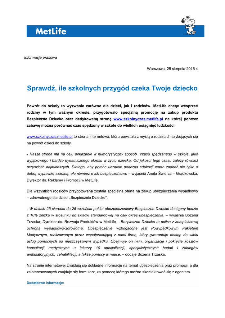 Informacja prasowa Warszawa, 25 sierpnia 2015 r. Sprawdź, ile szkolnych przygód czeka Twoje dziecko Powrót do szkoły to wyzwanie zarówno dla dzieci, jak i rodziców. MetLife chcąc wesprzeć rodziny w tym ważnym okresie, przygotowało specjalną promocję na zakup produktu Bezpieczne Dziecko oraz dedykowaną stronę www.szkolnyczas.metlife.pl na której poprzez zabawę można porównać czas spędzony w szkole do wielkich osiągnięć ludzkości. www.szkolnyczas.metlife.pl to strona internetowa, która powstała z myślą o rodzinach szykujących się na powrót dzieci do szkoły. - Nasza strona ma na celu pokazanie w humorystyczny sposób czasu spędzanego w szkole, jako wyjątkowego i bardzo dynamicznego okresu w życiu dziecka. Od jakości tego czasu zależy również przyszłość najmłodszych. Dlatego, aby pomóc uczniom podczas edukacji warto zadbać nie tylko o dobrą wyprawkę szkolną, ale również o ich bezpieczeństwo – wyjaśnia Aneta Świercz – Grądkowska, Dyrektor ds. Reklamy i Promocji w MetLife. Dla wszystkich rodziców przygotowana została specjalna oferta na zakup ubezpieczenia wypadkowo – zdrowotnego dla dzieci „Bezpiecznie Dziecko”. - W dniach 25 sierpnia do 25 września pakiet ubezpieczeniowy Bezpieczne Dziecko dostępny będzie z 10% zniżką w stosunku do składki standardowej na cały okres ubezpieczenia. – wyjaśnia Bożena Trzaska, Dyrektor ds. Rozwoju Produktów w MetLife – Bezpieczne Dziecko to polisa z kompleksową ochroną wypadkowo-zdrowotną. Ubezpieczenie wzbogacone jest Powypadkowym Pakietem Medycznym, realizowanym przez współpracującą z nami firmę, który gwarantuje dostęp do wielu usług pomocnych po nieszczęśliwym wypadku. Obejmuje on m.in. organizację i pokrycie kosztów konsultacji medycznych u lekarzy 10 specjalizacji, specjalistycznych badań i zabiegów ambulatoryjnych, rehabilitacji, a także pomocy w nauce. – dodaje Bożena Trzaska. Na stronie internetowej znajdują się dokładne informacje na temat ubezpieczenia oraz promocji, a dla zainteresowanych znajduje się formularz, za pomocą którego można skontaktować się z agentem. Dodatkowe informacje: Małgorzata Morańska , tel. +48 518 021 186; [email protected] Ewa Skrzypko, tel. 661 104 534; [email protected] *** MetLife TUnŻiR S.A jest spółką z grupy MetLife, Inc. wiodącej światowej firmy oferującej ubezpieczenia, renty kapitałowe i programy świadczeń pracowniczych. Poprzez swoje spółki zależne i stowarzyszone MetLife zajmuje czołową pozycję na rynkach w Stanach Zjednoczonych, Japonii, Ameryce Łacińskiej, Azji Wschodniej, Europie i na Bliskim Wschodzie. W Polsce MetLife oferuje szeroki zakres ubezpieczeń na życie, zarówno indywidualnych, jak i grupowych, fundusze emerytalne oraz fundusze inwestycyjne. Więcej informacji na stronie www.metlife.pl