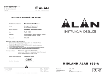 INSTRUKCJA OBS¸UGI MIDLAND ALAN 199-A Producent: Wyprodukowano w: Importer: MIDLAND Chiny Alan Telekomunukacja Sp. z o.o. UWAGA !!! URTiP ZALECA STOSOWANIE ANTEN 5/8 FALI Z PRZECIWWAGAMI POZIOMYMI (FUTURA, SPECTRUM) INFORMACJE DODATKOWE 1. Ukszta∏towanie terenu mo˝e mieç wp∏yw na zasi´g ∏àcznoÊci. 2. Korozja lub Êniedzienie styków anteny mo˝e wp∏ywaç na jakoÊç odbioru i nadawania. 3. Szumy i trzaski mogà powstaç z powodu: - wadliwej instalacji elektrycznej alternatora lub uk∏adu zap∏onowego, - przebiç przewodów wysokiego napi´cia, - iskrzenia nadpalonych styków rozdzielacza iskry, - z∏ego kontaktu szczotek alternatora, - uszkodzenia kondensatora filtrujàcego, - ∏adunków elektrostatycznych na ko∏ach i ogumieniu. DANE TECHNICZNE: OGÓLNE IloÊç kana∏ów ............................................................................................................. 40 AM Zakres cz´stotliwoÊci ...................................... 26.960-27.400 MHz (26.965-27.405) Tolerancja cz´stotliwoÊci ........................................................................................... 0,002% Kontrola cz´stotliwoÊci ................................................................................. p´tla fazowa PLL Zakres temperatur pracy............................................................................ - 10°C do +55°C Zasilanie ..................................................................... 13,8V DC + 10% (minus na masie) Gniazdo antenowe ......................................................................................... 50 Ω, PL-259 Wymiary ..................................................................................................... 190x124x38 mm Masa ............................................................................................................................. 1,2 kg NADAJNIK 1. Bàdê kole˝eƒski ! Moc wyjÊciowa (prze∏àczana).......................................................... 1W / 4W przy 15,2 V Modulacja ........................................................................................................... AM: 80 % Pasmo przenoszenia ......................................................................... od 450 Hz do 2,5 kHz Impedancja obcià˝enia.................................................................................................... 50 Ω Pobór pràdu ................................................................................................................. 2,0 A 2. Niedopuszczalne jest u˝ywanie CB do prowadzenia dzia∏alnoÊci gospodarczej, nadawanie komunikatów, reklam czy te˝ muzyki. ODBIORNIK WYBRANE ZASADY U˚YTKOWANIA RADIA CB 3. Praca radia CB nie mo˝e powodowaç zak∏óceƒ w urzàdzeniach telekomunikacyjnych i powszechnego u˝ytku. 4. Przed rozpocz´ciem nadawania upewnij si´, czy kana∏ jest wolny i twoje wywo∏anie nie przerwie prowadzonej ∏àcznoÊci. 5. Nie przeszkadzaj innymi w nawiàzaniu ∏àcznoÊci. 6. Na has∏o “BREAK” w miar´ szybko pozwól w∏àczyç si´ do rozmowy. 7. Na ka˝dym kanale pierszeƒstwo majà rozmowy na has∏o “RATUNEK”. 8. Kana∏ 9 przeznaczony jest wy∏àcznie do wezwania pomocy (Policja, Pogotowie Ratunkowe, Stra˝ Po˝arna) i prowadzenia akcji ratunkowej. 9. Kana∏ 19 przeznaczony jest zwyczajowo dla kierowców w trasie. Typ uk∏adu superheterodyna z podwójnà przemianà cz´stotliwoÊci Czu∏oÊç ..................................................................... lepiej ni˝ 1,0 µV przy 20 dB SINAD T∏umienie sygna∏u z kan∏u sàsied. ............................................................. 60 dB dla 10 kHz Modulacja skroÊna ......................................................................................... lepiej ni˝ 45 dB Moc wyjÊciowa audio ......................................................................................... 4,5 W max. Cz´stotliwoÊci poÊrednie ........................................................................... 1 - 10.695 MHz ........................................................................... 2 - 455 kHz ................................................................................. WYPOSA˚ENIE W sk∏ad kompletu wchodzà: - radiotelefon - mikrofon - uchwyt mikrofonu - uchwyt do mocowania radia - instrukcja obs∏ugi 10. Bàdê w zgodzie z przepisami wydanymi przez URTiP. 8 1 OBS¸UGA MONTA˚ STACJONARNY MIDLAND ALAN jest przewoênym, 40 kana∏owym radiotelefonem pracujàcym w paÊmie CB. Radio CB MIDLAND ALAN - jak ka˝dy transceiver samochodowy - mo˝e byç wykorzystane do pracy stacjonarnej. Wymaga to stosowanej instalacji antenowej i odpowiedniego zasilania. Nowoczesna konstrukcja z zastosowaniem: - uk∏adu p´tli fazowej zapewniajàcej bardzo precyzyjne sterowanie cz´stotliwoÊcià, - filtrów ceramicznych zapewniajàcych najwy˝szà selektywnoÊç, - uk∏adu blokady szumów SQUELCH z histerezà automatycznie kompensujàcà zaniki sygna∏ów, pozwala spe∏niç wysokie wymagania techniczne. Dodajàc do tego prostà obs∏ug´ i niewygórowanà cen´, otrzymacie Paƒstwo radio dla ka˝dego i na ka˝dà okazj´. MANIPULATORY I WSKAèNIKI 1. GNIAZDO MIKROFONOWE 2. SQUELCH - Blokada szumów. Pokr´t∏o to stosujemy w celu ustawienia progu blokady szumów odbiornika. Blokada jest ustawiona prawid∏owo wówczas, gdy bez obecnoÊci stacji w kanale, w g∏oÊniku nie s∏ychaç szumów, a nawet ma∏y sygna∏ powoduje odblokowanie odbiornika. W∏aÊciwe ustawienie blokady polega na powolnym pokr´caniu ga∏ki w prawo (przy braku jakiegokolwiek sygna∏u na kanale), a˝ do momentu skokowego wyciszenia szumów s∏yszalnych w g∏oÊniku. Dalsze pokr´canie ga∏ki (tak zwane ‘’zaciàganie’’ blokady) powoduje obni˝enie progu czu∏oÊci, a w efekcie uniemo˝liwia odbiór s∏abszych stacji. 3. ON / OFF VOL - W∏àcznik zasilania i regulator si∏y g∏osu. 4. 1W - 4W - Prze∏àcznik mocy wyjÊciowej. 5. UP / DOWN 