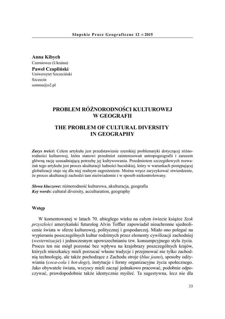 S ł u p s ki e P r a c e G e o g r a f i c z ne 12 • 2015 Anna Kibych Czerniowce (Ukraina) Paweł Czapliński Uniwersytet Szczeciński Szczecin [email protected] PROBLEM RÓŻNORODNOŚCI KULTUROWEJ W GEOGRAFII THE PROBLEM OF CULTURAL DIVERSITY IN GEOGRAPHY Zarys treści: Celem artykułu jest przedstawienie szerokiej problematyki dotyczącej różnorodności kulturowej, która stanowi przedmiot zainteresowań antropogeografii i zarazem główną rację uzasadniającą potrzebę jej kultywowania. Przedmiotem szczegółowych rozważań tego artykułu jest proces akulturacji ludności huculskiej, który w warunkach postępującej globalizacji staje się dla niej realnym zagrożeniem. Można wręcz zaryzykować stwierdzenie, że proces akulturacji zachodzi tam nieświadomie i w sposób niekontrolowany. Słowa kluczowe: różnorodność kulturowa, akulturacja, geografia Key words: cultural diversity, acculturation, geography Wstęp W komentowanej w latach 70. ubiegłego wieku na całym świecie książce Szok przyszłości amerykański futurolog Alvin Toffler zapowiadał nieuchronne ujednolicenie świata w sferze kulturowej, politycznej i gospodarczej. Miało ono polegać na wypieraniu poszczególnych kultur rodzimych przez elementy cywilizacji zachodniej (westernizacja) i jednoczesnym upowszechnianiu tzw. konsumpcyjnego stylu życia. Proces ten nie mógł pozostać bez wpływu na krajobrazy poszczególnych krajów, których mieszkańcy mieli porzucać własne tradycje i przejmować nie tylko zachodnią technologię, ale także pochodzące z Zachodu stroje (blue jeans), sposoby odżywiania (coca-cola i hot-dogs), instytucje i formy organizacyjne życia społecznego. Jako obywatele świata, wszyscy mieli zacząć jednakowo pracować, podobnie odpoczywać, prawdopodobnie także identycznie myśleć. Ta sugestywna, lecz nie dla 33 wszystkich przekonująca myśl została zawarta w rozdziale pod dramatycznym tytułem Śmierć geografii (Toffler 1974). Toffler rozumiał bowiem oczywisty fakt, że racją istnienia geografii jest różnorodność krajobrazowa w skali regionów na wszystkich poziomach hierarchii oraz w skali globalnej. Ujednolicenie kulturowe i upowszechnienie na całym świecie jednakowych metod gospodarowania i wykorzystania zasobów spowodowałoby utratę przez poszczególne regiony i kraje cech specyficznych, właściwej im egzotyki i osobowości. W takiej sytuacji geografia, jako dziedzina, której głównym zadaniem jest rejestrowanie i tłumaczenie zróżnicowania obserwowanego na powierzchni Ziemi, stałaby się zbyteczna. Rozwój wydarzeń w ciągu ostatnich trzech dekad sprawił, że dzisiaj nikt już chyba nie powołuje się na argumentację tofflerowską. W dyskusjach na temat dalszego rozwoju rzeczywistości gospodarczej i politycznej miejsce Tofflera zajęli całkiem inni twórcy, wśród których jednym z najczęściej cytowanych jest inny uczony amerykański, Samuel Huntington. W swoim bestsellerze Zderzenie cywilizacji ukazał, wbrew Tofflerowi, że światu bynajmniej nie grozi uniformizacja kulturowa, wskazując przykłady będące świadectwem procesów prowadzących wręcz w przeciwnym kierunku. Między krajami i regionami narastają dysproporcje rozwojowe, a międzyregionalne rozbieżności w sposobach traktowania wielu problemów zaostrzają się, prowadząc często do krwawych konfliktów. Huntington zauważył, że konflikty te wybuchają najczęściej wzdłuż granic wielkich regionów świata, a ich podłożem nie są już sprzeczności ideologiczne, jak w okresie zimnej wojny, ale zaostrzające się różnice cywilizacyjne między poszczególnymi społecznościami regionalnymi (Huntington 2000). Istnieją dwa sposoby zapobiegania sytuacjom konfliktowym powstającym na styku kultur. Pierwszy polega na separacji odmiennych społeczności za pomocą barier politycznych. Dobrze strzeżone granice i redukcja wzajemnych kontaktów nie zlikwidują wzajemnej nieufności, mogą jednak w pewnych przypadkach być jedynym sposobem na powstrzymanie wybuchu nienawiści i rozlewu krwi. Metoda ta nie sprawdza się na obszarach, których ludność stanowi mozaikę ułożoną z elementów pochodzących z odmiennych kultur, np. w niektórych częściach byłej Jugosławii, gdzie doszło do masowych czystek etnicznych i mordów, lub na terenach byłego Związku Radzieckiego, który pod ideologicznymi hasłami miał integrować społeczności należące do zachodniej cywilizacji z ludami azjatyckimi w ramach struktur państwowych o tradycjach bizantyńsko-turańskich. Ponieważ skuteczne oddzielenie odmiennych i wrogo nastawionych społeczności nie jest możliwe, bardziej atrakcyjny wydaje się drugi sposób zapobiegania narastającym sytuacjom konfliktowym. Zamiast tworzyć bariery, nieprzenikalne kurtyny rozdzielające narody i państwa, należy stymulować wzajemne kontakty, stwarzając sposobność do poznawania się i porozumienia w duchu poszanowania odmienności, co może doprowadzić do wzajemnego zainteresowania, a nawet fascynacji. Idea ta licznym skłóconym społecznościom może wydać się utopijna, ale już zaczyna się sprawdzać w wielu krajach, gdzie tworzy się ruch społeczny zmierzający do zachowania regionalnych i lokalnych dialektów, stylów w obyczajowości, sposobów bycia i form gospodarowania, jakie odzwierciedlają się w krajobrazach. Ruch taki istnieje również w Polsce, a jego źródłem są dawne tradycje oraz fascynacja odmiennością i chęć zachowania odręb34 ności pewnych grup, których istnienie jest utrwalone w polskiej literaturze, muzyce i innych formach sztuki (np. Łemkowie, Cyganie, Kaszubi, Ślązacy, Żydzi, Górale, Białorusini, a także Huculi). Należy podkreślić, że ruch ten ma trwalsze podstawy i jest starszy od aktualnej mody na różnorodność, stanowiącej jeden z elementów subkultur opartych na ideologii New Age. Zwolennicy tego modnego obecnie nurtu najczęściej nie zdają sobie sprawy z tego, że ich nowocze