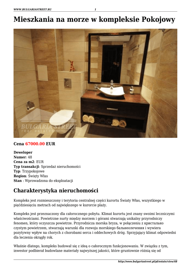 WWW.BULGARIASTREET.RU 1 Mieszkania na morze w kompleksie Pokojowy Cena 67000.00 EUR Deweloper Numer: 48 Cena za m2: EUR Typ transakcji: Sprzedaż nieruchomości Typ: Trzypokojowe Region: Święty Włas Stan : Wprowadzona do eksploatacji Charakterystyka nieruchomości Kompleks jest rozmieszczony i terytoria centralnej części kurortu Światy Włas, wszystkiego w pięćdziesięciu metrach od największego w kurorcie plaży. Kompleks jest przeznaczony dla całorocznego pobytu. Klimat kurortu jest znany swoimi leczniczymi właściwościami. Powietrzne nurty między morzem i górami stwarzają unikalny przyrodniczy fenomen, który oczyszcza powietrze. Przyrodnicza morska bryza, w połączeniu z кристально czystym powietrzem, stwarzają warunki dla rozwoju morskiego бальнеолечения i wywiera pozytywny wpływ na chorych z chorobami serca i oddechowych dróg. Sprzyjający klimat odpowiedni dla leczenia okrągły rok. Właśnie dlatego, kompleks budował się z ideą o całorocznym funkcjonowaniu. W związku z tym, inwestor podbierał budowlane materiały najwyższej jakości, które gruntownie różnią się od http://www.bulgariastreet.pl/pl/estate/view/48 WWW.BULGARIASTREET.RU 2 materiałów, co wykorzystuje się dla budownictwa kompleksów "Sezonowego charakteru". Kompleks jest zbudowany. Na sprzedaż proponują się studia, dwupokojowe mieszkania i таунхаус. Poziom obróbki "pod klucz". Za pragnieniem klienta, inwestor może w całości meblować mieszkanie. Infrastruktura ● ● ● ● ● ● Basen odkryty Elektrczność Woda Okna PVC Meble Przypilnowane terytorium Informacje o regionie Święty Włas - niezwykle sympatyczne malutkie zdrojowe miasteczko, co znalazło przytułek na niewysokich pagórkach w dolinie między górami i morzem ze swoim unikalnym mikroklimatem, чистісіньким morskim i górskim powietrzem i nieprawdopodobnie czystymi piaszczystymi plażami. Ludność kurortu składa 4200 mieszkańców. Lokacja Święty Włas bardzo wygodnie jest rozmieszczony wszystkiego do 3 km od największego bułgarskiego kurortu Słoneczny brzeg, 9 km od historycznego miasta Несебр i 39 km od obwodowego portowego miasta Burgas. Klimat W kurorcie miękki śródziemnomorski klimat z jaskrawie wyrażonymi właściwościami własnego mikroklimatu. W odróżnieniu od innych kurortów na nadbrzeżu, w Świętym Własie, w zimie, temperatury zawsze powyżej na kilka stopniów. Tu, praktycznie, nie istnieje wiatrów zza właściwości miejscowego reliefu - góry kryją zimne potoki z północy i wschodu. Morze jest tu ciepłe i czyste. Kombinacja gór, lasy i morza stwarzają doskonałe warunki dla odpoczynku, pobytu i uzdrowienia. Plaże Piaszczyste plaże kurortu są zawsze przypilnowane i oczyszczone. Plażowa smuga jest rozdzielona na trzy części z ogólną długością 1.5 km najdłuższym, uważa się centralna plaża kurortu, koło której, rozmieszczone niewielka plaża pod nazwą "Camping" i jeszcze jedna plaża "Maryna", który znajduje się obok jachtu przystani Świętego Własa. Infrastruktura Miasto ma w rozporządzeniu własną doskonale rozwiniętą zdrojową i miejską infrastrukturę. W ciągu letniego sezonu, tu pracują liczne restauracje, bary, kawiarnie, dyskoteki, supermarkety, poliklinika, banki, apteki. W jesienno-zimowy okres, tu funkcjonuje część sezonowej infrastruktury razem z szkołami, dziecięcymi ogrodami, bankiem, polikliniką. Popularny kurort Święty Włas podchodzi dla rodzinnego odpoczynku i stałego pobytu w miejskiej części kurortu. http://www.bulgariastreet.pl/pl/estate/view/48 WWW.BULGARIASTREET.RU 3 http://www.bulgariastreet.pl/pl/estate/view/48 WWW.BULGARIASTREET.RU 4 Kontakty Agencja "Ulica Bułgarska" (Bulgaria Street Ltd) Bułgaria m. Burgas, 8000 ul. Mitropolit Simeon 3 Strona: www.bulgariastreet.ru Tel: + 359 894 51 50 51 Tel: + 48 223 906 334 Mail: [email protected] Mail: [email protected] Skype: bulstreet http://www.bulgariastreet.pl/pl/estate/view/48