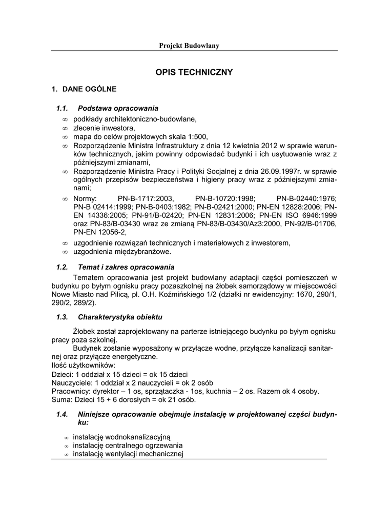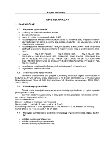 Projekt Budowlany OPIS TECHNICZNY 1. DANE OGÓLNE 1.1. • • • • • • • • Podstawa opracowania podkłady architektoniczno-budowlane, zlecenie inwestora, mapa do celów projektowych skala 1:500, Rozporządzenie Ministra Infrastruktury z dnia 12 kwietnia 2012 w sprawie warunków technicznych, jakim powinny odpowiadać budynki i ich usytuowanie wraz z późniejszymi zmianami, Rozporządzenie Ministra Pracy i Polityki Socjalnej z dnia 26.09.1997r. w sprawie ogólnych przepisów bezpieczeństwa i higieny pracy wraz z późniejszymi zmianami; Normy: PN-B-1717:2003, PN-B-10720:1998; PN-B-02440:1976; PN-B 02414:1999; PN-B-0403:1982; PN-B-02421:2000; PN-EN 12828:2006; PNEN 14336:2005; PN-91/B-02420; PN-EN 12831:2006; PN-EN ISO 6946:1999 oraz PN-83/B-03430 wraz ze zmianą PN-83/B-03430/Az3:2000, PN-92/B-01706, PN-EN 12056-2, uzgodnienie rozwiązań technicznych i materiałowych z inwestorem, uzgodnienia międzybranżowe. 1.2. Temat i zakres opracowania Tematem opracowania jest projekt budowlany adaptacji części pomieszczeń w budynku po byłym ognisku pracy pozaszkolnej na żłobek samorządowy w miejscowości Nowe Miasto nad Pilicą, pl. O.H. Koźmińskiego 1/2 (działki nr ewidencyjny: 1670, 290/1, 290/2, 289/2). 1.3. Charakterystyka obiektu Żłobek został zaprojektowany na parterze istniejącego budynku po byłym ognisku pracy poza szkolnej. Budynek zostanie wyposażony w przyłącze wodne, przyłącze kanalizacji sanitarnej oraz przyłącze energetyczne. Ilość użytkowników: Dzieci: 1 oddział x 15 dzieci = ok 15 dzieci Nauczyciele: 1 oddział x 2 nauczycieli = ok 2 osób Pracownicy: dyrektor – 1 os, sprzątaczka - 1os, kuchnia – 2 os. Razem ok 4 osoby. Suma: Dzieci 15 + 6 dorosłych = ok 21 osób. 1.4. • • • Niniejsze opracowanie obejmuje instalację w projektowanej części budynku: instalację wodnokanalizacyjną instalację centralnego ogrzewania instalację wentylacji mechanicznej Projekt Budowlany 2. INSTALACJE WOD-KAN 2.1. Instalacje wodne 2.1.1. Bilans zimnej wody Żłobek dla 15 dzieci jednostkowe zużycie wody dla żłobka - 130 dm3/doba/dziecko - 3,9 m3/m-c/dziecko Dobowe zapotrzebowanie na wodę Qmax d = [130 dm3/doba *15]: 1000 = 1,95 m3/doba Miesięczne zapotrzebowanie na wodę Qmax m-c = [3,9 m3/m-c *15]: = 58,5 m3/m-c Obliczenie sekundowego przepływu wody przeprowadzono zgodnie z normą PN 92 / B-01706: Nazwa przyboru Umywalka Natrysk Zlewozmywak Zmywarka Wyparzacz W.C. Basen gastronomiczny qn Ilość urządzeń dm3/s 0,14 7 0,30 1 0,14 2 0,15 1 0,15 1 0,13 4 0,14 1 Σqn dm3/s 0,98 0,30 0,28 0,15 0,15 0,52 0,14 Suma normatywnych wypływów z punktów czerpalnych dla potrzeb projektowanej części budynku wynosi: q n = 2,52 dm3/s Przepływ obliczeniowy dla projektowanej części budynku wynosi: q = 4,4 ( Σ qn)0,27 -3,41 = 4,4 (2,52)0,27 -3,41 = 2,23 dm3/s= 8,05 m3/h 2.1.2. Instalacja wody zimnej Woda zostanie doprowadzona z gminnego wodociągu do pomieszczenia kotłowni. W celu rozliczeń na przyłączu projektuje się wodomierz sprzężony o średnicy nominalnej DN 50/15 mm, ciągłym strumieniu objętości Qnom = 16/1,6 m3/h, umieszczony Projekt Budowlany w kotłowni. Zarówno przed jak i za zestawem wodomierzowym należy zamontować zawór odcinający wodociągowy PN10 o śr. nominalnej DN50. Przed wodomierzem należy zamontować filtr siatkowy dn50, za wodomierzem należy zamontować zawór antyskażeniowy dn50 typ EA. Wodomierz zamontować należy w sposób gwarantujący poprawny pomiar zużycia wody tj. zgodny z wg PN-B-10720:1998. Projektowana instalacja wody zimnej doprowadzać będzie wodę do węzłów sanitarnych, umywalni i natrysków, pomieszczeń porządkowych, kuchni i zmywalni naczyń, pomieszczenia technicznego; wyposażonych w zlewozmywaki jedno i dwukomorowe, umywalki, zmywarki, natryski, urządzenie płuczące do w.c., zlewy porządkowe, zawory ze złączką do węża. Instalacje wykonane będą z rur z polipropylenu typu 3 PN20. Wszystkie przewody zostaną zaizolowane izolacją z poliuretanu w płaszczu wraz z kolanami o grubości zgodnej z Rozporządzeniem Ministra Infrastruktury w sprawie: ”Warunków technicznych jakim powinny odpowiadać budynki i ich usytuowanie wraz z późniejszymi zmianami”. Przewody głównie ułożone będą w posadzce. Na podejściach pod przybory w bloku kuchennym i zawory ze złączką do węża zaprojektowano zawory antyskażeniowe typ HA. Przejście przez przegrody budowlane prowadzić należy w rurach ochronnych i uszczelnić pianką poliuretanową. Po wykonaniu, instalację wody zimnej należy poddać płukaniu, dezynfekcji oraz próbie ciśnieniowej 10 bar. W pomieszczeniu kotłowni przewiduje się punkt poboru wody od celów higieniczno-sanitarnych, punkt ten należy zabezpieczyć zaworem antyskażeniowym typu EA. 2.1.3. Instalacja wody ciepłej i cyrkulacji Ciepła woda użytkowa przygotowywana będzie centralnie w kotłowni zlokalizowanej w budynku w podgrzewaczu pojemnościowym cwu.( projekt kotłowni znajduje się poza zakresem niniejszego opracowania) W celu zapewnienia stałej temperatury wody ciepłej w punktach poboru, zaprojektowano instalację cyrkulacji ciepłej wody. Instalacja wody ciepłej doprowadzać będzie wodę do węzłów sanitarnych, kuchni, pom. gosp., umywalni i natrysku przy sali zabaw dla dzieci; wyposażonych w: zlewy, zlewozmywaki, umywalki i natrysk. Natrysk i umywalki w zespole sanitarnym dla dzieci zaopatrywane będą w wodę zmieszaną, przygotowywaną przez mieszacz termostatyczny zamontowany w szafce ochronnej na wysokości min. 160 cm od podłogi . Źródłem ciepłej wody będzie zasobnik ciepłej wody, zlokalizowany w pomieszczeniu kotłowni. Zabezpieczenie pojemnościowego zasobnika ciepłej wody należy wykonać wg PN-B-02440:1976 z urządzeniami zlokalizowanymi na rurociągu zimnej wody. Przewody głównie ułożone będą w posadzce. Instalacje wykonane będą z rur z polipropylenu typu 3 PN20 STABI. Wszystkie przewody zostaną zaizolowane izolacj