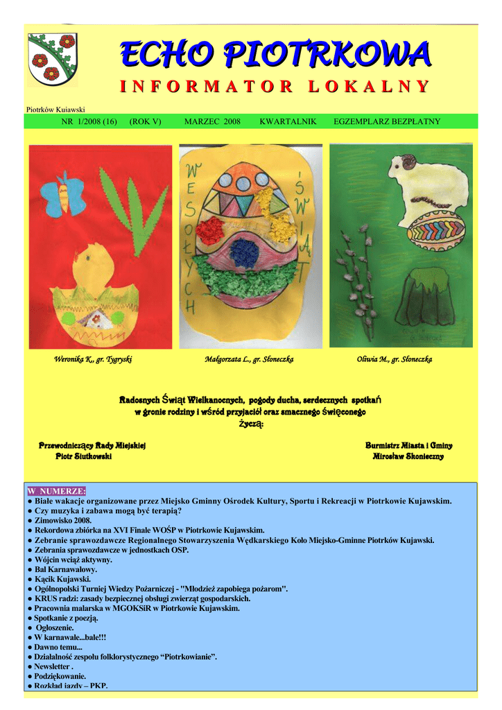 + ECHO PIOTRKOWA INFORMATOR LOKALNY Piotrków Kujawski NR 1/2008 (16) (ROK V) Weronika K., gr. Tygryski MARZEC 2008 KWARTALNIK Małgorzata L., gr. Słoneczka EGZEMPLARZ BEZPŁATNY Oliwia M., gr. Słoneczka Radosnych Świąt Wielkanocnych, pogody ducha, serdecznych spotkań w gronie rodziny i wśród przyjaciół oraz smacznego święconego życzą: Przewodniczący Rady Miejskiej Piotr Siutkowski Burmistrz Miasta i Gminy Mirosław Skonieczny W NUMERZE: ● Białe wakacje organizowane przez Miejsko Gminny Ośrodek Kultury, Sportu i Rekreacji w Piotrkowie Kujawskim. ● Czy muzyka i zabawa mogą być terapią? ● Zimowisko 2008. ● Rekordowa zbiórka na XVI Finale WOŚP w Piotrkowie Kujawskim. ● Zebranie sprawozdawcze Regionalnego Stowarzyszenia Wędkarskiego Koło Miejsko-Gminne Piotrków Kujawski. ● Zebrania sprawozdawcze w jednostkach OSP. ● Wójcin wciąż aktywny. ● Bal Karnawałowy. ● Kącik Kujawski. ● Ogólnopolski Turniej Wiedzy Pożarniczej - ''Młodzież zapobiega pożarom''. ● KRUS radzi: zasady bezpiecznej obsługi zwierząt gospodarskich. ● Pracownia malarska w MGOKSiR w Piotrkowie Kujawskim. ● Spotkanie z poezją. ● Ogłoszenie. ● W karnawale...bale!!! ● Dawno temu... ● Działalność zespołu folklorystycznego “Piotrkowianie”. ● Newsletter . ● Podziękowanie. ● Rozkład jazdy – PKP. BIAŁE WAKACJE ORGANIZOWANE PRZEZ MIEJSKO GMINNY OŚRODEK KULTURY, SPORTU I REKREACJI W PIOTRKOWIE KUJAWSKIM Miejsko Gminny Ośrodek Kultury, Sportu i Rekreacji w Piotrkowie Kujawskim podczas tegorocznych ferii zimowych zorganizował dla dzieci wiele ciekawych atrakcji. W pierwszym dniu wakacji zimowych odbył się konkurs plastyczny wraz z warsztatami malarskimi prowadzonymi przez Pana Marka Marynowskiego Dyrektora MGOKSiR w Piotrkowie Kujawskim pt. „Piotrków w Zimowej Szacie”. W zabawie wzięło udział liczne grono dzieci z miasta i okolic. Wszystkie dzieci podeszły bardzo profesjonalnie do zadania. Namalowane przez nich prace miały ciekawy charakter i kolorystykę. W związku z powyższym komisja podjęła decyzję nagrodzenia wszystkich prac. W tym dniu dużym zainteresowaniem cieszyła się również nauka gry w szachy i warcaby. Następnego dnia w Sali OSP odbył się spektakl teatralny ART-BI z Krakowa. Teatrzyk dziecięcy wystawił sztukę pt. „Królowa Śniegu”. Aktorzy teatralni wesoło zabawiali najmłodszych zapraszając ich do udziału w przedstawieniu na scenie. Spektakl bardzo podobał się licznie zgromadzonej publiczności. Dzieci były zadowolone, uśmiechnięte i radosne. Dnia 30 stycznia odbył się turniej tenisa stołowego dla dzieci w wieku od 9 do 13 lat. W zawodach wzięło udział dużo uczestników, którzy zostali nagrodzone. Zwycięzcą został Jakub Sowada, drugie miejsce zajęła Daria Sobiesierska, a trzecie Jakub Depta. Czwartego dnia ferii najciekawszą atrakcją okazały się kalambury. Dzieciom nie zabrakło wytrwałości w odgadywaniu haseł. W tej konkurencji wszyscy uczestnicy zostali nagrodzeni. W tym dniu odbyły się również zajęcia świetlicowe, zabawy, gry planszowe oraz zawody w kręceniu Hula-Hop i żonglerka piłką. Najlepsi zostali nagrodzeni. Pierwszy tydzień ferii zakończył się konkursem w kategorii tańca i muzyki. Dzieci wzięły liczny udział, nie odczuwały tremy przed wyjściem na scenę. Komisja wyłoniła zwycięzców nagradzając ich upominkami. Wszystkim uczestnikom zabawy miło i przyjemnie upłynął czas. Drugi tydzień ferii rozpoczął się turniejem Tenisa Stołowego dla dzieci z gimnazjum. Zgłosiło się wielu chętnych, walka była zacięta. Najlepszym uczestnikiem okazał się Michał Siutkowski, który zajął pierwsze miejsce, tuż za nim był Sebastian Sobiesierski i Dariusz Ornat. W godzinach popołudniowych odbył się bal przebierańców dla dzieci. Dzieci przebrały się za bajkowe postacie. Trzy najlepsze kostiumy zostały nagrodzone. Atrakcją balu był konkurs tańca i śpiewu, którego uczestnicy otrzymali miłe upominki. Kolejnego dnia ferii, MGOKSiR zorganizował wyjazd na basen do Mogilna. Był to strzał w dziesiątkę, lista wolnych miejsc zapełniła się bardzo szybko. Dzieci korzystały ze zjeżdżalni, jakuzzi, niektóre uczyły się pływać. Wszystkie dzieci wracały z uśmiechem na twarzy i z nadzieją, że taki wyjazd odbędzie się w przyszłym roku. Mimo niesprzyjającej pogody, ferie zimowe zakończyły się wspólnym pieczeniem kiełbasek i ziemniaków przy ognisku. Atmosferę rozgrzewały konkursy z nagrodami dla licznie przybyłych dzieci. Pomimo kończącego się wypoczynku uśmiech z twarzy dzieci nie znikał. Tegoroczne ferie zimowe zorganizowane przez MGOKSiR upłynęły w miłej, radosnej atmosferze. Dzieci przybywały licznie na zimowiska, chętnie brały udział w przygotowanych atrakcjach. Miejsko Gminny Ośrodek Kultury, Sportu i Rekreacji planuje się już następne takie, w których mamy nadzieję weźmie udział jeszcze większa liczba dzieci. Mirosław Czynsz Czy muzyka i zabawa mogą być terapią? Jesienią 2007 r., Szkoła Podstawowa w Piotrkowie Kujawskim, jako placówka zajmująca się kształceniem integracyjnym, otrzymała wysokiej klasy, nowoczesny sprzęt ułatwiający kształcenie uczniów ze specjalnymi potrzebami edukacyjnymi. W ramach projektu Ministerstwa Edukacji Narodowej wdrażanego przez firmę Young Digital Planet SA z inicjatywy Instytutu Fizjologii i Patologii Słuchu współfinansowanego przez Unię Europejską została wyposażona w sprzęt do terapii logopedycznej oraz sprzęt wspomagający terapię zaburzeń psychosomatycznych: komputer, drukarkę laserową, multimedialne programy logopedyczne, słuchawki, mikrofon, pomoce dydaktyczne. Terapię prowadzi przeszkolony logopeda mgr Justyna Dorosz. Young Digital Planet SA to światowej klasy producent komputerowych programów edukacyjnych (seria EuroPlus+, eduROM) oraz najpopularniejszych w Polsce programów wspomagających terapię logopedyczną, m.in. Lo