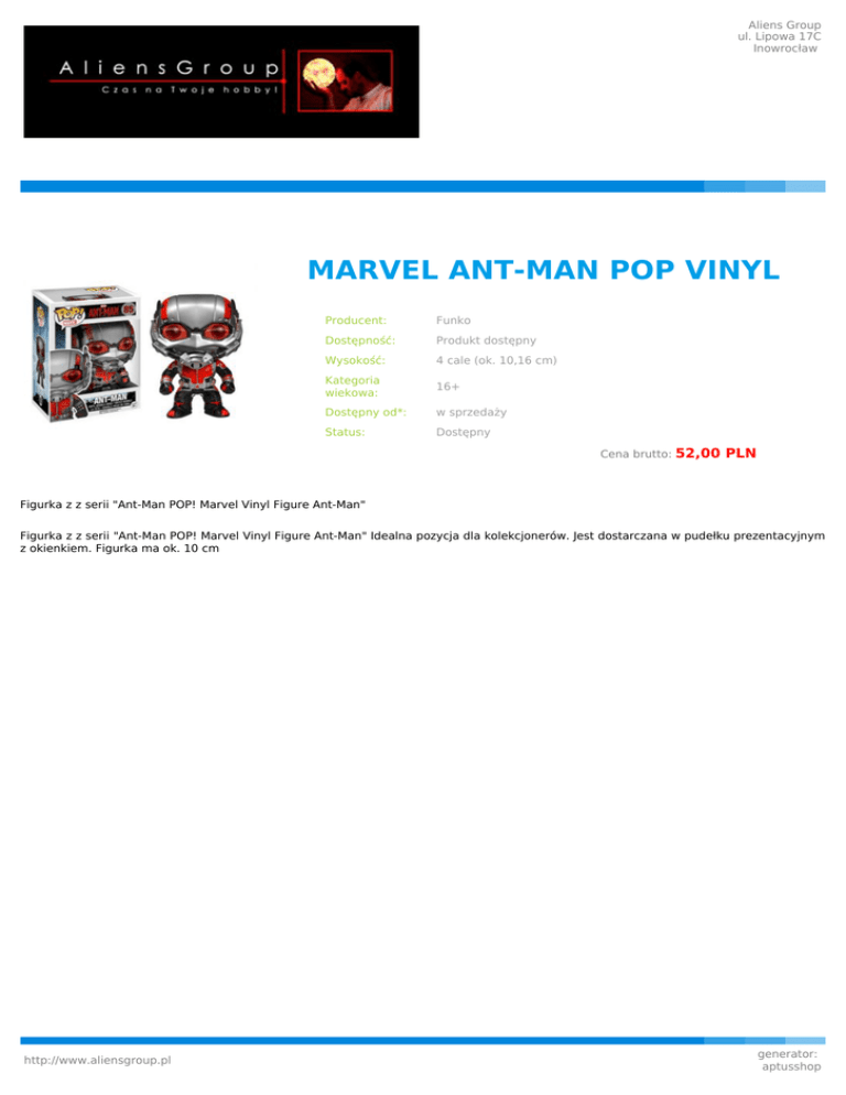Aliens Group ul. Lipowa 17C Inowrocław MARVEL ANT-MAN POP VINYL Producent: Funko Dostępność: Produkt dostępny Wysokość: 4 cale (ok. 10,16 cm) Kategoria wiekowa: 16+ Dostępny od*: w sprzedaży Status: Dostępny Cena brutto: 52,00 PLN Figurka z z serii "Ant-Man POP! Marvel Vinyl Figure Ant-Man" Figurka z z serii "Ant-Man POP! Marvel Vinyl Figure Ant-Man" Idealna pozycja dla kolekcjonerów. Jest dostarczana w pudełku prezentacyjnym z okienkiem. Figurka ma ok. 10 cm http://www.aliensgroup.pl generator: aptusshop