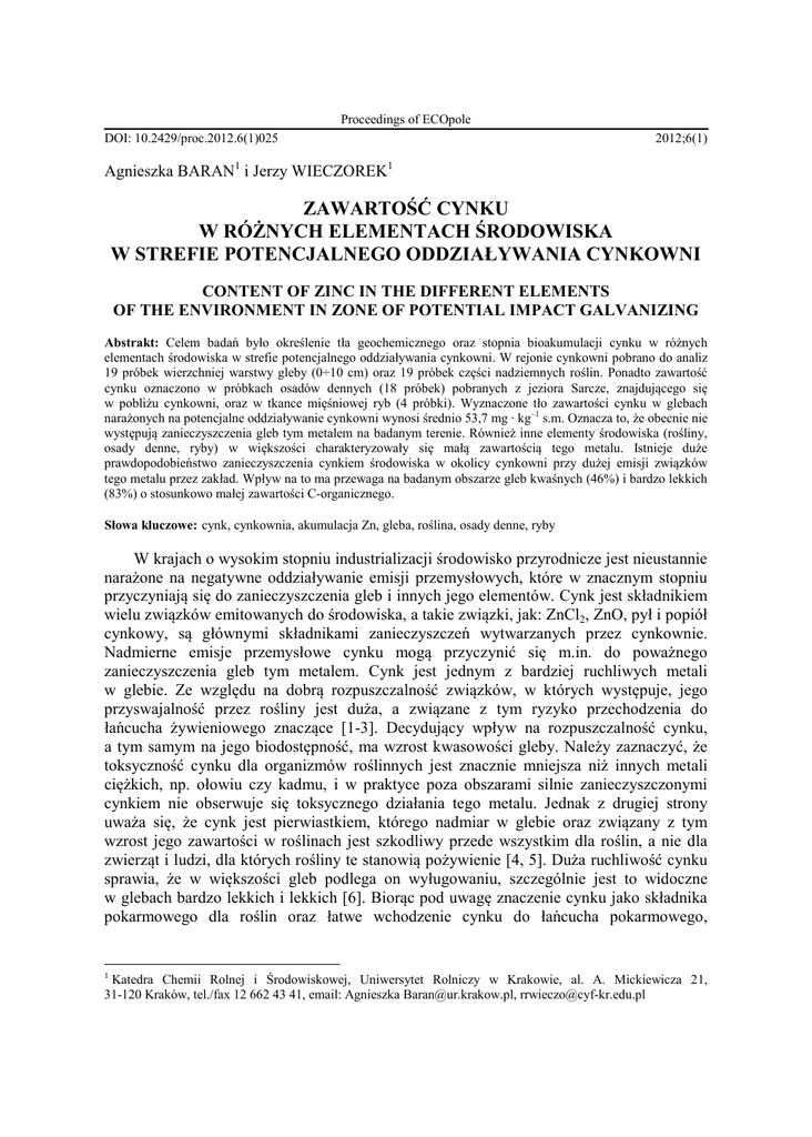 Proceedings of ECOpole DOI: 10.2429/proc.2012.6(1)025 2012;6(1) Agnieszka BARAN1 i Jerzy WIECZOREK1 ZAWARTOŚĆ CYNKU W RÓŻNYCH ELEMENTACH ŚRODOWISKA W STREFIE POTENCJALNEGO ODDZIAŁYWANIA CYNKOWNI CONTENT OF ZINC IN THE DIFFERENT ELEMENTS OF THE ENVIRONMENT IN ZONE OF POTENTIAL IMPACT GALVANIZING Abstrakt: Celem badań było określenie tła geochemicznego oraz stopnia bioakumulacji cynku w różnych elementach środowiska w strefie potencjalnego oddziaływania cynkowni. W rejonie cynkowni pobrano do analiz 19 próbek wierzchniej warstwy gleby (0÷10 cm) oraz 19 próbek części nadziemnych roślin. Ponadto zawartość cynku oznaczono w próbkach osadów dennych (18 próbek) pobranych z jeziora Sarcze, znajdującego się w pobliżu cynkowni, oraz w tkance mięśniowej ryb (4 próbki). Wyznaczone tło zawartości cynku w glebach narażonych na potencjalne oddziaływanie cynkowni wynosi średnio 53,7 mg · kg–1 s.m. Oznacza to, że obecnie nie występują zanieczyszczenia gleb tym metalem na badanym terenie. Również inne elementy środowiska (rośliny, osady denne, ryby) w większości charakteryzowały się małą zawartością tego metalu. Istnieje duże prawdopodobieństwo zanieczyszczenia cynkiem środowiska w okolicy cynkowni przy dużej emisji związków tego metalu przez zakład. Wpływ na to ma przewaga na badanym obszarze gleb kwaśnych (46%) i bardzo lekkich (83%) o stosunkowo małej zawartości C-organicznego. Słowa kluczowe: cynk, cynkownia, akumulacja Zn, gleba, roślina, osady denne, ryby W krajach o wysokim stopniu industrializacji środowisko przyrodnicze jest nieustannie narażone na negatywne oddziaływanie emisji przemysłowych, które w znacznym stopniu przyczyniają się do zanieczyszczenia gleb i innych jego elementów. Cynk jest składnikiem wielu związków emitowanych do środowiska, a takie związki, jak: ZnCl2, ZnO, pył i popiół cynkowy, są głównymi składnikami zanieczyszczeń wytwarzanych przez cynkownie. Nadmierne emisje przemysłowe cynku mogą przyczynić się m.in. do poważnego zanieczyszczenia gleb tym metalem. Cynk jest jednym z bardziej ruchliwych metali w glebie. Ze względu na dobrą rozpuszczalność związków, w których występuje, jego przyswajalność przez rośliny jest duża, a związane z tym ryzyko przechodzenia do łańcucha żywieniowego znaczące [1-3]. Decydujący wpływ na rozpuszczalność cynku, a tym samym na jego biodostępność, ma wzrost kwasowości gleby. Należy zaznaczyć, że toksyczność cynku dla organizmów roślinnych jest znacznie mniejsza niż innych metali ciężkich, np. ołowiu czy kadmu, i w praktyce poza obszarami silnie zanieczyszczonymi cynkiem nie obserwuje się toksycznego działania tego metalu. Jednak z drugiej strony uważa się, że cynk jest pierwiastkiem, którego nadmiar w glebie oraz związany z tym wzrost jego zawartości w roślinach jest szkodliwy przede wszystkim dla roślin, a nie dla zwierząt i ludzi, dla których rośliny te stanowią pożywienie [4, 5]. Duża ruchliwość cynku sprawia, że w większości gleb podlega on wyługowaniu, szczególnie jest to widoczne w glebach bardzo lekkich i lekkich [6]. Biorąc pod uwagę znaczenie cynku jako składnika pokarmowego dla roślin oraz łatwe wchodzenie cynku do łańcucha pokarmowego, 1 Katedra Chemii Rolnej i Środowiskowej, Uniwersytet Rolniczy w Krakowie, al. A. Mickiewicza 21, 31-120 Kraków, tel./fax 12 662 43 41, email: Agnieszka [email protected], [email protected] 194 Agnieszka Baran i Jerzy Wieczorek zrozumiały jest fakt szerokiego i interdyscyplinarnego zainteresowania się występowaniem i mobilnością cynku w środowisku przyrodniczym. Celem badań było określenie tła geochemicznego oraz stopnia bioakumulacji cynku w różnych elementach środowiska w strefie potencjalnego oddziaływania cynkowni. Materiał i metody Badania terenowe przeprowadzono w lipcu 2010 r. na terenie gminy Trzcianka, w rejonie potencjalnego oddziaływania wybudowanej cynkowni, w której produkcja do końca 2011 r. nie została rozpoczęta. Zgodnie z Decyzją środowiskową [7], projektowana roczna wielkość produkcji zakładu, prowadzonej metodą cynkowania ogniowego, będzie wynosić od 25 000 do 40 000 Mg stali, przy maksymalnej wydajności sięgającej 10 Mg · h–1. Gmina Trzcianka leży w północno-zachodniej części Wielkopolski, na pograniczu Pojezierza Wałeckiego i Pradoliny Nadnoteckiej, w powiecie czarnkowsko-trzcianeckim. Jest to teren o dużych walorach przyrodniczo-turystycznych, którego ponad 50% powierzchni zajmują lasy, a zachodnią i środkową część urozmaicają liczne jeziora. Wschodni rejon gminy, oddalony o niecałe 10 km od inwestycji, należy do obszaru Natura 2000 [8]. Rys. 1. Schemat lokalizacji miejsc pobrania próbek terenu wokół cynkowni w Trzciance Fig. 1. Scheme of sampling location of the area around the zinc factory in Trzcianka Do badań pobrano próbki wierzchniej warstwy gleby (0÷10 cm), a także części nadziemnych roślin jedno- i dwuliściennych z 19 punktów (rys. 1) oddalonych od środka terenu cynkowni o 0,5, 1 i 5 km w stronę głównych kierunków geograficznych (N, E, S, W) oraz położonych w odległości 0,7 i 1,4 km w kierunkach pośrednich pierwszego stopnia Zawartość cynku w różnych elementach środowiska w strefie … 195 (NE, SE, SW, NW). Ponadto pozyskano do badań ryby (tkanka mięśniowa od 4 osobników) i osad denny (18 próbek) z jeziora Sarcze, znajdującego się w pobliżu zakładu. Miejsca pobrania próbek lokalizowano przy użyciu odbiornika satelitarnego GPSMap 62s. W zgromadzonym materiale glebowym wykonano oznaczenia podstawowych właściwości fizyczno-chemicznych: skład garnulomteryczny (metoda Casagrande’a w modyfikacji Prószyńskiego), odczyn (potencjometrycznie w zawiesinie 1 mol · dm–3 KCl) i zawartość C-organicznego (metoda Tiurina). W celu określenia całkowitej zawartości cynku materiał glebowy oraz osady denne roztwarzano w mieszaninach kwa