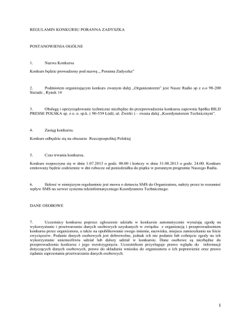 REGULAMIN KONKURSU PORANNA ZADYSZKA POSTANOWIENIA OGÓLNE 1. Nazwa Konkursu Konkurs będzie prowadzony pod nazwą „ Poranna Zadyszka” 2. Podmiotem organizującym konkurs zwanym dalej „Organizatorem” jest Nasze Radio sp z o.o 98-200 Sieradz , Rynek 14 3. Obsługę i oprzyrządowanie techniczne niezbędne do przeprowadzenia konkursu zapewnia Spółka BILD PRESSE POLSKA sp. z o. o. sp.k. ( 90-539 Łódź, ul. Żwirki ) – zwana dalej „Koordynatorem Technicznym”. 4. Zasięg konkursu. Konkurs odbędzie się na obszarze Rzeczpospolitej Polskiej 5. Czas trwania konkursu. Konkurs rozpoczyna się w dniu 1.07.2013 o godz. 00.00 i kończy w dniu 31.08.2013 o godz. 24.00. Konkurs emitowany będzie codziennie w dni robocze od poniedziałku do piątku w porannym programie Naszego Radia. 6. Ilekroć w niniejszym regulaminie jest mowa o dotarciu SMS do Organizatora, należy przez to rozumieć wpływ SMS na serwer systemu teleinformatycznego Koordynatora Technicznego. DANE OSOBOWE 7. Uczestnicy konkursu poprzez zgłoszenie udziału w konkursie automatycznie wyrażają zgodę na wykorzystanie i przetwarzanie danych osobowych uzyskanych w związku z organizacją i przeprowadzeniem konkursu przez organizatora, a także na opublikowanie swego imienia, nazwiska, miejsca zamieszkania na liście zwycięzców. Podanie danych osobowych jest dobrowolne, jednak ich nie podanie lub cofnięcie zgody na ich wykorzystanie uniemożliwia udział lub dalszy udział w konkursie. Dane osobowe są niezbędne do przeprowadzenia konkursu i jego rozstrzygnięcia. Uczestnikom przysługuje prawo wglądu do informacji dotyczących danych osobowych, prawo do składania wniosku do organizatora o ich poprawienie oraz prawo żądania zaprzestania przetwarzania danych osobowych. 1 UCZESTNICY KONKURSU 8. Uczestnikiem konkursu, na warunkach określonych w regulaminie, może być każda osoba fizyczna, pełnoletnia ( z zastrzeżeniem pkt.9 regulaminu ), zamieszkała na terenie Polski, która spełni warunki regulaminu. 9. Uczestnikami konkursu nie mogą być pracownicy: - Organizatora i sponsorów konkursu oraz członkowie ich najbliższej rodziny ( tj. małżonkowie, dzieci, wnuki, rodzeństwo, rodzice ) - firmy BILD PRESSE POLSKA Sp. z o.o. sp.k. 10. Wzięcie udziału w konkursie jest równoznaczne: - z akceptacją regulaminu konkursu, - ze zobowiązaniem się do przestrzegania zasad określonych w regulaminie, - z potwierdzeniem, że uczestnik spełnia wszystkie warunki niezbędne do wzięcia udział w konkursie. KOMISJA KONKURSOWA 11. W celu zapewnienia prawidłowej organizacji i przebiegu konkursu, a w szczególności w celu dokonania oceny prawidłowości zgłoszeń do konkursu oraz dokonania wyboru zwycięzców konkursu, Organizator powoła 2 osobową Komisję Konkursową. W skład Komisji Konkursowej wejdą osoby wytypowane przez Organizatora. PRZEBIEG KONKURSU 12. Konkurs przebiega w dwóch etapach. Pierwszy etap – zgłoszeniowy. Uczestnik zgłasza się do konkursu poprzez wysłanie smsa o treści nasze zadyszka na numer 72601 wraz z odpowiedzią na pytanie zgłoszeniowe – codziennie inne. Uczestnik może wysłać dowolną liczbę smsów zgłoszeniowych. Wysłanie smsa zgłoszeniowego gwarantuje udział w bieżącej edycji konkursu. Aby wziąć udział w konkursie w kolejnych edycjach należy wysyłać kolejne smsy zgłoszeniowe. Drugi etap – wybór uczestnika konkursu Do udziału w konkursie zakwalifikowany zostanie uczestnik, który udzieli najciekawszej odpowiedzi na pytanie zgłoszeniowe. Wyboru dokona Komisja Konkursowa. Trzeci etap – odpowiedzi na pytania na antenie Naszego Radia Z tak wybranym uczestnikiem konkursu dziennikarz Naszego Radia skontaktuje się telefonicznie. 2 Połączenie z uczestnikiem konkursu odbywa poprzez wykonanie połączenia telefonicznego na określony numer telefonu. Za każdym razem czas oczekiwania na połączenie wynosi minimum 4 sygnały. W przypadku braku odpowiedzi, sygnału zajętości lub zgłoszenia się skrzynki pocztowej (poczty głosowej) osoba wysyłająca SMS nie jest już brana pod uwagę w konkursie i następuje połączenie z kolejnym numerem (wybrany zostanie kolejny numer z najciekawszą odpowiedzią na pytanie zgłoszeniowe). W przypadku rozłączenia połączenia po emisji konkursu, próba ponownego połączenia podejmowana jest raz, ponownie według opisanej procedury. Zadaniem osoby, do której zadzwonimy jest odpowiadanie na pytania. Pytań może być maksymalnie 9. Za każdą prawidłową odpowiedź uczestnik konkursu otrzymuje 10 zł. Dodatkowe 10 złotych otrzymuje na początku za najciekawszą odpowiedź pytanie zgłoszeniowe. Uczestnik przed zadaniem kolejnego pytania decyduje czy gra dalej. Uczestnik może zrezygnować z dalszego udziału w konkursie po udzieleniu prawidłowej odpowiedzi na pytanie i nie później niż przed zadaniem kolejnego pytania przez dziennikarza. W przypadku błędnej odpowiedzi cała suma dotychczasowej wygranej przepada (łącznie z wygraną 10 złotych za odpowiedź z smsa). Każdego dnia do wygrania jest kwota 100 złotych. W przypadku, gdy uczestnik w trakcie gry przerywa dalsze uczestnictwo wygrywa kwotę wyliczoną wg wzoru (prawidłowe odpowiedzi x 10 zł + 10 zł za prawidłową odpowiedz na smsa. Różnica kwoty pomiędzy stawką dzienną konkursu 100 zł, a kwotą wygraną przez uczestnika konkursu danego dnia – przechodzi do puli nagród na dzień następny. Kwota wygranej w kolejnej edycji konkurs za ostatnie 9 pytanie ulega podwyższeniu o tę różnicę. Kumulacja może odbywać się przez kilka kolejnych dni, do momentu gdy uczestnik konkursu odpowie prawidłowo na 9 kolejnych pytań. Kumulację wyliczamy w/g wzoru (kwota z poprzednich dni + 10 zł za każdą prawidłową odpowiedź z bieżącego dnia (90 zł) + 10 zł za najciekawszą odpowiedź z pytania smsowego) 13. Uczestnik zgłasza chęć wzięcia udziału w konkursie poprzez wysłanie smsa pod numer 72601, w którym wpisze treść nasze zadyszka i 
