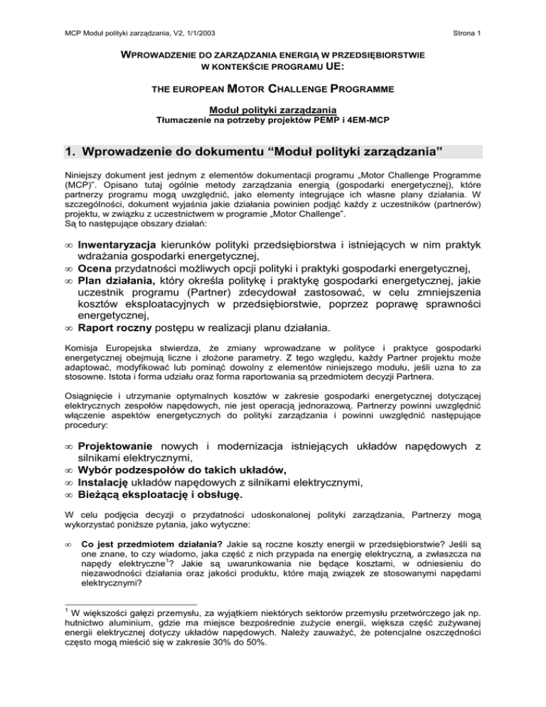 MCP Moduł polityki zarządzania, V2, 1/1/2003 Strona 1 WPROWADZENIE DO ZARZĄDZANIA ENERGIĄ W PRZEDSIĘBIORSTWIE W KONTEKŚCIE PROGRAMU UE: THE EUROPEAN MOTOR CHALLENGE PROGRAMME Moduł polityki zarządzania Tłumaczenie na potrzeby projektów PEMP i 4EM-MCP 1. Wprowadzenie do dokumentu “Moduł polityki zarządzania” Niniejszy dokument jest jednym z elementów dokumentacji programu „Motor Challenge Programme (MCP)”. Opisano tutaj ogólnie metody zarządzania energią (gospodarki energetycznej), które partnerzy programu mogą uwzględnić, jako elementy integrujące ich własne plany działania. W szczególności, dokument wyjaśnia jakie działania powinien podjąć każdy z uczestników (partnerów) projektu, w związku z uczestnictwem w programie „Motor Challenge”. Są to następujące obszary działań: • Inwentaryzacja kierunków polityki przedsiębiorstwa i istniejących w nim praktyk wdrażania gospodarki energetycznej, • Ocena przydatności możliwych opcji polityki i praktyki gospodarki energetycznej, • Plan działania, który określa politykę i praktykę gospodarki energetycznej, jakie uczestnik programu (Partner) zdecydował zastosować, w celu zmniejszenia kosztów eksploatacyjnych w przedsiębiorstwie, poprzez poprawę sprawności energetycznej, • Raport roczny postępu w realizacji planu działania. Komisja Europejska stwierdza, że zmiany wprowadzane w polityce i praktyce gospodarki energetycznej obejmują liczne i złożone parametry. Z tego względu, każdy Partner projektu może adaptować, modyfikować lub pominąć dowolny z elementów niniejszego modułu, jeśli uzna to za stosowne. Istota i forma udziału oraz forma raportowania są przedmiotem decyzji Partnera. Osiągnięcie i utrzymanie optymalnych kosztów w zakresie gospodarki energetycznej dotyczącej elektrycznych zespołów napędowych, nie jest operacją jednorazową. Partnerzy powinni uwzględnić włączenie aspektów energetycznych do polityki zarządzania i powinni uwzględnić następujące procedury: • Projektowanie nowych i modernizacja istniejących układów napędowych z silnikami elektrycznymi, • Wybór podzespołów do takich układów, • Instalację układów napędowych z silnikami elektrycznymi, • Bieżącą eksploatację i obsługę. W celu podjęcia decyzji o przydatności udoskonalonej polityki zarządzania, Partnerzy mogą wykorzystać poniższe pytania, jako wytyczne: • 1 Co jest przedmiotem działania? Jakie są roczne koszty energii w przedsiębiorstwie? Jeśli są one znane, to czy wiadomo, jaka część z nich przypada na energię elektryczną, a zwłaszcza na 1 napędy elektryczne ? Jakie są uwarunkowania nie będące kosztami, w odniesieniu do niezawodności działania oraz jakości produktu, które mają związek ze stosowanymi napędami elektrycznymi? W większości gałęzi przemysłu, za wyjątkiem niektórych sektorów przemysłu przetwórczego jak np. hutnictwo aluminium, gdzie ma miejsce bezpośrednie zużycie energii, większa część zużywanej energii elektrycznej dotyczy układów napędowych. Należy zauważyć, że potencjalne oszczędności często mogą mieścić się w zakresie 30% do 50%. MCP Moduł polityki zarządzania, V2, 1/1/2003 • Strona 2 Kto jest odpowiedzialny? Czy nadzór nad kosztami energii należy do konkretnej osoby i stanowiska służbowego w strukturze przedsiębiorstwa? Należy zauważyć, że w dużym przedsiębiorstwie może to być pełnoetatowe stanowisko dla jednej lub nawet większej liczby osób. Czy przedsiębiorstwo dysponuje osobami o odpowiednich kompetencjach (w ramach przedsiębiorstwa lub poprzez usługodawców zewnętrznych), aby móc ocenić środki służące oszczędzaniu energii? 2. Inwentaryzacja elementów polityki zarządzania dotyczących energii Pierwszym etapem sprawdzania przydatności udoskonalonej polityki zarządzania, jest opracowanie „Inwentaryzacji” bieżącego stanu zaawansowania, w zakresie gospodarki energią, w istniejącym systemie polityki i praktyki, z uwzględnieniem każdej fazy cyklu żywotności układu napędowego: projektu, doboru elementów składowych (podzespołów), instalacji, eksploatacji i utrzymania. Polityka i praktyka powinny być oceniane według poniższego kryterium: "Czy istniejąca polityka zarządzania w przedsiębiorstwie uwzględnia długoterminowe koszty eksploatacyjne w ogólności, a koszty energii w szczególności? Czy bieżąca praktyka obejmuje optymalizację ponoszonych kosztów serwisowych w porównaniu z kosztami długoterminowymi? 3. Ocena możliwej polityki w zakresie oszczędności energii Ulepszenia dotyczące polityki zarządzania mają na celu osiągnięcie korzystnych relacji pomiędzy: • Wysokością nakładów, zarówno w formie pracy ludzkiej, jak i nakładów finansowych, w postaci innowacji konstrukcyjnych, inwestycji w doskonalsze urządzenia, ulepszeń w obrębie instalacji, optymalizacji pracy i procedur utrzymania technicznego; • Zwrotem nakładów, zarówno bezpośrednim, poprzez oszczędność energii, jak i pośrednim, poprzez wyższą jakość oraz niezawodność, lub poprzez korzystny wizerunek rynkowy. Koszty w okresie żywotności (LCC) Bezpośrednio lub pośrednio, ocena tego, czy istnieje równowaga pomiędzy wysokością nakładów i ich zwrotem, obejmuje niektóre z kosztów w cyklu żywotności (ang. LCC*)). Oznacza to uwzględnienie w zarządzaniu kosztów długoterminowych w procesie decyzyjnym. Sprawdzenie LCC może być proste lub złożone, na przykład: • • Prosta “reguła kciuka”. Stosowana celem oceny konkurencyjnych opcji zakupu urządzeń, porównuje się: Początkowa cena zakupu + 3 x (roczny koszt energii dla danej opcji) Wartość bieżąca netto (Net Present Value). Obejmuje pełną analizę zdyskontowanych przepływów pieniężnych, integrując różne elementy kosztów, takie jak energia, utrzymanie, demontaż końcowy instalacji, itp. Wybór odpowiedniej metody obliczania LCC bę