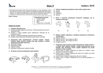 Klasa 5 Na początku testu każdy uczeń otrzymuje 40 punktów. Za brak odpowiedzi uczeń otrzymuje zero punktów za dane zadanie. Za każdą błędną odpowiedź odejmuje się uczniowi 1/3 punktów przewidzianych za dane zadanie. Minimalna liczba punktów możliwych do uzyskania wynosi 0. Maksymalnie można uzyskać 160 punktów. Czas: 75 minut Doświadczenia do testu: 1. Promień światła 2. Wieża ciśnień 3. Ślina 4. Obieg wody w przyrodzie 4. A) B) C) D) Konkurs 2015 Cukrem najlepiej przyswajalnym przez ludzki organizm jest: glukoza maltoza sacharoza skrobia 5. Który z rysunków przedstawia kontynent znajdujący się na południe od Europy? Zadania za 3 punkty 1. Kopalnia odkrywkowa to: A) niewielka kopalnia głęboko pod ziemią, w której poszukuje się nowych, nieznanych złóż B) kopalnia, w której wszelkie prace wydobywcze odbywają się na powierzchni ziemi C) kopalnia, w której prowadzone są eksperymenty naukowe D) kopalnia, której celem jest odkrywanie nowych skał i minerałów 2. Przypomnij sobie doświadczenie „Promień światła”. Zmianę kierunku biegu promieni światła przy jego przejściu z jednej substancji do drugiej nazywamy: A) złamaniem światła B) załamaniem światła C) odbiciem światła D) całkowitym wewnętrznym odbiciem światła 3. Na którym rysunku przedstawiony jest padalec? A) B) C) A) B) C) D) 6. Różnica między najwyższą a najniższą temperaturą odnotowaną na Ziemi jest: A) większa niż 80°C B) większa niż 60°C, ale mniejsza niż 80°C C) większa niż 40°C, ale mniejsza niż 60°C D) mniejsza niż 40°C 7. Przypomnij sobie pierwszą część doświadczenia „Wieża ciśnień”, w którym były używane butelka i wężyk przymocowany do jej zakrętki. Gdy swobodny koniec wężyka znajdował się ponad poziomem wody w butelce: A) poziom wody w wężyku znajdował się wyżej niż w butelce i woda wylewała się stale przez wężyk. B) poziom wody w wężyku znajdował się wyżej niż w butelce, ale woda nie wylewała się z butelki. C) poziom wody w wężyku znajdował się niżej niż w butelce. D) poziom wody w wężyku znajdował się na tej samej wysokości, co w butelce. D) PAMIĘTAJ O PRZENIESIENIU ODPOWIEDZI NA KARTĘ ODPOWIEDZI © Ogólnopolski Konkurs Nauk Przyrodniczych „Świetlik” WWW.SWIETLIK.EDU.PL Klasa 5 8. A) B) C) D) Rzutowanie w technice oznacza: odpowiednie rzucenie przedmiotem w celu jego uformowania konstruowanie odrzutowców odwzorowanie bryły przestrzennej na papierze używanie rzutnika multimedialnego w celu projektowania przestrzennego 9. Witaminy to składniki pokarmowe, które są niezbędne do prawidłowej pracy organizmu. Zaznacz niepoprawne stwierdzenie: A) Witaminami są np. magnez i żelazo. B) Spośród wszystkich pokarmów, najwięcej witamin znajduje się w owocach i warzywach. C) Witaminy są zawarte w mięsie oraz jajach i mleku. D) Witaminy można zażywać w tabletkach. 13. Źródłem światła nazywamy obiekt, który sam wytwarza światło. Przeczytaj uważnie dwa zdania: Na niebie mamy dwa główne źródła światła: Słońce i Księżyc. Upływa wiele lat zanim światło emitowane przez odległe gwiazdy dotrze do Ziemi. Zdecyduj: A) pierwsze zdanie jest prawdziwe, a drugie fałszywe B) pierwsze zdanie jest fałszywe, a drugie prawdziwe C) oba zdania są prawdziwe D) oba zdania są fałszywe 14. W tabeli przedstawiono pojazdy poruszające się w różnych przestrzeniach. W której kolumnie popełniono błąd? 10. Przypomnij sobie doświadczenie „Ślina”. W kontakcie ze skrobią jodyna zabarwia się na kolor: A) herbaciany B) czerwony C) granatowy D) zielony Zadania za 4 punkty 11. Przypomnij sobie doświadczenie „Ślina”. Pod koniec doświadczenia w jednym z kieliszków jodyna znacznie wyblakła. Stało się tak, ponieważ: A) skrobia rozpuściła jodynę B) jodyna rozpuściła skrobię C) ślina rozpuściła skrobię D) ślina rozpuściła jodynę 12. A) B) C) D) Rok świetlny to jednostka: miary odległości, jaką pokonuje światło w ciągu jednego roku czasu intensywności światła miary ilości światła, jaka pada na całą kulę Ziemską w ciągu jednego roku Konkurs 2015 A) B) C) D) po wodzie i w wodzie w powietrzu na lądzie skuter wodny lotnia skuter prom wodolot rower statek parowy samolot ciężarówka w kosmosie statek kosmiczny łazik prom kosmiczny w kolumnie pojazdów wodnych w kolumnie pojazdów powietrznych w kolumnie pojazdów lądowych w kolumnie pojazdów kosmicznych 15. W bezchmurny dzień można zaobserwować na niebie ślady (podobne do chmur) zostawiane przez lecące samoloty. Powstają one w wyniku: A) kondensacji pary wodnej B) parowania wody C) wypuszczania przez pilotów nadmiaru paliwa lotniczego D) krystalizacji dwutlenku węgla powstałego podczas spalania paliwa samolotowego PAMIĘTAJ O PRZENIESIENIU ODPOWIEDZI NA KARTĘ ODPOWIEDZI © Ogólnopolski Konkurs Nauk Przyrodniczych „Świetlik” WWW.SWIETLIK.EDU.PL Klasa 5 16. Identyczni bracia stoją na tafli lustra i patrzą na siebie (tak jak narysowano na rysunku obok). Które odbicie widziane przez jednego z braci jest poprawne: Konkurs 2015 19. W poniższej tabelce znajdują się dane dotyczące przeciętnego trwania życia kobiet i mężczyzn w Polsce, według Głównego Urzędu Statystycznego (w skrócie GUS). Przeczytaj je i zaznacz poprawną odpowiedź. ROK KOBIETY MĘŻCZYŹNI A) B) C) D) 17. Które z wymienionych zestawów nie zawierają nazw trzech roślin? A) B) C) D) I. stokrotka, goździk, szafran II. mlecz, aloes, gekon III. przebiśnieg, rosiczka, niezapominajka IV. kaczeniec, koniczyna, żabnica 1960 71 65 1970 73,5 66,5 1980 74,5 66,5 1990 75 66,5 2000 78 70 2010 81 72 Prawdą jest, że: A) od roku 2000 wszyscy ludzie w Polsce żyją dłużej niż 70 lat B) wszystkie kobiety w Polsce żyją dłużej niż mężczyźni C) średnia różnica wieku pomiędzy kobietami i mężczyznami stale wzrasta D) spośród lat przedstawionych w tabeli największa różnica średn