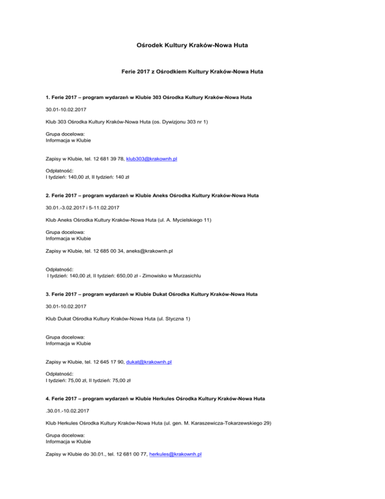Ośrodek Kultury Kraków-Nowa Huta Ferie 2017 z Ośrodkiem Kultury Kraków-Nowa Huta 1. Ferie 2017 – program wydarzeń w Klubie 303 Ośrodka Kultury Kraków-Nowa Huta 30.01-10.02.2017 Klub 303 Ośrodka Kultury Kraków-Nowa Huta (os. Dywizjonu 303 nr 1) Grupa docelowa: Informacja w Klubie Zapisy w Klubie, tel. 12 681 39 78, [email protected] Odpłatność: I tydzień: 140,00 zł, II tydzień: 140 zł 2. Ferie 2017 – program wydarzeń w Klubie Aneks Ośrodka Kultury Kraków-Nowa Huta 30.01.-3.02.2017 i 5-11.02.2017 Klub Aneks Ośrodka Kultury Kraków-Nowa Huta (ul. A. Mycielskiego 11) Grupa docelowa: Informacja w Klubie Zapisy w Klubie, tel. 12 685 00 34, [email protected] Odpłatność: I tydzień: 140,00 zł, II tydzień: 650,00 zł - Zimowisko w Murzasichlu 3. Ferie 2017 – program wydarzeń w Klubie Dukat Ośrodka Kultury Kraków-Nowa Huta 30.01-10.02.2017 Klub Dukat Ośrodka Kultury Kraków-Nowa Huta (ul. Styczna 1) Grupa docelowa: Informacja w Klubie Zapisy w Klubie, tel. 12 645 17 90, [email protected] Odpłatność: I tydzień: 75,00 zł, II tydzień: 75,00 zł 4. Ferie 2017 – program wydarzeń w Klubie Herkules Ośrodka Kultury Kraków-Nowa Huta .30.01.-10.02.2017 Klub Herkules Ośrodka Kultury Kraków-Nowa Huta (ul. gen. M. Karaszewicza-Tokarzewskiego 29) Grupa docelowa: Informacja w Klubie Zapisy w Klubie do 30.01., tel. 12 681 00 77, [email protected] Odpłatność: I tydzień: 100,00 zł, II tydzień: 100,00 zł 5. Ferie 2017 – program wydarzeń w Klubie Jedność Ośrodka Kultury Kraków-Nowa Huta 30.01.-3.02.2017 i 5-11.02.2017 Klub Jedność Ośrodka Kultury Kraków-Nowa Huta (ul. Drożyska 3c) Grupa docelowa: Informacja w Klubie Zapisy w Klubie, tel. 12 681 00 70, [email protected] Odpłatność: I tydzień: 100,00 zł, II tydzień: 650,00 zł - Zimowisko w Murzasichlu 6. Ferie 2017 – program wydarzeń w Klubie Jędruś Ośrodka Kultury Kraków-Nowa Huta 30.01-3.02.2017 Klub Jędruś Ośrodka Kultury Kraków-Nowa Huta (os. Centrum A 6a) Grupa docelowa: Informacja w Klubie Zapisy w Klubie, tel. 12 644 68 10 w. 21, [email protected] Odpłatność: Tydzień: 80,00 zł 7. Ferie 2017 – program wydarzeń w Klubie Karino Ośrodka Kultury Kraków-Nowa Huta 30.01-10.02.2017 Klub Karino Ośrodka Kultury Kraków-Nowa Huta (ul. Truskawkowa 4) Grupa docelowa: Informacja w Klubie Zapisy w Klubie do 30.01., tel. 12 681 02 00, [email protected] Odpłatność: I tydzień: 100,00 zł, II tydzień: 100,00 zł 8. Ferie 2017 – program wydarzeń w Klubie Krzesławice Ośrodka Kultury Kraków-Nowa Huta 30.01-10.02.2017 Klub Krzesławice Ośrodka Kultury Kraków-Nowa Huta (ul. M. Wańkowicza 17) Grupa docelowa: Informacja w Klubie Zapisy w Klubie, tel. 12 644 80 06, [email protected] Odpłatność: I tydzień: 150,00 zł, II tydzień: 150,00 zł 9. Ferie 2017 – program wydarzeń w Klubie Mirage Ośrodka Kultury Kraków-Nowa Huta 30.01-10.02.2017 Klub Mirage Ośrodka Kultury Kraków-Nowa Huta (os. Bohaterów Września 26) Grupa docelowa: dla dzieci 7-12 lat. Zapisy w Klubie, tel. 12 645 72 09, [email protected] Odpłatność: I tydzień: 130,00 zł (dla członków SM „Mistrzejowice-Północ” 80,00 zł), II tydzień: 130,00 zł (dla członków SM „MistrzejowicePółnoc” 80,00 zł) 10. Ferie 2017 – program wydarzeń w Klubie Wersalik Ośrodka Kultury Kraków-Nowa Huta 30.01-10.02.2017 Klub Wersalik Ośrodka Kultury Kraków-Nowa Huta (os. Ogrodowe 15) Grupa docelowa: Informacja w Klubie Zapisy w Klubie, tel. 12 644 13 52, [email protected] Odpłatność: I tydzień: 70,00 zł, II tydzień: 70,00 zł 11. Ferie 2017 – program wydarzeń w Klubie Zgody Ośrodka Kultury Kraków-Nowa Huta 30.01-10.02.2017 Klub Zgody Ośrodka Kultury Kraków-Nowa Huta (os. Zgody 1) Grupa docelowa: dla dzieci 7-11 lat. Zapisy w Klubie, tel. 12 644 24 32 w. 28, [email protected] Odpłatność: I tydzień: 130,00 zł, II tydzień: 130,00 zł Zima wcale nie jest taka zła! Szczególnie ta, która wypełniona jest różnorodnymi atrakcjami i wydarzeniami, niepozwalającymi na to, by nudzić się w domu. A takich wydarzeń na pewno nie zabraknie w Klubach Ośrodka Kultury Kraków-Nowa Huta podczas dwóch zimowych tygodni Ferii. W tym czasie pracownicy Klubów zaplanowali różnorodne warsztaty, wyjścia, gry i zabawy, do udziału w których zapraszają wszystkie dzieci. Wśród proponowanych wydarzeń znajdą się rozmaite warsztaty m.in. zimowe majsterkowanie, modelowanie balonów, warsztaty filmowe i charakteryzacji w Kinie Sfinks, warsztaty multimedialne w Artetece, warsztaty teatralne i gry na bum-bum rurkach, warsztaty kulinarne w pizzerii oraz warsztaty plastyczne: koralikowe rozmaitości, tworzenie Kolaży 3D. Propozycja Klubów Ośrodka Kultury to także spotkania z kulturą w różnym wydaniu – kino, spektakle, zwiedzanie wystaw, m.in. Szopek Krakowskich, Muzeum Inżynierii Miejskiej, Muzeum Etnograficznego, Cricoteki a także wycieczka do Studia Filmów Rysunkowych Bielsko-Biała czy do Muzeum Fonograficznego w Niepołomicach. Nie może także zabraknąć sportowych propozycji. Strzelnica, lodowisko, park trampolin, ścianka wspinaczkowa to tylko część z zaplanowanych atrakcji. Okazją do rywalizacji będą także wyjścia do Laser parku, na kręgle, zabawa w Klockolandzie i Centrum Zabaw Dziecięcych Gibon, turniej piłkarzyków czy tenis stołowy. Podczas zajęć świetlicowych na dzieci czekać będzie mnóstwo gier i zabaw integracyjnych, taneczne zabawy karnawałowe i talent show, podczas których dzieci same będą mogły zaprezentować swoje umiejętności, ale także spotkania, które pozwolą im poszerzyć swoja wiedzę np. ze Strażnikami Miejskimi na temat bezpieczeństwa. Jak co roku organizowane jest także tygodniowe zimowisko w Murzasichlu – na wyjazd zapraszają Kluby Aneks i Jedność w terminie 5-11 lutego. Szczegółowe programy wydarzeń można znaleźć na www.krakownh.pl oraz w Klubach. Zapisy przyjmowane są w poszczególnych Klubach z góry na wszystkie wydarze