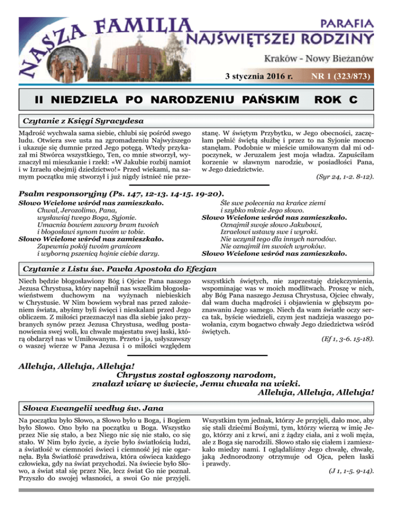 3 stycznia 2016 r. II NIEDZIELA PO NARODZENIU PAŃSKIM NR 1 (323/873) ROK C Czytanie z Księgi Syracydesa Mądrość wychwala sama siebie, chlubi się pośród swego ludu. Otwiera swe usta na zgromadzeniu Najwyższego i ukazuje się dumnie przed Jego potęgą. Wtedy przykazał mi Stwórca wszystkiego, Ten, co mnie stworzył, wyznaczył mi mieszkanie i rzekł: «W Jakubie rozbij namiot i w Izraelu obejmij dziedzictwo!» Przed wiekami, na samym początku mię stworzył i już nigdy istnieć nie prze- stanę. W świętym Przybytku, w Jego obecności, zaczęłam pełnić świętą służbę i przez to na Syjonie mocno stanęłam. Podobnie w mieście umiłowanym dał mi odpoczynek, w Jeruzalem jest moja władza. Zapuściłam korzenie w sławnym narodzie, w posiadłości Pana, w Jego dziedzictwie. (Syr 24, 1-2. 8-12). Psalm responsoryjny (Ps. 147, 12-13. 14-15. 19-20). Słowo Wcielone wśród nas zamieszkało. Chwal, Jerozolimo, Pana, wysławiaj twego Boga, Syjonie. Umacnia bowiem zawory bram twoich i błogosławi synom twoim w tobie. Słowo Wcielone wśród nas zamieszkało. Zapewnia pokój twoim granicom i wyborną pszenicą hojnie ciebie darzy. Śle swe polecenia na krańce ziemi i szybko mknie Jego słowo. Słowo Wcielone wśród nas zamieszkało. Oznajmił swoje słowo Jakubowi, Izraelowi ustawy swe i wyroki. Nie uczynił tego dla innych narodów. Nie oznajmił im swoich wyroków. Słowo Wcielone wśród nas zamieszkało. Czytanie z Listu św. Pawła Apostoła do Efezjan Niech będzie błogosławiony Bóg i Ojciec Pana naszego Jezusa Chrystusa, który napełnił nas wszelkim błogosławieństwem duchowym na wyżynach niebieskich w Chrystusie. W Nim bowiem wybrał nas przed założeniem świata, abyśmy byli święci i nieskalani przed Jego obliczem. Z miłości przeznaczył nas dla siebie jako przybranych synów przez Jezusa Chrystusa, według postanowienia swej woli, ku chwale majestatu swej łaski, którą obdarzył nas w Umiłowanym. Przeto i ja, usłyszawszy o waszej wierze w Pana Jezusa i o miłości względem wszystkich świętych, nie zaprzestaję dziękczynienia, wspominając was w moich modlitwach. Proszę w nich, aby Bóg Pana naszego Jezusa Chrystusa, Ojciec chwały, dał wam ducha mądrości i objawienia w głębszym poznawaniu Jego samego. Niech da wam światłe oczy serca tak, byście wiedzieli, czym jest nadzieja waszego powołania, czym bogactwo chwały Jego dziedzictwa wśród świętych. (Ef 1, 3-6. 15-18). Alleluja, Alleluja, Alleluja! Chrystus został ogłoszony narodom, znalazł wiarę w świecie, Jemu chwała na wieki. Alleluja, Alleluja, Alleluja! Słowa Ewangelii według św. Jana Na początku było Słowo, a Słowo było u Boga, i Bogiem było Słowo. Ono było na początku u Boga. Wszystko przez Nie się stało, a bez Niego nic się nie stało, co się stało. W Nim było życie, a życie było światłością ludzi, a światłość w ciemności świeci i ciemność jej nie ogarnęła. Była Światłość prawdziwa, która oświeca każdego człowieka, gdy na świat przychodzi. Na świecie było Słowo, a świat stał się przez Nie, lecz świat Go nie poznał. Przyszło do swojej własności, a swoi Go nie przyjęli. Wszystkim tym jednak, którzy Je przyjęli, dało moc, aby się stali dziećmi Bożymi, tym, którzy wierzą w imię Jego, którzy ani z krwi, ani z żądzy ciała, ani z woli męża, ale z Boga się narodzili. Słowo stało się ciałem i zamieszkało miedzy nami. I oglądaliśmy Jego chwałę, chwałę, jaką Jednorodzony otrzymuje od Ojca, pełen łaski i prawdy. (J 1, 1-5. 9-14). 2 NASZA FAMILIA, 3 stycznia 2016 r., Nr 1 NASZ PARAFIANIN – SEKRETARZEM EUROPEJSKIEGO DZIEŁA KOLPINGA Krzysztof Wolski W dniach od 9 do 11 maja 2014 r. w Brasov (Rumunia) malowniczo położonym zabytkowym mieście w Karpatach odbyło się doroczne Zebranie Kontynentalne Europejskiego Dzieła Kolpinga – międzynarodowej katolickiej organizacji samopomocy społecznej z siedzibą w Kolonii (Niemcy). Przybyli na nie delegaci z 14-stu krajów: Albanii, Kosowa, Litwy, Mołdawii, Ukrainy, Węgier, Rumunii, Serbii, Austrii, Niemiec, Szwajcarii, Holandii, Włoch i Polski. Zebrania te są europejskim forum wymiany doświadczeń i informacji nt. zaangażowania katolików świeckich - zorganizowanych w Rodzinach Kol- pinga działających przy parafiach – w różnorodne formy pomocy osobom zmarginalizowanym społecznie i potrzebującym wsparcia. Przedmiotem obrad były zagadnienia sprawiedliwości społecznej – promocji dobra wspólnego i bardziej sprawiedliwej polityki gospodarczej, uwzględniającej prorodzinny system podatkowy w kontekście zbliżających się wyborów do Parlamentu Europejskiego. Europejskie Dzieło Kolpinga ma bowiem tam swojego stałego przedstawiciela – Antona Salesnego z Austrii. Ponadto wielu eurodeputowanych, m.in. z Niemiec, Austrii czy Słowenii wywodzi się z tego chrześcijańskiego ruchu społecznego. Obecne zebranie miało wyjątkowe znaczenie dla polskich Rodzin Kolpinga, gdyż po raz pierwszy do Zarządu tego europejskiego gremium wybrany został przedstawiciel Dzieła Kolpinga w Polsce – Krzysztof Wolski z Krakowa, wieloletni sekretarz naczelny tego stowarzyszenia i jego współzałożyciel przed dokładnie 20-stu laty. Krzysztof Wolski objął stanowisko Sekretarza Europejskiego, z nadzieją przyczynienia się do koordynacji działań poszczególnych związków narodowych w zakresie udziału w kształtowaniu polityki społecznej i tworzeniu odpowiedzialnego społeczeństwa obywatelskiego. Na tym samym zebraniu odbyły się także wybory księdza prezesa europejskiego, pełniącego opiekę duszpasterską dla tego gremium. Został nim ks. Josef Holtkotte, prezes Dzieła Kolpinga w Niemczech, który podkreślił, że do służby społecznej potrzebni są „ludzie sumienia” - jak to nieustannie przypominał święty naszych czasów - Jan Paweł II. Bożena Michałek NOWENNA DO NAJŚWIĘTSZEJ RODZINY - NASZE MODLITWY Najświętsza Rodz