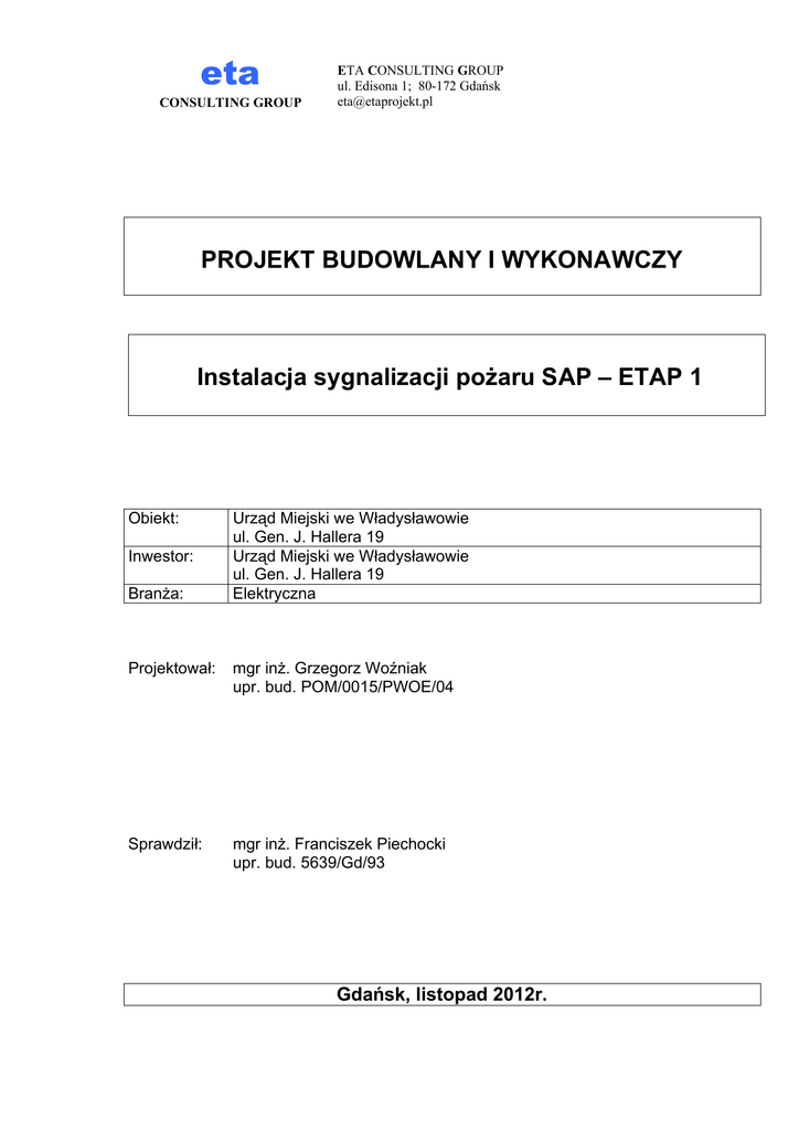 eta CONSULTING GROUP ETA CONSULTING GROUP ul. Edisona 1; 80-172 Gdańsk [email protected] PROJEKT BUDOWLANY I WYKONAWCZY Instalacja sygnalizacji pożaru SAP – ETAP 1 Obiekt: Inwestor: Branża: Urząd Miejski we Władysławowie ul. Gen. J. Hallera 19 Urząd Miejski we Władysławowie ul. Gen. J. Hallera 19 Elektryczna Projektował: mgr inż. Grzegorz Woźniak upr. bud. POM/0015/PWOE/04 Sprawdził: mgr inż. Franciszek Piechocki upr. bud. 5639/Gd/93 Gdańsk, listopad 2012r. eta CONSULTING GROUP Instalacja sygnalizacji pożaru - ETAP 1 Urząd Miejski Władysławowo Strona 2/10 ZAWARTOŚĆ OPRACOWANIA: 1 CZĘŚĆ OGÓLNA .....................................................................................................................................3 1.1 Stadium i temat opracowania............................................................................................................. 3 1.2 Lokalizacja obiektu............................................................................................................................ 3 1.3 Zakres opracowania ........................................................................................................................... 3 1.4 Podstawa opracowania....................................................................................................................... 3 1.5 Charakterystyka obiektu .................................................................................................................... 4 2 ISTNIEJĄCY SYSTEM SYGNALIZACJI ALARMU POŻARU ........................................................4 3 SYSTEM SYGNALIZACJI ALARMU POŻARU - SAP.......................................................................4 3.1 Budowa projektowanego systemu SAP ............................................................................................. 5 3.2 Ostrzegacze pożarowe ....................................................................................................................... 5 3.3 Projektowana topologia systemu ....................................................................................................... 6 3.4 Technologia wykonania ..................................................................................................................... 6 3.5 Rodzaj, sposób okablowania i rozmieszczenie elementów................................................................ 6 3.6 Sterowanie urządzeniami zabezpieczenia ppoż. budynku ................................................................. 7 3.7 Organizacja alarmowania................................................................................................................... 7 3.8 Oprogramowanie systemu ................................................................................................................. 7 3.9 Prowadzenie instalacji ....................................................................................................................... 8 3.10 Ochrona przeciwporażeniowa............................................................................................................ 8 3.11 Ochrona przeciwprzepięciowa........................................................................................................... 8 3.12 Wytyczne dla innych branż................................................................................................................ 8 3.12.1 Zalecenia dla wykonawcy.............................................................................................................. 8 3.12.2 Zalecenia dla inwestora i użytkownika instalacji........................................................................... 9 3.13 Konserwacja....................................................................................................................................... 9 4 UWAGI KOŃCOWE, ZALECENIA INSTALACYJNE I EKSPLOATACYJNE............................10 5 RYSUNKI T-01 T-02 Instalacja SAP – rzut przyziemia Instalacja SAP – schemat blokowy eta CONSULTING GROUP Instalacja sygnalizacji pożaru - ETAP 1 Urząd Miejski Władysławowo Strona 3/10 1 CZĘŚĆ OGÓLNA 1.1 Stadium i temat opracowania Przedmiotem opracowania jest projekt budowlany i wykonawczy instalacji sygnalizacji pożaru w budynku Urzędu Miejskiego we Władysławowie - Domu Rybaka we Władysławowie, przy ul. Gen. J.Hallera 19 dla etapu 1 tj. w zakresie remontu pomieszczeń Biura Obsługi Interesanta, Straży Miejskiej oraz hallu na parterze budynku Urzędu Miejskiego we Władysławowie. 1.2 Lokalizacja obiektu Obiekt znajduje się we Władysławowie, przy ul. Gen. J.Hallera 19 1.3 Zakres opracowania - dobór urządzeń, rozmieszczenie urządzeń, projekt instalacji do urządzeń projektowanych. 1.4 Podstawa opracowania - - Zawarta umowa. Obowiązujące przepisy. Projekt architektoniczno - budowlany i elektrycznych aranżacji i remontu pomieszczeń Biura Obsługi Interesanta, Straży Miejskiej oraz hallu na parterze budynku Urzędu Miejskiego we Władysławowie Zasady wiedzy technicznej i Polska Norma. Zasady projektowania elektrycznych sieci zasilających: PN-IEC 60364 „Instalacje elektryczne w obiektach budowlanych”; Przepisy Budowy Urządzeń Elektroenergetycznych, Wydanie II; Rozporządzenie Ministra Infrastruktury z dnia 12 kwietnia 2004r. z późn zm. w sprawie warunków technicznych, jakim powinny odpowiadać budynki i ich usytuowanie; Rozporządzenie Ministra Infrastruktury z dnia 3 lipca 2003r. z późn. zm. w sprawie szczegółowego zakresu i formy projektu budowlanego; Rozporządzenie Ministra Spraw Wewnętrznych i Administracji z dnia czerwca 2010r. w sprawie ochrony przeciwpożarowej budynków, innych obiektów budowlanych i terenów; Prawo Budowlane; Dokumenty techniczne, cenniki i katalogi producentów urządzeń proponowanych w niniejszym opracowaniu, materiały informacyjne, szkoleniowe, materiały z branżowych konferencji eta CONSULTING GROUP Instalacja sygnalizacji pożaru - ETAP 1 Urząd Miejski 