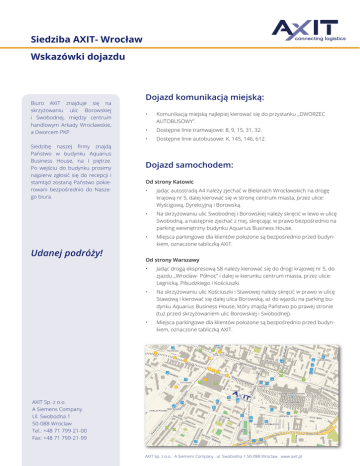 Siedziba AXIT- Wrocław Wskazówki dojazdu Biuro AXIT znajduje się na skrzyżowaniu ulic Borowskiej i Swobodnej, między centrum handlowym Arkady Wrocławskie, a Dworcem PKP. Siedzibę naszej firmy znajdą Państwo w budynku Aquarius Business House, na I piętrze. Po wejściu do budynku prosimy najpierw zgłosić się do recepcji i stamtąd zostaną Państwo pokierowani bezpośrednio do Naszego biura. Udanej podróży! Dojazd komunikacją miejską: • Komunikacją miejską najlepiej kierować się do przystanku ,,DWORZEC AUTOBUSOWY”. • Dostępne linie tramwajowe: 8, 9, 15, 31, 32. • Dostępne linie autobusowe: K, 145, 146, 612. Dojazd samochodem: Od strony Katowic • Jadąc autostradą A4 należy zjechać w Bielanach Wrocławskich na drogę krajową nr 5, dalej kierować się w stronę centrum miasta, przez ulice: Wyścigową, Dyrekcyjną i Borowską. • Na skrzyżowaniu ulic Swobodnej i Borowskiej należy skręcić w lewo w ulicę Swobodną, a następnie zjechać z niej, skręcając w prawo bezpośrednio na parking wewnętrzny budynku Aquarius Business House. • Miejsca parkingowe dla klientów położone są bezpośrednio przed budynkiem, oznaczone tabliczką AXIT. Od strony Warszawy • Jadąc drogą ekspresową S8 należy kierować się do drogi krajowej nr 5, do zjazdu ,,Wrocław- Północ” i dalej w kierunku centrum miasta, przez ulice: Legnicką, Piłsudzkiego i Kościuszki. • Na skrzyżowaniu ulic Kościuszki i Stawowej należy skręcić w prawo w ulicę Stawową i kierować się dalej ulica Borowską, aż do wjazdu na parking budynku Aquarius Business House, który znajdą Państwo po prawej stronie (tuż przed skrzyżowaniem ulic Borowskiej i Swobodnej). • Miejsca parkingowe dla klientów położone są bezpośrednio przed budynkiem, oznaczone tabliczką AXIT. AXIT Sp. z o.o. A Siemens Company Ul. Swobodna 1 50-088 Wroclaw Tel.: +48 71 799-21-00 Fax: +48 71 799-21-99 AXIT Sp. z o.o. . A Siemens Company . ul. Swobodna 1.50-088 Wroclaw . www.axit.pl