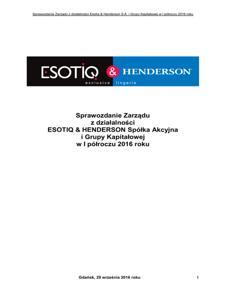 Sprawozdanie Zarządu z działalności Esotiq & Henderson S.A. i Grupy Kapitałowej w I półroczu 2016 roku Sprawozdanie Zarządu z działalności ESOTIQ & HENDERSON Spółka Akcyjna i Grupy Kapitałowej w I półroczu 2016 roku Gdańsk, 29 września 2016 roku 1 Sprawozdanie Zarządu z działalności Esotiq & Henderson S.A. i Grupy Kapitałowej w I półroczu 2016 roku Opis zmian organizacji grupy kapitałowej emitenta, w tym w wyniku połączenia jednostek, uzyskania lub utraty kontroli nad jednostkami zależnymi oraz inwestycjami długoterminowymi, a także podziału, restrukturyzacji lub zaniechania działalności oraz wskazanie jednostek podlegających konsolidacji, a w przypadku emitenta będącego jednostką dominującą, który na podstawie obowiązujących go przepisów nie ma obowiązku lub może nie sporządzać skonsolidowanych sprawozdań finansowych – również wskazanie przyczyny i podstawy prawnej braku konsolidacji. Zgodnie z definicją grupy kapitałowej podanej w MSSF 10 w skład Grupy Kapitałowej Esotiq & Henderson S.A. na dzień 30 czerwca 2016 roku wchodziły: jednostka dominująca jednostka zależna jednostka zależna pośrednio jednostka zależna jednostka zależna jednostka zależna Esotiq & Henderson S.A. z siedzibą w Gdańsku Eva Minge Design sp. z o.o. z siedzibą w Katowicach Eva Minge Milano z siedzibą w Mediolanie Luma sp. z o.o. z siedzibą w Gdańsku Femestage Eva Minge sp. z o.o. z siedzibą w Gdańsku Esotiq Germany GmbH z siedzibą w Stuttgarcie Wyżej wymienione jednostki podlegają konsolidacji. Schemat organizacyjny Grupy Kapitałowej Esotiq & Henderson S.A. ESOTIQ & HENDERSON SPÓŁKA AKCYJNA Luma sp. z o.o. 100,00 % Femestage Eva Minge sp. z o.o. 100,00 % Esotiq Germany GmbH 100,00 % Eva Minge Design sp. z o.o. 75,00 % Eva Minge Milano 98,00 % Czas trwania działalności poszczególnych jednostek wchodzących w skład Grupy kapitałowej nie jest ograniczony. Sprawozdania finansowe wszystkich jednostek podporządkowanych sporządzone zostały za ten sam okres sprawozdawczy co sprawozdanie finansowe jednostki dominującej, przy zastosowaniu spójnych zasad rachunkowości. Sprawozdania jednostkowe spółek Grupy Kapitałowej są sporządzane zgodnie z Ustawą o Rachunkowości. Dla potrzeb sporządzenia skonsolidowanego sprawozdania finansowego zostały one przekształcone na MSSF. W dniu 20 czerwca 2016 roku Jednostka dominująca zwiększyła swój udział w jednostce zależnej Eva Minge Design sp. z o.o. do 75,00 %. W okresie Gdańsk, 29 września 2016 roku 2 Sprawozdanie Zarządu z działalności Esotiq & Henderson S.A. i Grupy Kapitałowej w I półroczu 2016 roku sprawozdawczym nie wystąpiły inne zmiany w strukturze jednostki gospodarczej. Spółki Grupy Kapitałowej Esotiq & Henderson projektują oraz sprzedają bieliznę, odzież, galanterię modową, jak również kosmetyki i perfumy. Esotiq & Henderson to jedna z czołowych na polskim rynku marek bieliźniarskich, której oferta skierowana jest zarówno do kobiet, jak i mężczyzn. Produkty firmy dostępne są w 287 salonach własnych i franczyzowych zlokalizowanych w Polsce, Niemczech i Ukrainie. Jednostka dominująca prowadzi działalność w zakresie handlu detalicznego oraz hurtowego bielizną. Dystrybucja produktów odbywa się przede wszystkim za pośrednictwem sieci salonów własnych i franczyzowych, ale także poprzez kanał hurtowy i eksportowy. Emitent posiada dział zajmujący się projektowaniem produktów marek własnych, a proces produkcji zlecany jest zagranicznym wykonawcom. Kolekcje marki Femestage Eva Minge oferowane są w 19 salonach, w tym w 18 zlokalizowanych w Polsce i 1 na Ukrainie, a marki Eva Minge w 2 salonach w Polsce. Spółki Grupy kapitałowej prowadzą ponadto sprzedaż hurtową i poprzez punkty multibrandowe w Polsce, Mołdawii, Ukrainie, Białorusi, Rosji, Kazachstanie, Litwie, Łotwie, Czechach, Bułgarii, Norwegii, Włoszech, Francji i Cyprze. W okresie sprawozdawczym Zarządy Spółek realizowały strategię umacniania pozycji rynkowej mającą na celu utrzymanie trendu wzrostowego Grupy Kapitałowej. Stanowisko zarządu odnośnie możliwości zrealizowania wcześniej publikowanych prognoz wyników na dany rok, w świetle wyników zaprezentowanych w raporcie w stosunku do wyników prognozowanych. Esotiq & Henderson Spółka Akcyjna i spółki Grupy Kapitałowej nie publikowały prognoz wyników. Wskazanie akcjonariuszy posiadających bezpośrednio lub pośrednio przez podmioty zależne co najmniej 5 % ogólnej liczby głosów na walnym zgromadzeniu emitenta na dzień przekazania raportu wraz ze wskazaniem liczby posiadanych przez te podmioty akcji, ich procentowego udziału w kapitale zakładowym, liczby głosów z nich wynikających i ich procentowego udziału w ogólnej liczbie głosów na walnym zgromadzeniu oraz wskazanie zmian w strukturze własności znacznych pakietów akcji emitenta w okresie od przekazania poprzedniego raportu. Zestawienie stanu posiadania akcji emitenta lub uprawnień do nich przez osoby zarządzające i nadzorujące emitenta na dzień przekazania raportu, wraz ze wskazaniem zmian w stanie posiadania, w okresie od przekazania poprzedniego raportu, odrębnie dla każdej z osób. posiadanie bezpośrednie nazwisko i imię/firma łączna liczba akcji Adam Skrzypek – Prezes Zarządu Krzysztof Jakubowski – Członek Zarządu zmiana stanu posiadania % kapitału zakładowego łączna liczba głosów na WZA % głosów na WZA 107 000 0 4,79 % 207 000 6,40 % 5 000 0 0,22 % 5 000 0,15 % Gdańsk, 29 września 2016 roku 3 Sprawozdanie Zarządu z działalności Esotiq & Henderson S.A. i Grupy Kapitałowej w I półroczu 2016 roku Mariusz Jawoszek – Przewodniczący Rady Nadzorczej Małgorzata Głowacka-Pędras – Zastępca Przewodniczącego Rady Nadzorczej Jacek Grzywacz – Sekretarz Rady Nadzorczej Kamila Mieszczanin – Członek Rady Nadzorczej Tomasz Minkina – Członek Rady Nadzorczej Marek Szołdrowski – Członek Rady Nadzo