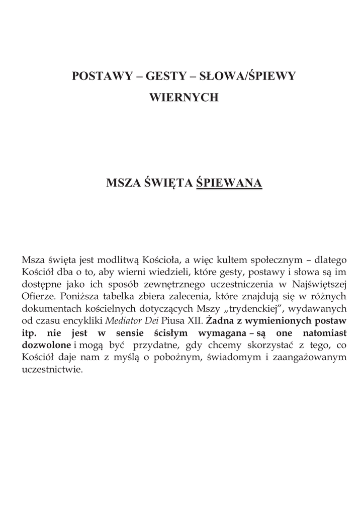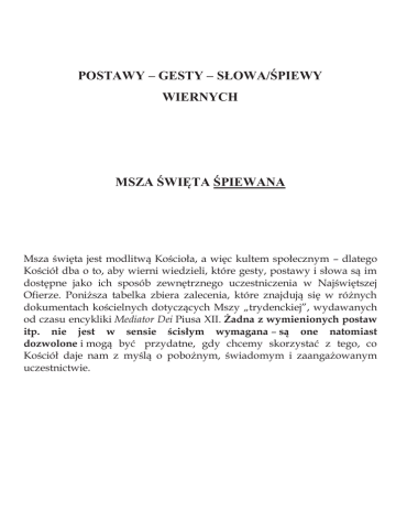POSTAWY – GESTY – SŁOWA/ŚPIEWY WIERNYCH MSZA ŚWIĘTA ŚPIEWANA Msza święta jest modlitwą Kościoła, a więc kultem społecznym – dlatego Kościół dba o to, aby wierni wiedzieli, które gesty, postawy i słowa są im dostępne jako ich sposób zewnętrznego uczestniczenia w Najświętszej Ofierze. Poniższa tabelka zbiera zalecenia, które znajdują się w różnych dokumentach kościelnych dotyczących Mszy „trydenckiej”, wydawanych od czasu encykliki Mediator Dei Piusa XII. Żadna z wymienionych postaw itp. nie jest w sensie ścisłym wymagana – są one natomiast dozwolone i mogą być przydatne, gdy chcemy skorzystać z tego, co Kościół daje nam z myślą o pobożnym, świadomym i zaangażowanym uczestnictwie. Akcja liturgiczna Uczestnictwo zewnętrzne wiernych Gesty Słowa / śpiewy Postawy ASPERSJA stojąc UBIERANIE SZAT siedząc głęboki pokłon przy Gloria Patri, znak krzyża - śpiew Asperges po intonacji przez kapłana - LITURGICZNYCH INTROIT (I MODLITWY U STOPNI OŁTARZA) klęcząc KYRIE GLORIA stojąc stojąc DIALOG PRZED KOLEKTĄ KOLEKTA LEKCJA, GRADUAŁ, stojąc stojąc siedząc ALLELUJA DIALOG PRZED EWANGELIĄ stojąc EWANGELIA HOMILIA CREDO stojąc siedząc stojąc DIALOG PRZED stojąc OFIAROWANIEM OFIAROWANIE małe pokłony przy adoramus Te, - gratias agimus Tibi, - Jesu Christe, - suscipe deprecationem nostram krzyżyk na czole, ustach i piersiach małe pokłony przy Deum, - Iesum i adoratur przyklęknięcie od Et incarnatus est do homo factus est (mały pokłon przy Maria) - siedząc (stojąc przy okadzaniu wiernych) śpiew Kyrie na przemian z chórem śpiew Gloria na przemian z chórem odpowiedź: Et cum spiritu tuo Amen na koniec odpowiedzi: Et cum spiritu tuo i Gloria tibi, Domine śpiew Credo z chórem odpowiedź Et cum spiritu tuo (małe pokłony przy okadzeniu wiernych) - ORATE, FRATRES SEKRETA DIALOG PREFACJI stojąc - odpowiedź Suscipiat Dominus sacrificium… odpowiedź Amen stojąc - PREFACJA SANCTUS KANON (PO SANCTUS) stojąc stojąc klęcząc PATER NOSTER PAX DOMINI AGNUS DEI (PAX TECUM) stojąc stojąc stojąc stojąc KOMUNIA KAPŁANA ECCE AGNUS DEI KOMUNIA WIERNYCH ABLUCJE DIALOG PRZED POKOMUNIĄ POKOMUNIA DIALOG ZAKOŃCZENIA MSZY BŁOGOSŁAWIEŃSTWO klęcząc klęcząc klęcząc siedząc stojąc stojąc stojąc pokłony przy konsekracjach chleba i wina (pocałowanie pacyfikału) uderzenia w piersi - odpowiedzi: Et cum spiritu tuo, Habemus ad Dominum, Dignum et justum est śpiew razem z chórem odpowiedź Amen na zakończenie całego Kanonu klęcząc - Odpowiedź Amen KOŃCOWE DIALOG PRZED OSTATNIĄ EWANGELIĄ stojąc znaki krzyża OSTATNIA EWANGELIA stojąc przyklęknięcie na Et Verbum caro factum est Odpowiedzi Et cum spiritu tuo oraz Gloria tibi, Domine Odpowiedź Deo gratias – lub śpiew antyfony maryjnej śpiew ostatniej prośby: Sed libera nos a malo odpowiedź Et cum spiritu tuo śpiew z chórem potrójne Domine, non sum dignus… odpowiedź Et cum spiritu tuo odpowiedź Amen Odpowiedzi: Et cum spiritu tuo oraz Deo gratias