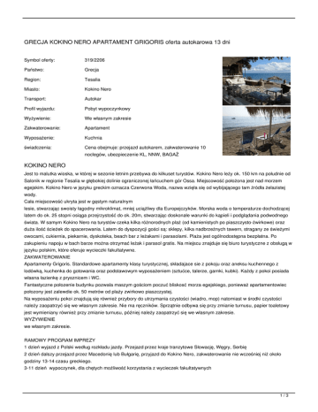 GRECJA KOKINO NERO APARTAMENT GRIGORIS oferta autokarowa 13 dni Symbol oferty: 319/2206 Państwo: Grecja Region: Tesalia Miasto: Kokino Nero Transport: Autokar Profil wyjazdu: Pobyt wypoczynkowy Wyżywienie: We własnym zakresie Zakwaterowanie: Apartament Wyposażenie: Kuchnia świadczenia: Cena obejmuje: przejazd autokarem, zakwaterowanie 10 noclegów, ubezpieczenie KL, NNW, BAGAŻ KOKINO NERO Jest to malutka wioska, w której w sezonie letnim przebywa do kilkuset turystów. Kokino Nero leży ok. 150 km na południe od Salonik w regionie Tesalia w głębokiej dolinie ograniczonej łańcuchem gór Ossa. Miejscowość położona jest nad morzem egejskim. Kokino Nero w języku greckim oznacza Czerwona Woda, nazwa wzięła się od wybijającego tam źródła żelazistej wody. Cała miejscowość ukryta jest w gęstym naturalnym lesie, stwarzając swoisty łagodny mikroklimat, mniej uciążliwy dla Europejczyków. Morska woda o temperaturze dochodzącej latem do ok. 25 stopni osiąga przejrzystość do ok. 20m, stwarzając doskonałe warunki do kąpieli i podglądania podwodnego świata. W samym Kokino Nero na turystów czeka kilka różnorodnych plaż (od kamienistych po piaszczysto-żwirkowe) oraz duża ilość ścieżek do spacerowania. Latem do dyspozycji gości są: sklepy, kilka nadbrzeżnych tawern, stragany ze świeżymi owocami, cukiernia, piekarnie, dyskoteka, beach bar z leżakami i parasolami. Plaża jest ogólnodostępna bezpłatna. Po zakupieniu napoju w bach barze można otrzymać leżak i parasol gratis. Na miejscu znajduje się biuro turystyczne z obsługą w języku polskim, które oferuje wycieczki fakultatywne. ZAKWATEROWANIE Apartamenty Grigoris. Standardowe apartamenty klasy turystycznej, składajace sie z pokoju oraz aneksu kuchennego z lodówką, kuchenka do gotowania oraz podstawowym wyposażeniem (sztućce, talerze, garnki, kubki). Każdy z pokoi posiada własna łazienkę z prysznicem i WC. Fantastyczne połozenie budynku pozwala maszym gościom poczuć bliskosć morza egejskiego, ponieważ apartamentowiec połozony jest zalewdie ok. 50 metrów od plaży zwirkowo piaszczystej. Na wyposażeniu pokoi znajdują się również przybory do utrzymania czystości (wiadro, mop) natomiast w środki czystości należy zaopatrzyć się we własnym zakresie. Nie ma ręczników. Sprzątnie odbywa się przy zmianie turnusu, papier toaletowy jest wymieniany również przy zmianie turnusu, później należy zaopatrzyć się we własnym zakresie. WYŻYWIENIE we własnym zakresie. RAMOWY PROGRAM IMPREZY 1 dzień wyjazd z Polski według rozkładu jazdy. Przejazd przez kraje tranzytowe Słowację, Węgry, Serbię 2 dzień dalszy przejazd przez Macedonię lub Bułgarię, przyjazd do Kokino Nero, zakwaterowanie nie wcześniej niż około godziny 13-14 czasu greckiego. 3-11 dzień wypoczynek, dla chętych możliwość korzystania z wycieczek fakultatywnych 1/3 12 dzień wykwaterowanie około godziny 9-10 czasu greckiego, złożenie bagażu w wyznaczonym miejscu, wyjazd w drogę powrotną około południa lub wieczorem, przejazd przez Macedonię lub Bułgarię, Serbię. 13 dzień dalszy przejazd przez Węgry, Słowację, przyjazd do Polski w godzinach południowych, lub wieczornych. TRANSPORT Transport na terenie Polski (dotyczy szczególnie dojazdów antenowych) może odbywać się busem, autokarem klasy turystycznej, samochodem osobowym lub taxi. Na trasach poza granicami Polski transport odbywa się autokarami wyposażonymi w klimatyzację, WC, dvd, barek W autokarze obowiązuje całkowity zakaz palenia papierosów oraz spożywania alkoholu. Prosimy o przybycie na miejsce zbiórki najpóźniej 20 minut przed planowanym odjazdem. Podane godziny wyjazdów, przyjazdów oraz miejsca zbiórek mogą ulec nieznacznym zmianom o czym klienci informowani są na 2 dni przed wyjazdem. Miejsca w autokarze przydzielane są według kolejności zgłoszeń. Klienci o miejscu w autokarze są informowani przez pilota. PRAKTYCZNE INFORMACJE Obowiązująca waluta: EURO Czas: 1h w przód ZNIŻKI Przy łączeniu turnusów zniżka 50 zł /osoba UWAGI: Na przejazd do Grecji nie ma już konieczności posiadania paszportu, wystarczy ważny dowód osobisty. Osoby niepełnoletnie powinny posiadać paszport lub tymczasowy dowód osobisty. Oferta Biura Travel Plan Atrakcje: WYCIECZKI FAKULTATYWNE: ATENY ok. 45 euro SKIATHOS ok. 45 euro METEORY ok. 35 euro WIECZÓR GRECKI ok. 30 euro OLIMP ok. 25 euro DELFY ok. 45 euro SALONIKI ok. 25 euro Podane ceny są orientacyjne i mogą ulec zmianie. Warunkiem odbycia się wycieczki jest zebranie wymaganego minimum uczestników. Wycieczki fakultatywne organizowane są przez lokalne greckie biuro turystyczne i ono w pełni odpowiada za jakość organizowanych wycieczek. Ceny wycieczek nie uwzględniają biletów wstępów. TERMINY: od: 2017-06-03 do: 2017-06-15 (13 dni), miejsca: book_K cena od: 621 PLN od: 2017-06-13 do: 2017-06-25 (13 dni), miejsca: book_K cena od: 621 PLN od: 2017-06-23 do: 2017-07-05 (13 dni), miejsca: book_K cena od: 711 PLN od: 2017-07-03 do: 2017-07-15 (13 dni), miejsca: book_K cena od: 711 PLN od: 2017-07-13 do: 2017-07-25 (13 dni), miejsca: book_K cena od: 765 PLN od: 2017-07-23 do: 2017-08-04 (13 dni), miejsca: book_K cena od: 765 PLN od: 2017-08-02 do: 2017-08-14 (13 dni), miejsca: book_K cena od: 765 PLN od: 2017-08-12 do: 2017-08-24 (13 dni), miejsca: book_K cena od: 801 PLN od: 2017-08-22 do: 2017-09-03 (13 dni), miejsca: book_K cena od: 765 PLN od: 2017-09-01 do: 2017-09-13 (13 dni), miejsca: book_K cena od: 711 PLN od: 2017-09-11 do: 2017-09-23 (13 dni), miejsca: book_K cena od: 711 PLN od: 2017-09-21 do: 2017-10-03 (13 dni), miejsca: book_K cena od: 621 PLN CENNIK: Długość pobytu: 13 dni 13 dni 13 dni 13 dni 2/3 Grupa cenowa: A D C B (-) (-) (-) (-) (-) (-) (-) (-) -5 % -5 % -5 % -5 % (-) (-) (-) (-) (-) (-) (-) (-) (-) (-) (-) (-) (-) (-) (-) (-) (-) (-) (-) (-) Ubezpieczenie (obligatoryjne) (*) Ubezpieczenie KL i NNW i bagaż Transport (obl