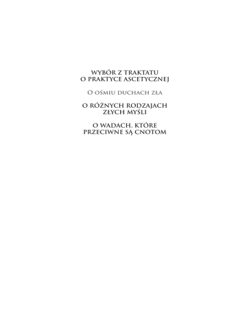 WYBÓR Z TRAKTATU O PRAKTYCE ASCETYCZNEJ O ośmiu duchach zła O RÓŻNYCH RODZAJACH ZŁYCH MYŚLI O WADACH, KTÓRE PRZECIWNE SĄ CNOTOM Ewagriusz z Pontu WYBÓR Z TRAKTATU O PRAKTYCE ASCETYCZNEJ O ośmiu duchach zła O RÓŻNYCH RODZAJACH ZŁYCH MYŚLI O WADACH, KTÓRE PRZECIWNE SĄ CNOTOM Przekład Emilia Kędziorek o. Leon Nieścior OMI Marek Grzelak Projekt okładki: Jacek Zelek Redakcja: Szymon Hiżycki OSB Imprimi potest: Opactwo Benedyktynów L.dz. 184/2015, Tyniec, dnia 27.11.2015 † o. Szymon Hiżycki OSB, opat tyniecki Wydanie pierwsze: Kraków 2015 ISBN 978-83-7354-590-8 © Copyright by TYNIEC Wydawnictwo Benedyktynów ul. Benedyktyńska 37, 30-398 Kraków tel. +48 (12) 688-52-90, tel./fax: +48 (12) 688-52-95 e-mail: [email protected] [email protected] www.tyniec.com.pl Druk i oprawa: TYNIEC Wydawnictwo Benedyktynów [email protected] S Złe myśli według Ewagriusza. Wprowadzenie . . 1. Ewagriusz – biografia . . . . . . . . . 2. Zarys nauki . . . . . . . . . . . . 2. Kilka słów o tekstach zawartych w antologii . . . . . 7 . 8 . 8 . 15 Skróty . . . . . . . . . . . . . . . . . . . 19 Bibliografia . . . . . . . . . . . . . . . . . 21 Wybór z traktatu O praktyce [ascetycznej] (przekł. E. Kędziorek) . . . . . . . . . . . . . 23 O ośmiu [złych] myślach . . . . . . . . . . . 25 Przeciwko ośmiu [złym] myślom . . . . . . . 30 O ośmiu duchach zła (przekł. L. Nieścior OMI) O ośmiu duchach zła O obżarstwie . . . O nieczystości . . . O chciwości . . . O gniewie . . . . O smutku . . . . O acedii . . . . . O próżności . . . O pysze . . . . . . . . . . . . . . . . . . . . . . . . . 5 . . . . . . . . . . . . . . . . . . . . . . . . . . . . . . . . . . . . . . . . . . . . . . . . . . . . . . . . . . . . . . . . . . . . . . . . . . . . . . . . . . . . . . . . . . . 37 . 39 . 41 . 45 . 50 . 52 . 55 . 58 . 60 . 63 O różnych rodzajach złych myśli (przekł. L. Nieścior OMI) . . . . . . . . . Porządek następowania złych myśli . . . . O snach . . . . . . . . . . . . . . O gniewie i niepokoju . . . . . . . . . O różnych rodzajach myśli . . . . . . . Demon tułacz . . . . . . . . . . . . Demon prowadzący do nieczułości . . . . O smutku . . . . . . . . . . . . . O gniewie . . . . . . . . . . . . . O próżnej chwale . . . . . . . . . . O początku beznamiętności i próżnej chwale O Pożądliwości . . . . . . . . . . . Człowiek jak pasterz . . . . . . . . . Dwa rodzaje demonów . . . . . . . . O walce ze złymi myślami . . . . . . . Skutki trwania złych myśli . . . . . . . Warunki życia chrześcijańskiego . . . . . O konieczności roztropności w ascezie . . O konieczności wyrzeczenia . . . . . . O wyobrażeniach . . . . . . . . . . Uzupełnienie . . . . . . . . . . . . . . . . . . . . . . . . . . . . . . . . . . . . . . . . . . . . . . . . . . . . . . . 69 . 71 . 76 . 77 . 81 . 84 . 87 . 89 . 91 . 92 . 93 . 94 . 96 . 98 . 99 104 105 122 127 128 132 O wadach, które przeciwne są cnotom (przekł. M. Grzelak) . . . . . . . . . . . . . 133 Z E. W Dla wielu z nas życie religijne ogranicza się w dużej mierze do moralności i kategoria grzechu odgrywa dużą rolę w naszej wrażliwości i naszej pobożności. Typowe pytania, które w tym kontekście się pojawiają, można by streścić następująco: czy to już grzech, czy jeszcze nie? Czy Bóg mi przebaczył? Jak mam poprawić się z tego grzechu? Moja spowiedź nic mi nie daje, bo ciągle grzeszę tak samo! Pewien autor może nam pomóc spojrzeć na to wszystko z trochę innej strony. Są bowiem ciekawsze i bardziej do Boga przybliżające pytania niż to, które wyznaczy nam bezpiecznie granicę dokąd mogę się posunąć i „gdzie jeszcze nie ma grzechu”. Tym autorem jest Ewagriusz z Pontu. 7 Z E.W . E – Życie Ewagriusza znamy dość dobrze dzięki licznym przekazom źródłowym. W wielu publikacjach, także naszego wydawnictwa, wielokrotnie było ono prezentowane, dlatego tutaj ograniczymy się do przypomnienia najważniejszych faktów1. Urodził się około 345 r. na terenie dzisiejszej północnej Turcji. Pobierał nauki u największych teologów swych czasów: św. Bazylego Wielkiego, św. Grzegorza z Nazjanzu i św. Grzegorza z Nyssy. Przez jakiś czas pełnił funkcję diakona w Konstantynopolu, potem wyjechał do klasztoru w Jerozolimie. Ostatnie kilkanaście lat życia spędził na pustyni egipskiej w dwóch osadach mniszych – Nitrii i Celach – gdzie poddał się kierownictwu Makarego Wielkiego i Makarego Aleksandryjskiego. Zmarł w Epifanię 399 r. . Z Na samym początku trzeba zwrócić uwagę na pewne niebezpieczeństwo w odczytywaniu nauki Pontyjczyka. Mianowicie dość łatwo zapomnieć, że tak dzisiaj popularna nauka o złych myślach (albo o duchach zła) jest zaledwie cząstką dok1 Zob. np. fragment wstępu L. Nieściora: ŹrMon 18, s. 11–24. Z E.W tryny Ewagriusza, powiedzmy precyzyjniej: wstępem do olbrzymiego gmachu, który nasz mnich zbudował. Dwa etapy Nasz autor opisywał dzieje życia wewnętrznego według następującego schematu. Zadaniem człowieka jest powrót do Boga. Znajdujemy się na tej ziemi z powodu upadku, który z naszej winy miał miejsce przed stworzeniem świata. Człowiek, aby móc powrócić do swego Stwórcy musi przejść przez dwa etapy. Pierwszym z nich jest oczyszczenie ze złych myśli i z wad oraz nabycie na ich miejsce cnót. Ten okres życia Ewagriusz określa mianem praktike – etapu praktycznego (praktyki ascetycznej). Etap drugi, dostępny dla tych, którzy uwolnili się od łudzących ich wad i myśli, to poznawanie świata stworzonego i ostatecznie samego Boga w Trójcy Jedynego. Pontyjczyk określa go mianem etapu gnostycznego (gnostike). Nietrudno się domyślić, że ów drugi moment ma znaczenie kluczowe. Nie byłoby jednak czymś słusznym uznanie, że te dwa etapy następują po sobie kolejno. Trudno dopatrzeć się ścisłej cezury pomiędzy praktykiem a gnostykiem. Poprawniej byłoby powiedzieć, że człowiek o tyle p