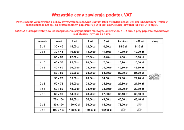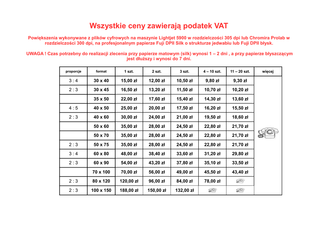 Wszystkie ceny zawierają podatek VAT Powiększenia wykonywane z plików cyfrowych na maszynie Lightjet 5900 w rozdzielczości 305 dpi lub Chromira Prolab w rozdzielczości 300 dpi, na profesjonalnym papierze Fuji DPII Silk o strukturze jedwabiu lub Fuji DPII błysk. UWAGA ! Czas potrzebny do realizacji zlecenia przy papierze matowym (silk) wynosi 1 – 2 dni , a przy papierze błyszczącym jest dłuższy i wynosi do 7 dni. proporcje format 1 szt. 2 szt. 3 szt. 4 – 10 szt. 11 – 20 szt. 3:4 30 x 40 15,00 zł 12,00 zł 10,50 zł 9,80 zł 9,30 zł 2:3 30 x 45 16,50 zł 13,20 zł 11,50 zł 10,70 zł 10,20 zł 35 x 50 22,00 zł 17,60 zł 15,40 zł 14,30 zł 13,60 zł 4:5 40 x 50 25,00 zł 20,00 zł 17,50 zł 16,20 zł 15,50 zł 2:3 40 x 60 30,00 zł 24,00 zł 21,00 zł 19,50 zł 18,60 zł 50 x 60 35,00 zł 28,00 zł 24,50 zł 22,80 zł 21,70 zł 50 x 70 35,00 zł 28,00 zł 24,50 zł 22,80 zł 21,70 zł 2:3 50 x 75 35,00 zł 28,00 zł 24,50 zł 22,80 zł 21,70 zł 3:4 60 x 80 48,00 zł 38,40 zł 33,60 zł 31,20 zł 29,80 zł 2:3 60 x 90 54,00 zł 43,20 zł 37,80 zł 35,10 zł 33,50 zł 70 x 100 70,00 zł 56,00 zł 49,00 zł 45,50 zł 43,40 zł 2:3 80 x 120 120,00 zł 96,00 zł 84,00 zł 78,00 zł 2:3 100 x 150 188,00 zł 150,00 zł 132,00 zł więcej 4 – 10 szt. 11 – 20 szt. 8,40 zł 7,80 zł 7,50 zł 25,60 zł 22,40 zł 20,80 zł 19,90 zł 45,00 zł 36,00 zł 31,50 zł 29,30 zł 27,90 zł 70 x 70 61,00 zł 48,80 zł 42,70 zł 39,70 zł 37,80 zł kwadrat 127 x 127 200,00 zł 160,00 zł 140,00 zł 130,00 zł panorama 30 x 60 22,50 zł 18,00 zł 15,80 zł 14,60 zł 14,00 zł panorama 30 x 90 33,80 zł 27,00 zł 23,70 zł 22,00 zł 21,00 zł panorama 50 x 100 50,00 zł 40,00 zł 35,00 zł 32,50 zł panorama 50 x 150 75,00 zł 60,00 zł 52,50 zł 48,80 zł panorama 60 x 120 72,00 zł 57,60 zł 50,40 zł panorama 60 x 180 108,00 zł 86,40 zł 75,60 zł panorama 70 x 140 98,00 zł 78,40 zł 68,60 zł panorama 70 x 200 140,00 zł 112,00 zł 98,00 zł proporcje format 1 szt. 2 szt. 3 szt. 2:3 120 x 180 270,00 zł 216,00 zł 189,00 zł 124 x 245 380,00 zł 304,00 zł 266,00 zł kwadrat 30 x 30 12,00 zł 9,60 zł kwadrat 50 x 50 32,00 zł kwadrat 60 x 60 kwadrat więcej