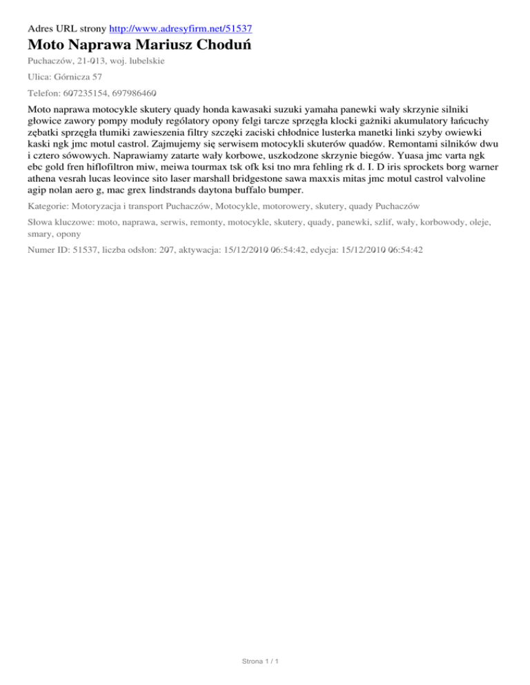 Moto Naprawa Mariusz Chodun, Puchaczow, Gornicza
