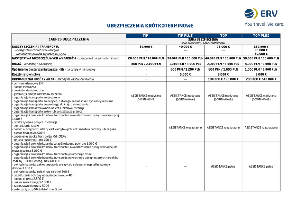 UBEZPIECZENIA KRÓTKOTERMINOWE ZAKRES UBEZPIECZENIA KOSZTY LECZENIA I TRANSPORTU - następstwa chorób przewlekłych - uprawianie sportów wysokiego ryzyka NASTĘPSTWA NIESZCZĘŚLIWYCH WYPADKÓW - uszczerbek na zdrowiu / śmierć BAGAŻ - na osobę / na rodzinę TIP TIP PLUS TOP TOP PLUS SUMA UBEZPIECZENIA 20.000 € ----20.000 PLN / 10.000 PLN oraz górne limity odpowiedzialności 40.000 € 75.000 € --------- 150.000 € 30.000 € 30.000 € 30.000 PLN / 15.000 PLN 40.000 PLN / 20.000 PLN 50.000 PLN / 25.000 PLN 800 PLN / 2.000 PLN 1.200 PLN / 3.000 PLN 2.000 PLN / 5.000 PLN 4.000 PLN / 9.000 PLN Opóźnienie dostarczenia bagażu >5h - na osobę /- na rodzinę --- 600 PLN / 1.200 PLN 800 PLN / 1.600 PLN 1.000 PLN / 2.000 PLN Koszty ratownictwa --- 5.000 € 5.000 € 5.000 € ODPOWIEDZIALNOŚĆ CYWILNA - szkody na osobie / w mieniu - centrum Alarmowe 24h - pomoc medyczna - powiadomienie rodziny - gwarancja pokrycia kosztów leczenia - organizacja transportu medycznego - organizacja transportu do miejsca, z którego podroż może być kontynuowana - organizacja transportu powrotnego do kraju zamieszkania - organizacja zakwaterowania na czas rekonwalescencji - organizacja transportu zwłok lub pogrzebu za granicą - organizacja i pokrycie kosztów transportu i zakwaterowania osoby towarzyszącej 1.000 € - przekazywanie pilnych informacji - dostarczenie leków - pomoc w przypadku utraty kart kredytowych, dokumentów podróży lub bagażu - pomoc finansowa 500 € - opóźnienie środka transportu >5h 200 € - zmiana rezerwacji lotu 150 € - organizacja i pokrycie kosztów wcześniejszego powrotu 1.000 € - organizacja i pokrycie kosztów transportu i zakwaterowania osoby wezwanej do towarzyszenia 2.000 € - organizacja i pokrycie kosztów transportu powrotnego dzieci - organizacja i pokrycie kosztów transportu powrotnego ubezpieczonych członków rodziny 1.000 €/osobę, max 4.000 € - pokrycie kosztów zakwaterowania w szpitalu opiekuna hospitalizowanego dziecka 1.000 € - pokrycie kosztów opieki nad dziećmi 500 € - przedłużenie ochrony ubezpieczeniowej o 48 h - pomoc prawna 2.500 € - pożyczka na kaucję 12.500 € - zastępstwo kierowcy 500€ - auto zastępcze 50 €/dzień max 5 dni --- --- 100.000 € / 20.000 € 200.000 € / 40.000 € ASSISTANCE medyczne (podstawowe) ASSISTANCE medyczne (podstawowe) ASSISTANCE medyczne (podstawowe) ASSISTANCE medyczne (podstawowe) --- ASSISTANCE rozszerzone ASSISTANCE rozszerzone ASSISTANCE rozszerzone --- --- ASSISTANCE pełne ASSISTANCE pełne MOŻLIWE ROZSZERZENIA Sporty wysokiego ryzyka + + + Sporty ekstremalne + + + Zawarte w pakiecie SU: 30.000 € Zawarte w pakiecie SU: 30.000 € --- Sporty wyczynowe + + + --- Pakiet SKI Pakiet SKI Pakiet SKI --- Pakiet SPORT Pakiet SPORT Pakiet SPORT --- Praca fizyczna + + + --- Praca fizyczna o wysokim stopniu ryzyka + + + --- Koszty rezygnacji z podróży SU max 20.000 PLN SU max 20.000 PLN SU max 20.000 PLN SU max 20.000 PLN Koszty rezygnacji z podróży PLUS z rozszerzeniem o następstwa chorób przewlekłych SU max 20.000 PLN SU max 20.000 PLN SU max 20.000 PLN SU max 20.000 PLN Koszty rezygnacji i przerwania podróży SU max 20.000 PLN SU max 20.000 PLN SU max 20.000 PLN SU max 20.000 PLN Koszty rezygnacji i przerwania podróży PLUS z rozszerzeniem o następstwa chorób przewlekłych SU max 20.000 PLN SU max 20.000 PLN SU max 20.000 PLN SU max 20.000 PLN Następstwa chorób przewlekłych - rozszerzenie KL i NNW o następstwa amatorskiego uprawiania narciarstwa - koszty rehabilitacji 5.000 PLN, - ratownictwo 5.000 €, - sprzęt narciarski 4.000 PLN, - opóźnienie dostarczenia sprzętu 800 PLN, - OC "SKI" 20.000 € osobowe/4.000 € w mieniu Assitance ACTIVE: - koszty wypożyczenia sprzętu narciarskiego 105 € (15€/dzień, max 7 dni) - koszty karnetu oraz zajęć w szkółce narciarskiej 250 €, - zamknięcie tras narciarskich 100 € (20 €/dzień, max 5 dni) - rozszerzenie KL i NNW o następstwa uprawiania sportów wysokiego ryzyka - koszty rehabilitacji 5.000 PLN, - ratownictwo 5.000 € - sprzęt sportowy 4.000 PLN - opóźnienie dostarczenia sprzętu 800 PLN, - OC "SPORT" 20.000 € osobowe/4.000 € w mieniu Assitance ACTIVE: - koszty wypożyczenia sprzętu sportowego 105 € (15 €/dzień, max 7 dni) - koszty opłat wpisowych oraz zajęć w szkółce sportowej 125 €, - zamknięcie kąpielisk 100 € (20 €/dzień, max 5 dni) + + Składka: - składka dzienna; minimalny składka za 3 dni, - składka rodzinna – osoby dorosłe podróżujące z dziećmi (max 2 dorosłych + max 4 dzieci do 18 roku życia); nie jest wymagane pokrewieństwo ubezpieczonych, - zakres terytorialny EUROPA/ŚWIAT; Europa – państwa położone na terytorium kontynentu europejskiego, tj. Albania, Andora, Austria, Belgia, Białoruś, Bośnia i Hercegowina, Bułgaria, Chorwacja, Czarnogóra, Czechy, Dania (w tym Wyspy Owcze), Estonia, Finlandia, Francja, Grecja, Hiszpania, Holandia, Irlandia, Islandia, Liechtenstein, Litwa, Luksemburg, Łotwa, Macedonia, Malta, Mołdawia, Monako, Niemcy, Norwegia (w tym archipelag Svalbard i wyspa Jan Mayen), Portugalia (w tym archipelag Azory), Rosja (do Uralu), Rumunia, San Marino, Serbia, Słowacja, Słowenia, Szwajcaria, Szwecja, Ukraina, Watykan, Węgry, Wielka Brytania (w tym wyspy Man, Guernsey, Jersey, Orkady, Szetlandy oraz półwysep Gibraltar), Włochy oraz Wyspy Kanaryjskie (Hiszpania) archipelag Madera (Portugalia), a także państwa pozaeuropejskie położone w basenie Morza Śródziemnego (z wyłączeniem Algierii, Izraela, Jordanii, Libanu, Libii oraz Syrii), tj. Cypr, Egipt, Gruzja, Kazachstan (do Uralu), Maroko, Tunezja, Turcja, - pakiety SKI i SPORT zawierają rozszerzenie KL i NNW o następstwa amatorskiego uprawiania narciarstwa/snowboardu (SKI) lub innych sportów wysokiego ryzyka (SPORT) oraz uzupełniają zakres ubezpieczenia o świadczenia ujęte w tabeli SKi/SPORT oraz o ACTIVE ASSISTANCE; - następstwa chorób przewlekłych (